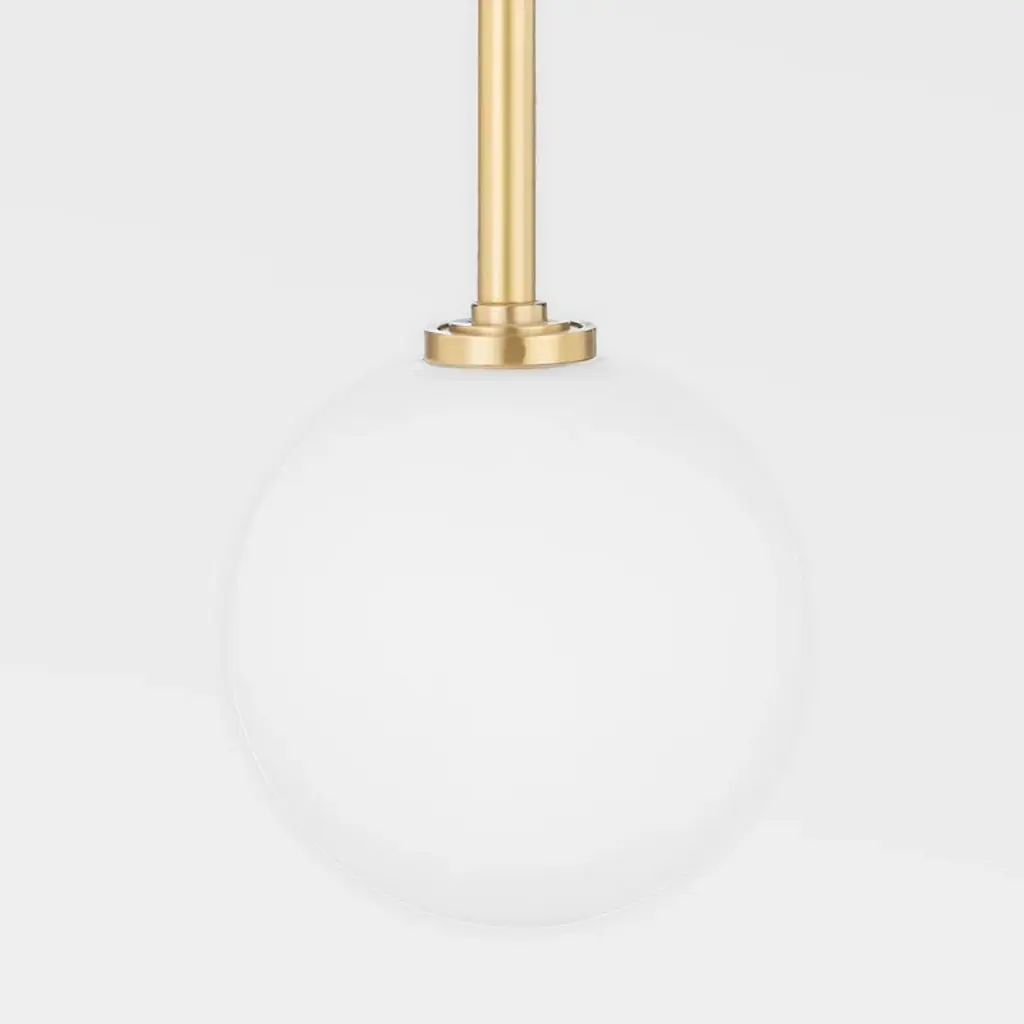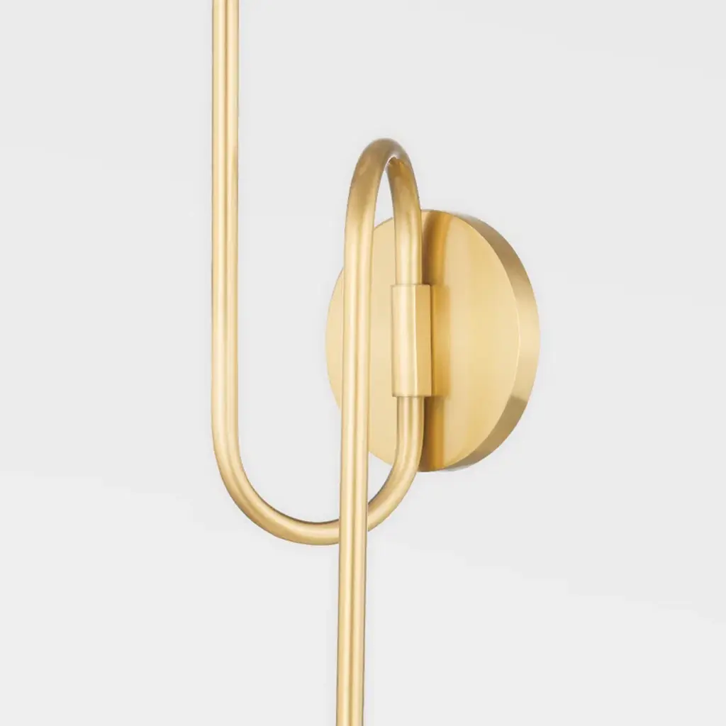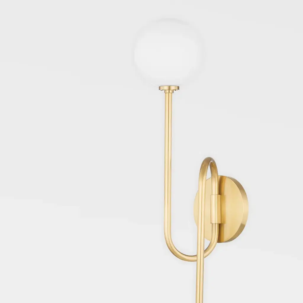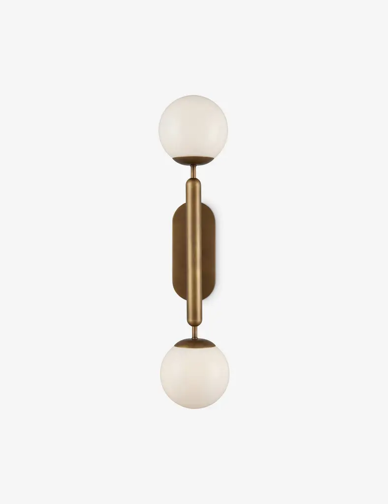 Ready to provide helpful illumination, our 2-light armed sconce is a bold mod-inspired addition. We love the eye-catching sinuousness of the bar that forms an S shape with sockets at either end. Place your choice of bulb and have the white orb shades filter their dimmable glow. The fixture and backplate are crafted from iron with a metallic finish that makes a statement. We love that it's damp-rated, so it's safe for bathroom use.