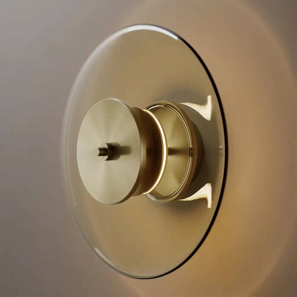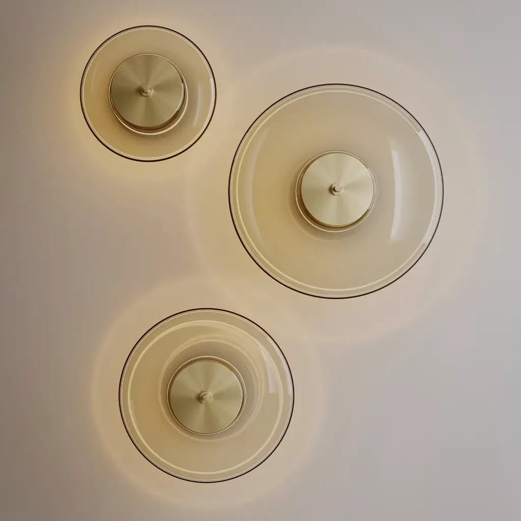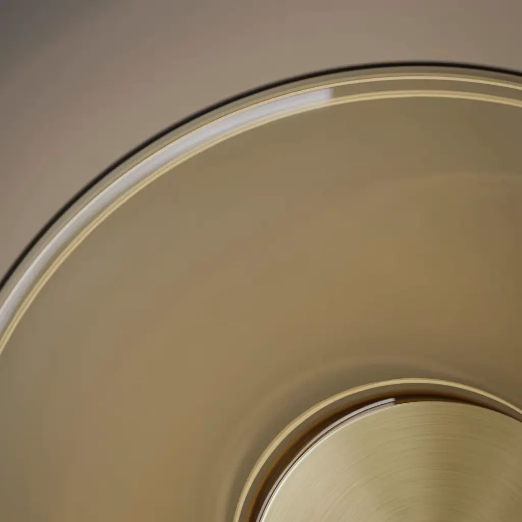 The Zen Wall lamp explores the contrast between tangible and ethereal shapes, creating refined discs of light. Bronze Murano glass diffusers enable dynamic arrangements. The light-burnished brass structure complements and highlights the glass's delicacy. Different sizes and suspended versions are also available.