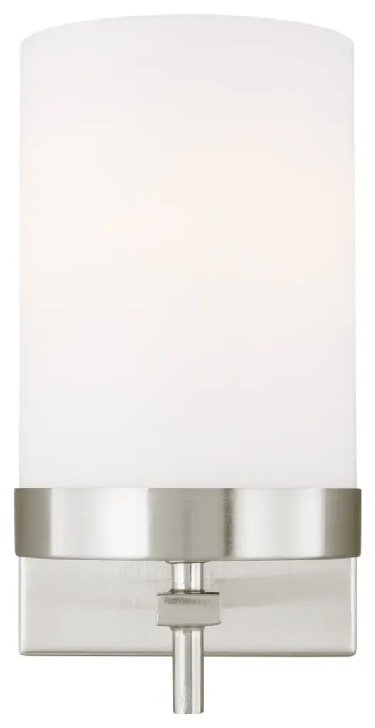 The Generation Lighting Lighting Zire one light wall sconce in brushed nickel offers shadow-free lighting in your powder room, spa, or master bath room. Zire embodies simple clean lines in three finishes that strike a perfect balance of elegant yet minimalist design. Each of the lights sits on the round bottom rim, featuring an Edison-inspired design highlighted by a cylindrical glass shade. The assortment includes nine-light, five-light, and three-light chandeliers, a five light linear, one-light mini-pendant and one-light, two-light, three-light and four-light wall/bath fixtures. A stylish and elegant addition to any room in the house. Zire is offered in a Brushed Oil Rubbed Bronze, Brushed Nickel or Chrome finish.Lighting Information:Bulb type: 1 A19 Medium 75 watt light bulbNumber of bulbs: 1Bulb(s) not includedcETL Listed