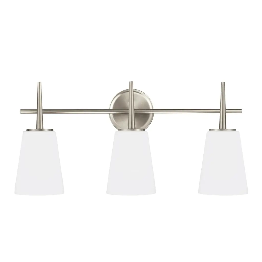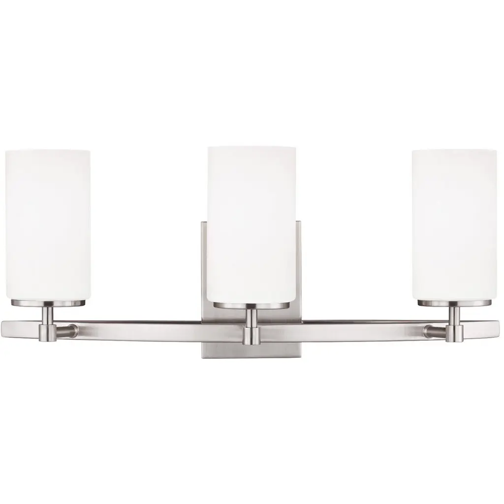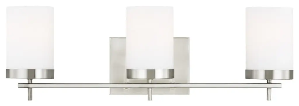 The Generation Lighting Lighting Zire three light vanity fixture in brushed nickel provides abundant light for your bath vanity, while adding a layer of today''s style to your interior design. Zire embodies simple clean lines in three finishes that strike a perfect balance of elegant yet minimalist design. Each of the lights sits on the round bottom rim, featuring an Edison-inspired design highlighted by a cylindrical glass shade. The assortment includes nine-light, five-light, and three-light chandeliers, a five light linear, one-light mini-pendant and one-light, two-light, three-light and four-light wall/bath fixtures. A stylish and elegant addition to any room in the house. Zire is offered in a Brushed Oil Rubbed Bronze, Brushed Nickel or Chrome finish.Lighting Information:Bulb type: 3 A19 Medium 75 watt light bulbsNumber of bulbs: 3Bulb(s) not includedcETL Listed