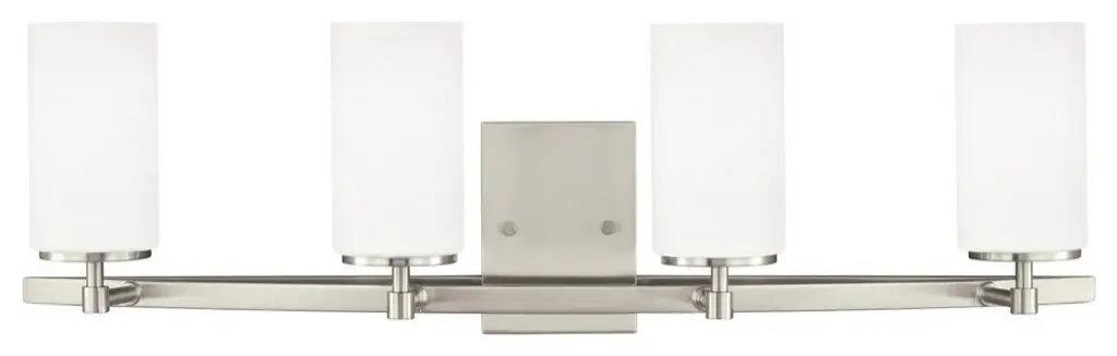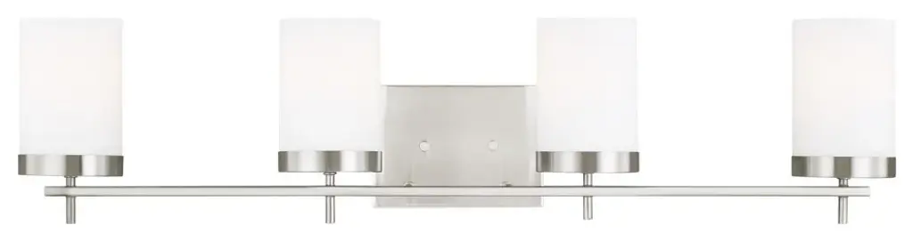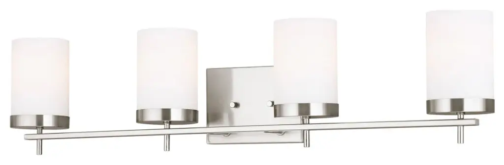 The Generation Lighting Lighting Zire four light vanity fixture in brushed nickel offers shadow-free lighting in your powder room, spa, or master bath room. Zire embodies simple clean lines in three finishes that strike a perfect balance of elegant yet minimalist design. Each of the lights sits on the round bottom rim, featuring an Edison-inspired design highlighted by a cylindrical glass shade. The assortment includes nine-light, five-light, and three-light chandeliers, a five light linear, one-light mini-pendant and one-light, two-light, three-light and four-light wall/bath fixtures. A stylish and elegant addition to any room in the house. Zire is offered in a Brushed Oil Rubbed Bronze, Brushed Nickel or Chrome finish.Lighting Information:Bulb type: 4 A19 Medium 75 watt light bulbsNumber of bulbs: 4Bulb(s) not includedcETL Listed