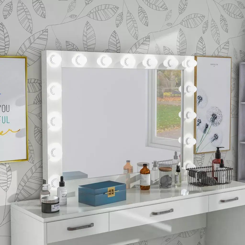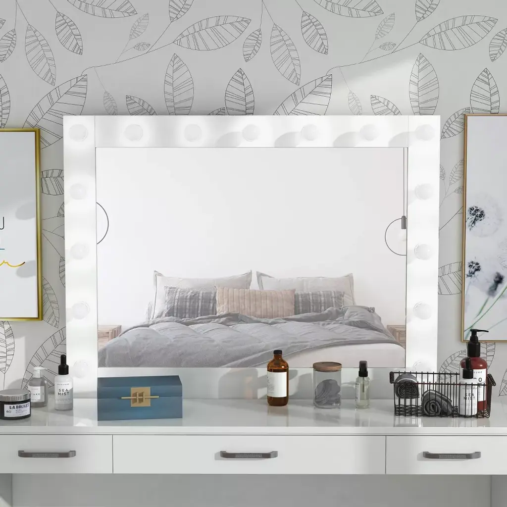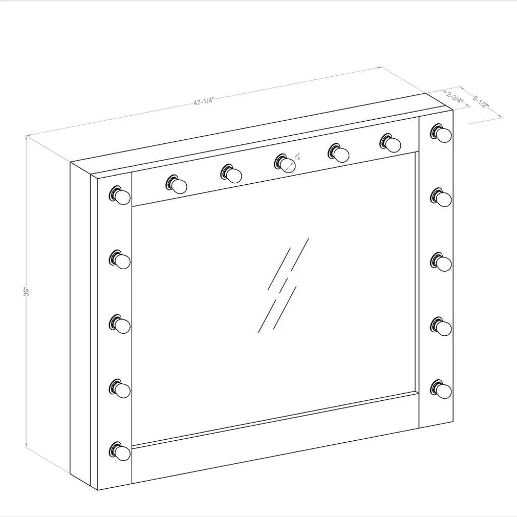 Feel like a celebrity and elevate your dressing table by adding this multi-purpose white wood vanity mirror. Dress up and be glamorous with all-around lights giving you perfect lighting, for your make-up and beauty sessions added a USB port for easy access for charging or additional power supply. A series of bulbs line the edge of the matching mirror, with a six-inch base that can hold small items as you prepare for a night out.Overall height: 36 inches Overall width: 5.5 inches Overall depth: 47.25 inches Frame thickness: 2.75 inches Bulb width: 2 inches