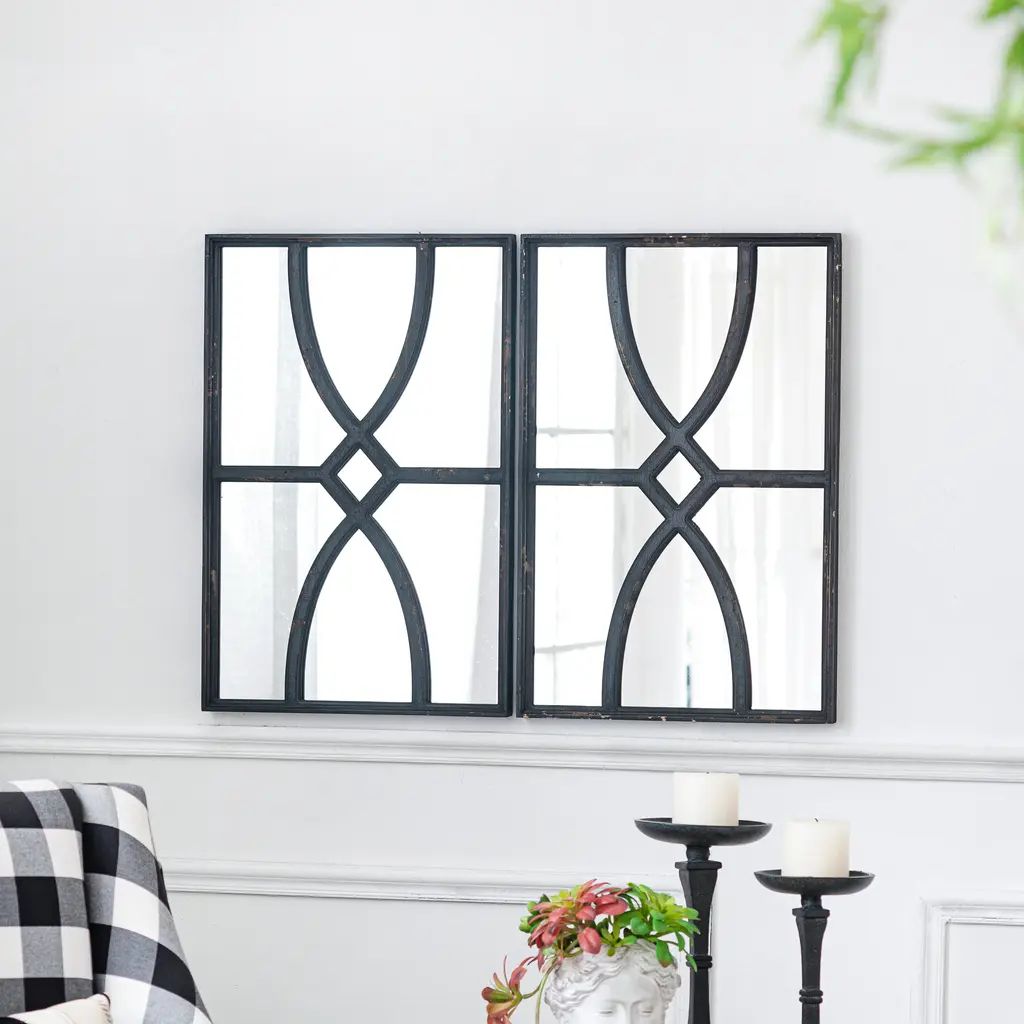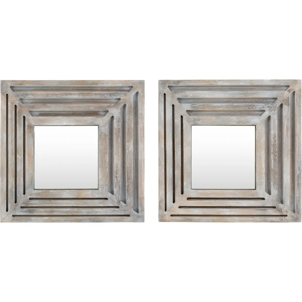 This set of two carved accent mirrors combines Fir wood, MDF, and reflective glass to create a stunning design with intricate curved motifs. Perfect for adding a touch of modern rustic charm, they enhance any entryway, living room, foyer, or bedroom. Display them as a pair or separately to create versatile visual interest. These mirrors are both decorative and functional, capturing attention effortlessly.
