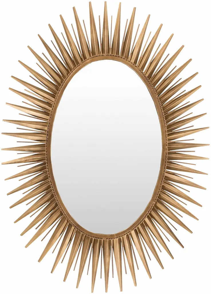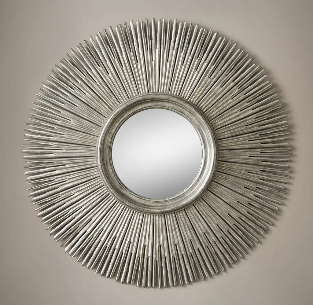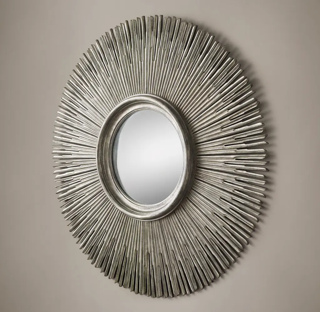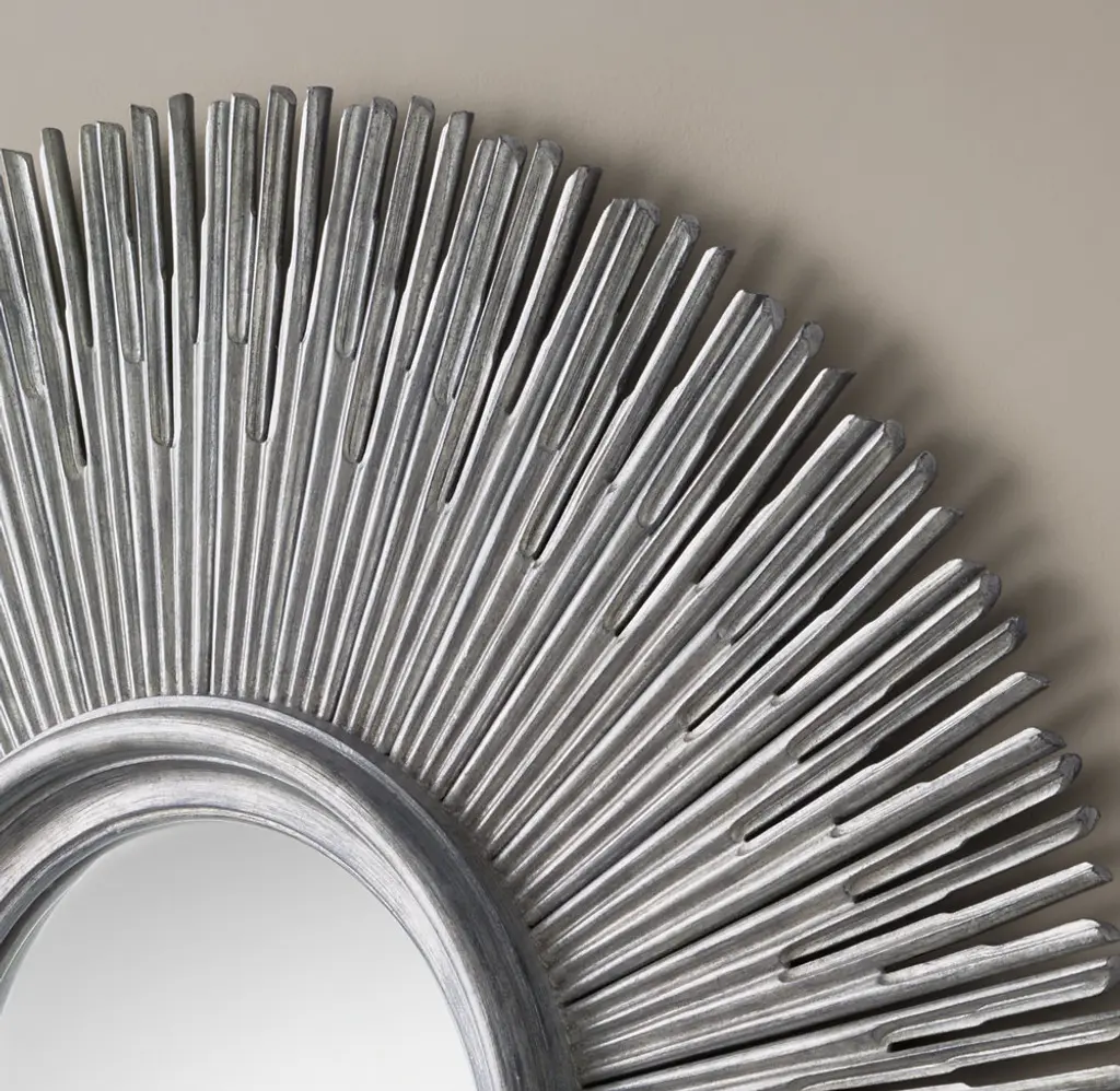 Replicating the ornate splendor of a 17th-century Spanish Colonial reliquary, our mirror is framed with a multitude of carved wood sunburst rays, painted to evoke the vintage luster of aged gold leaf.