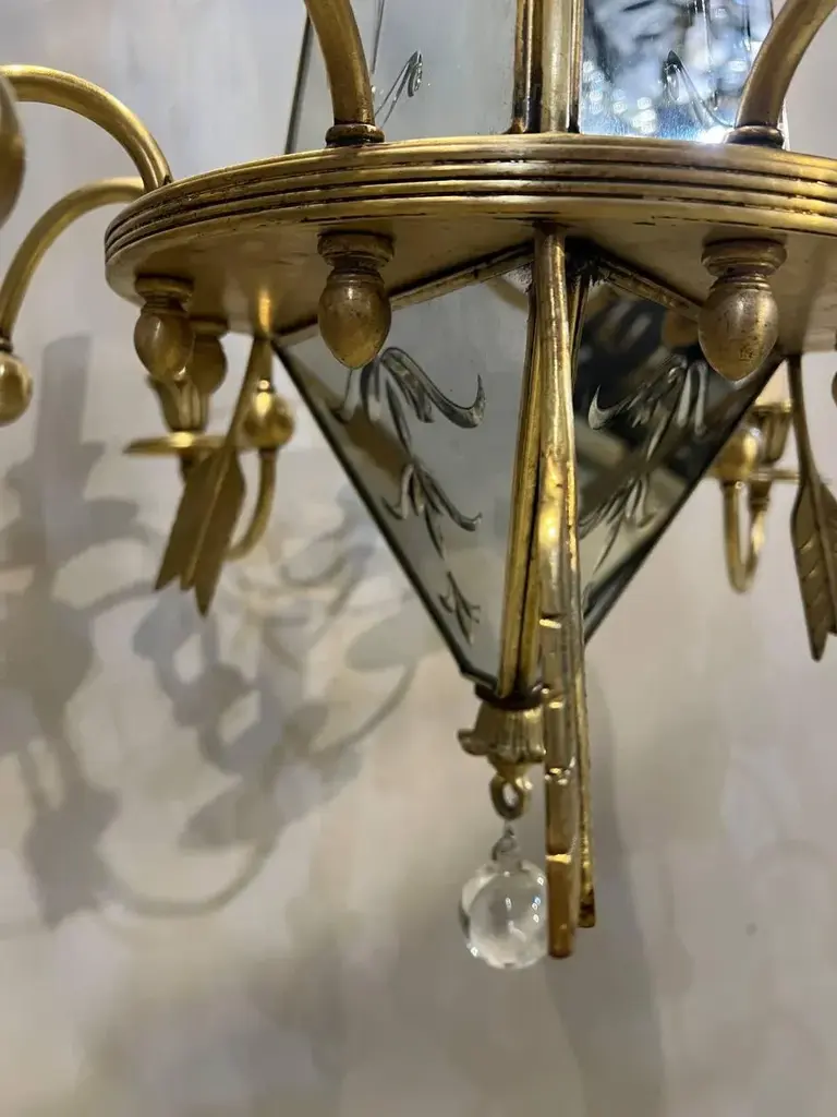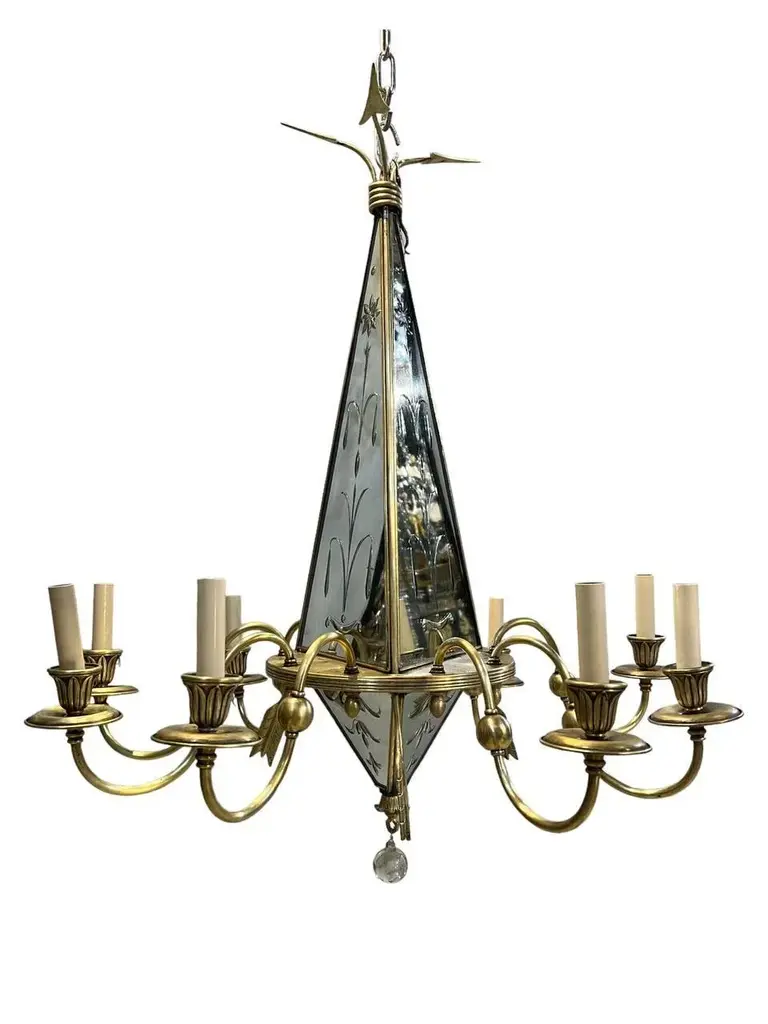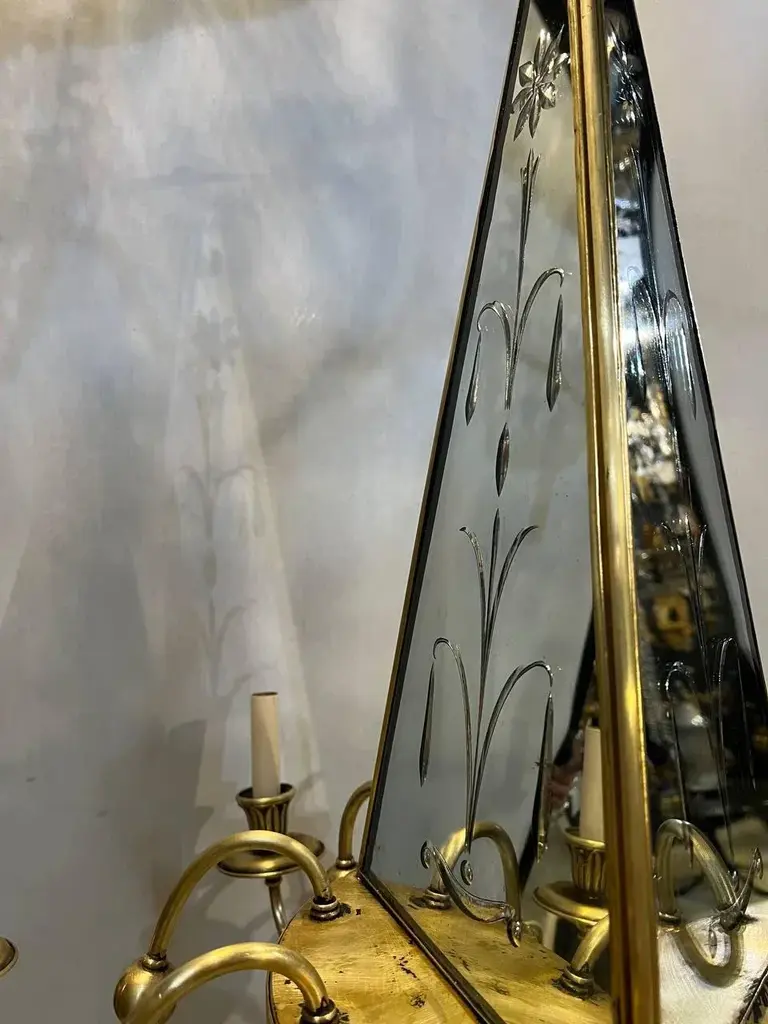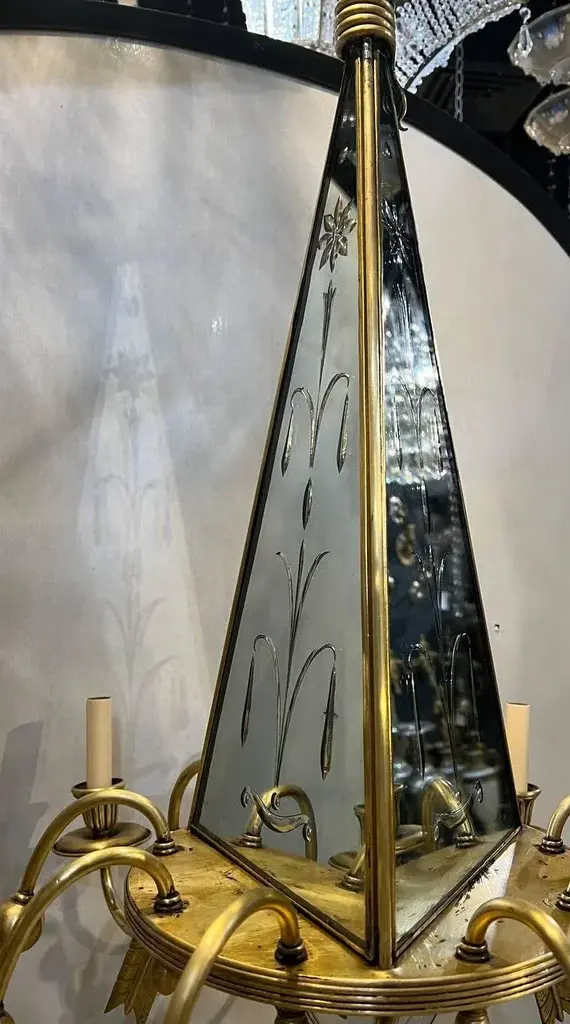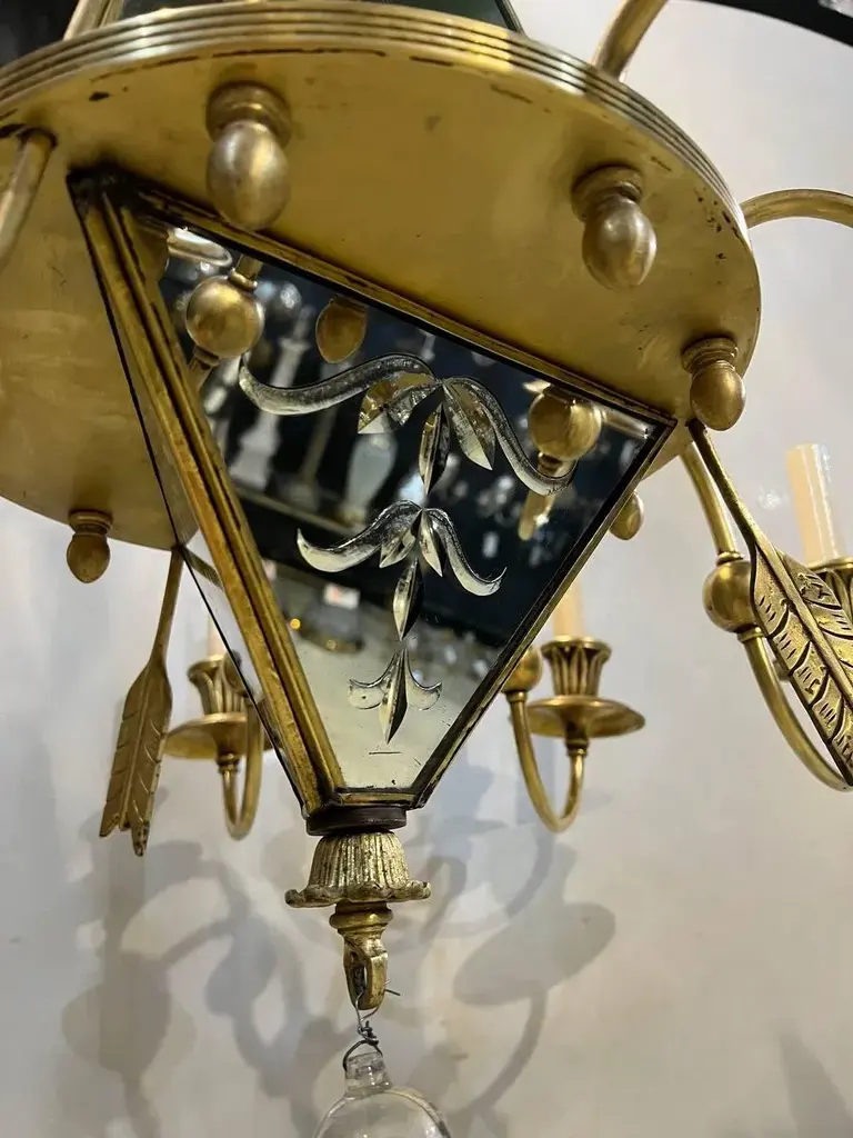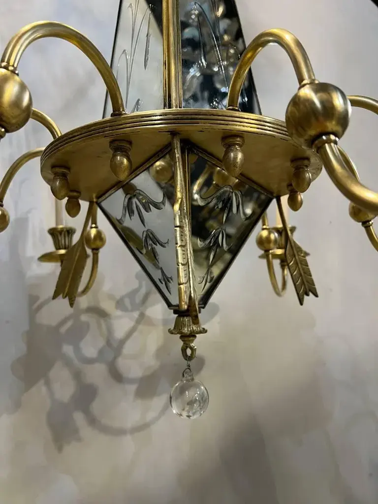 A circa 1930's French Empire style bronze chandelier with etched mirror triangle body. Available 2, price per item