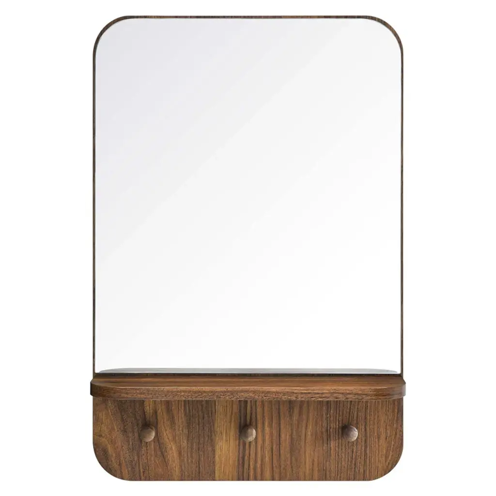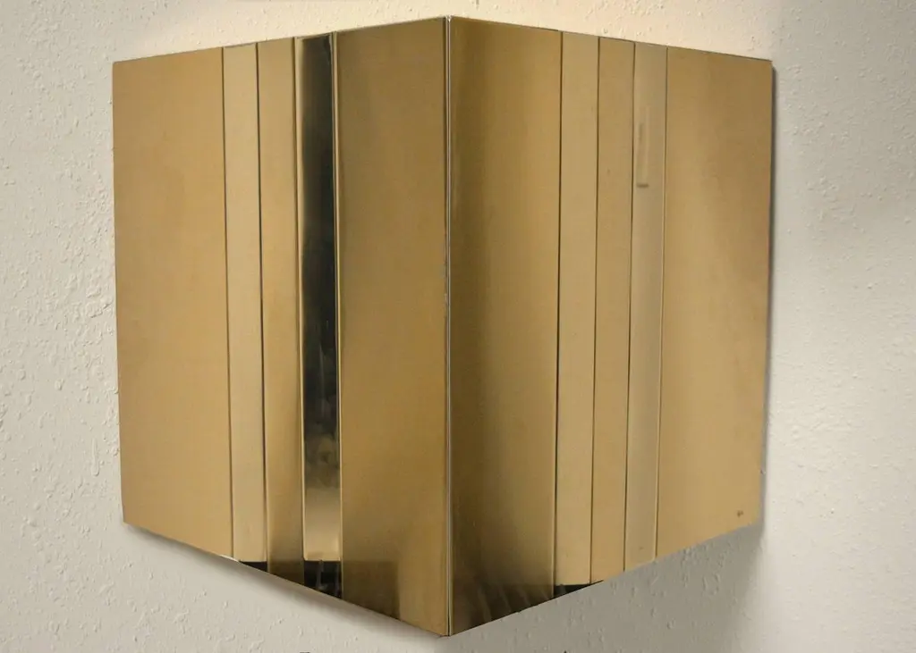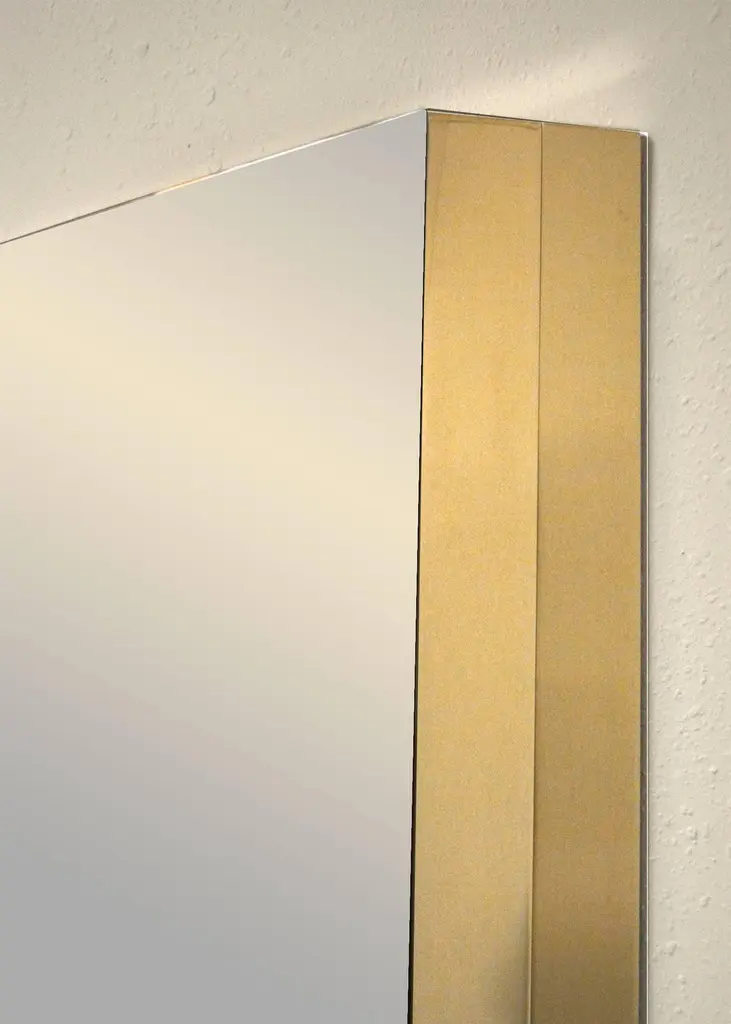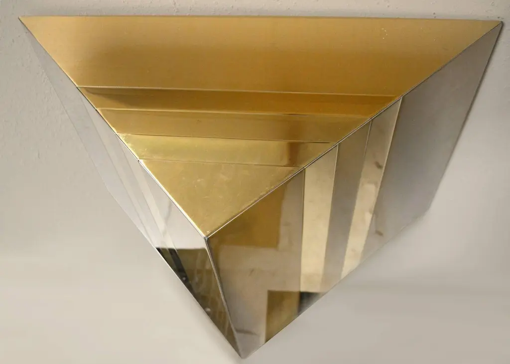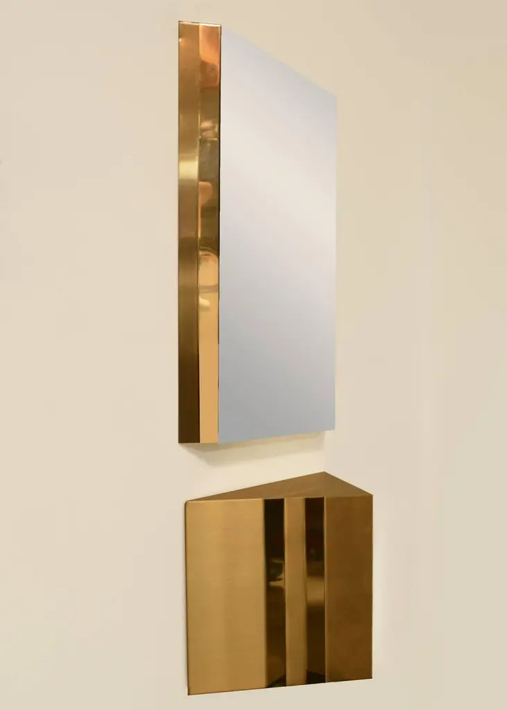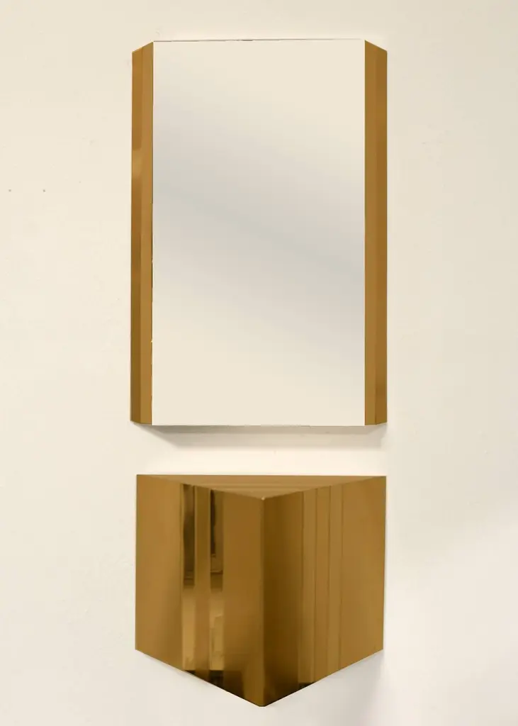 Two tone brass wall hung consoles with matching mirrors. Sold as a set of one console and one mirror. Two sets available. Mirror 36” H x 24” W x 3” DConsole 17” H x 23.5 ” W x 12” D