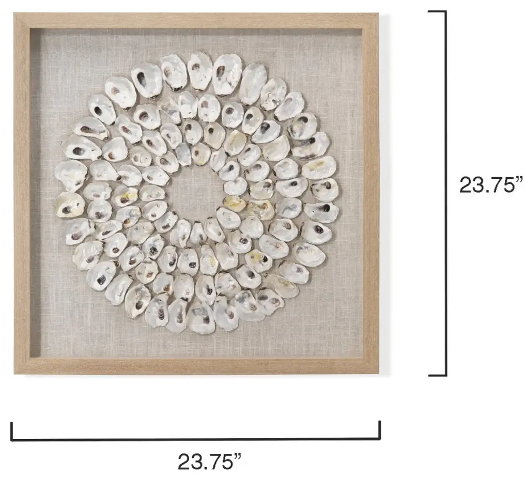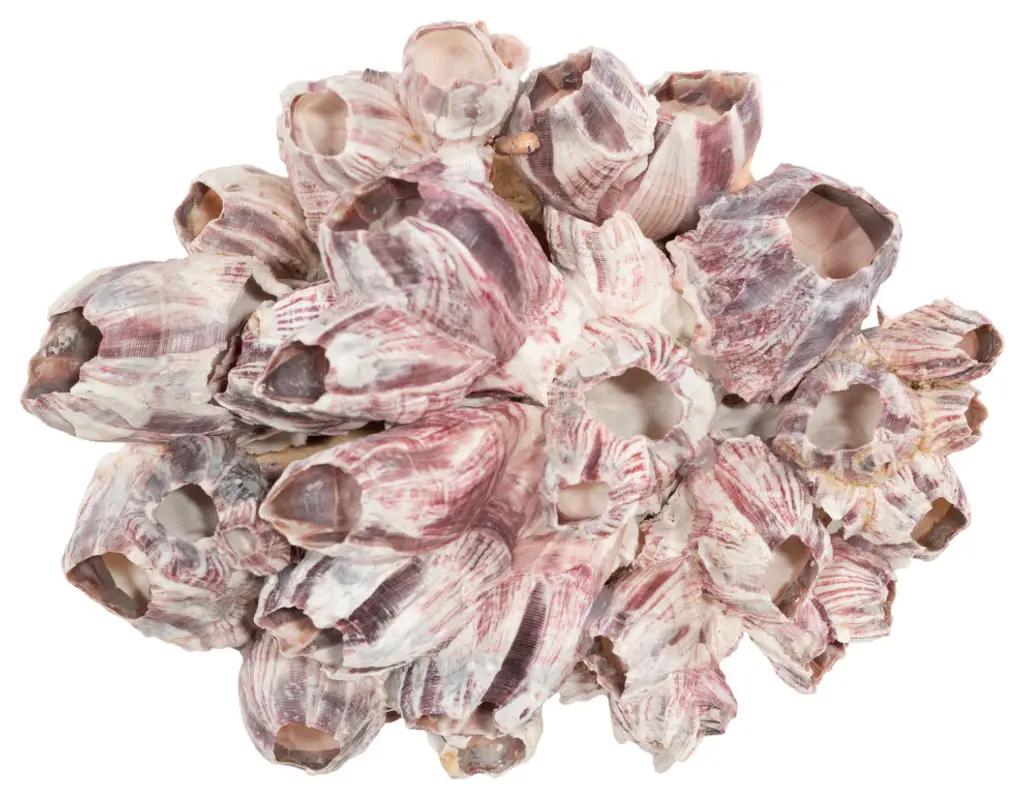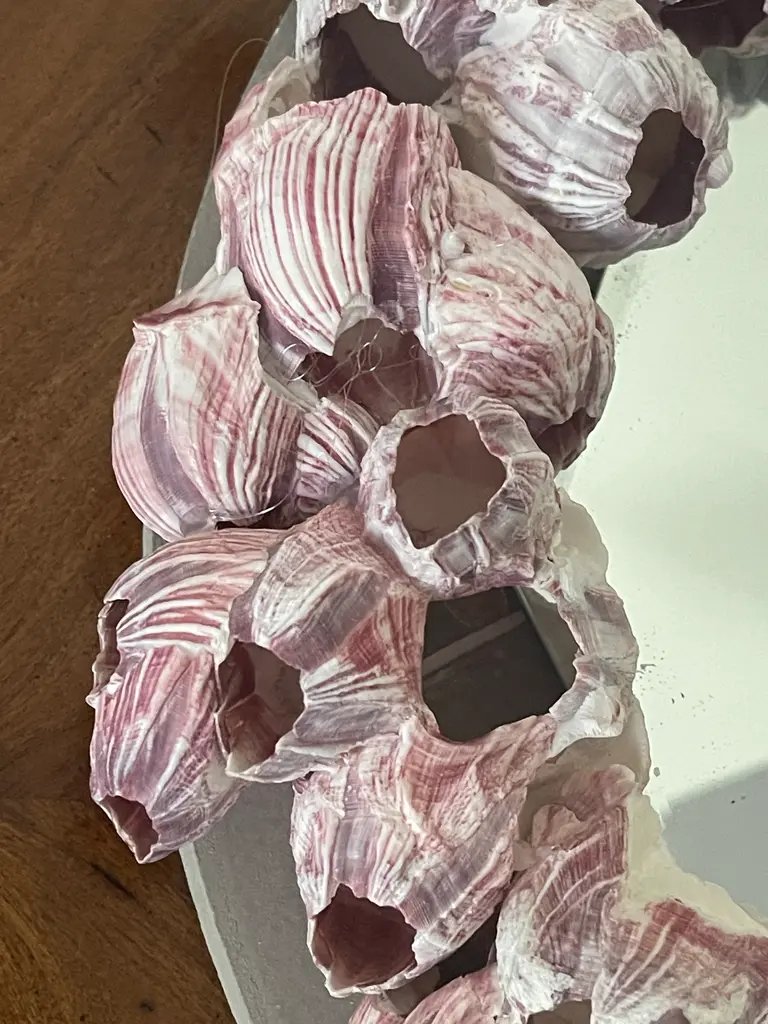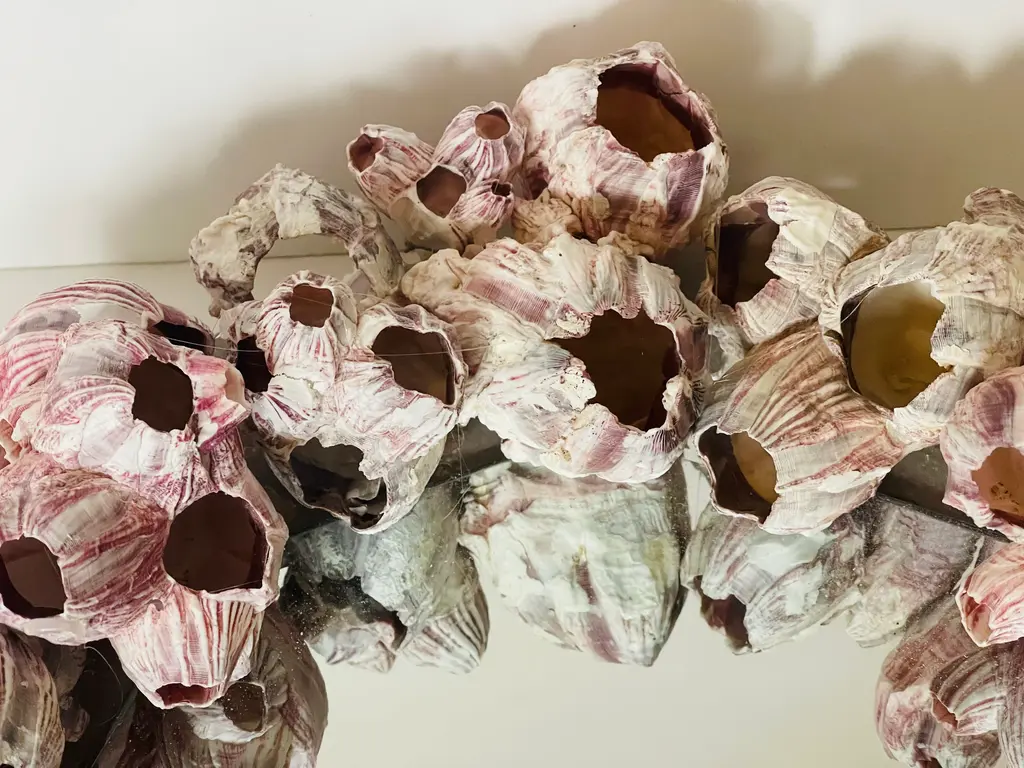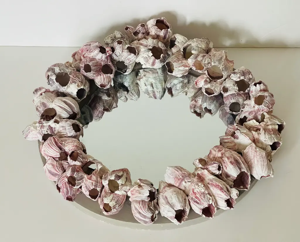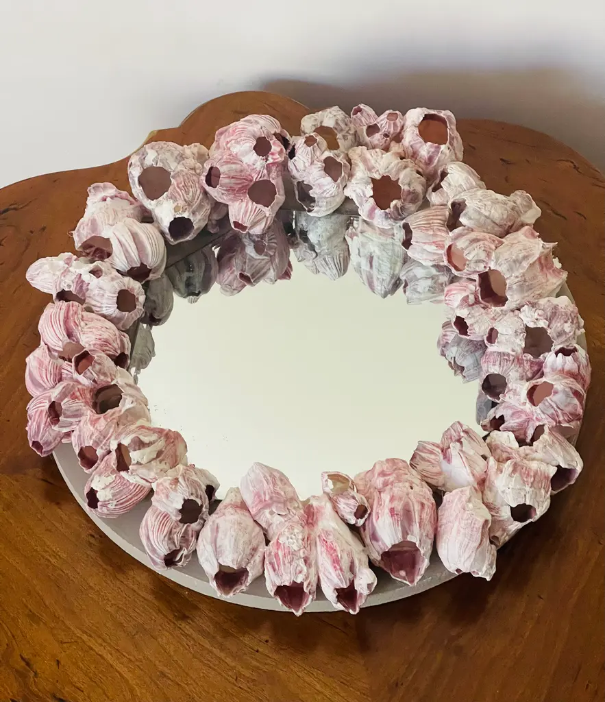 15” Round wall mirror encrusted with large pink barnacles clusters. Organic modern look. Original shape and color of barnacle shells.