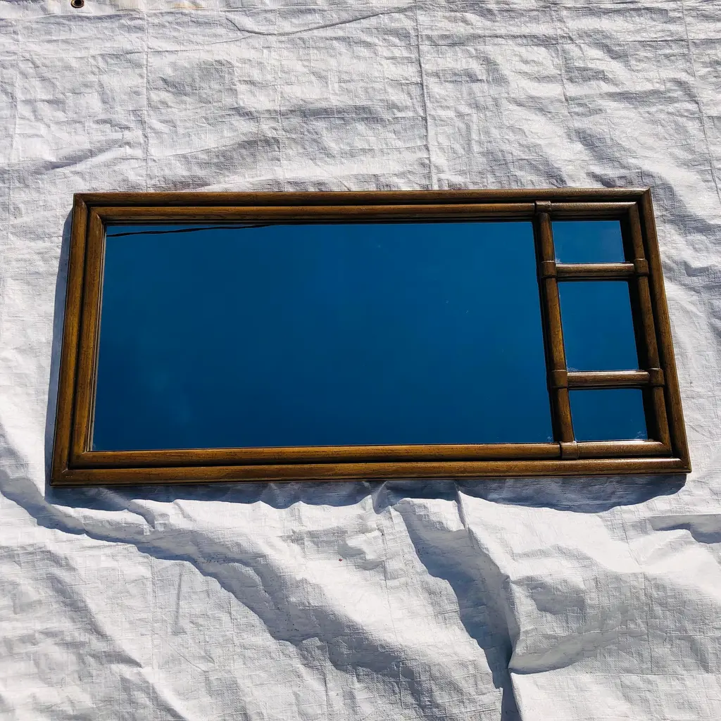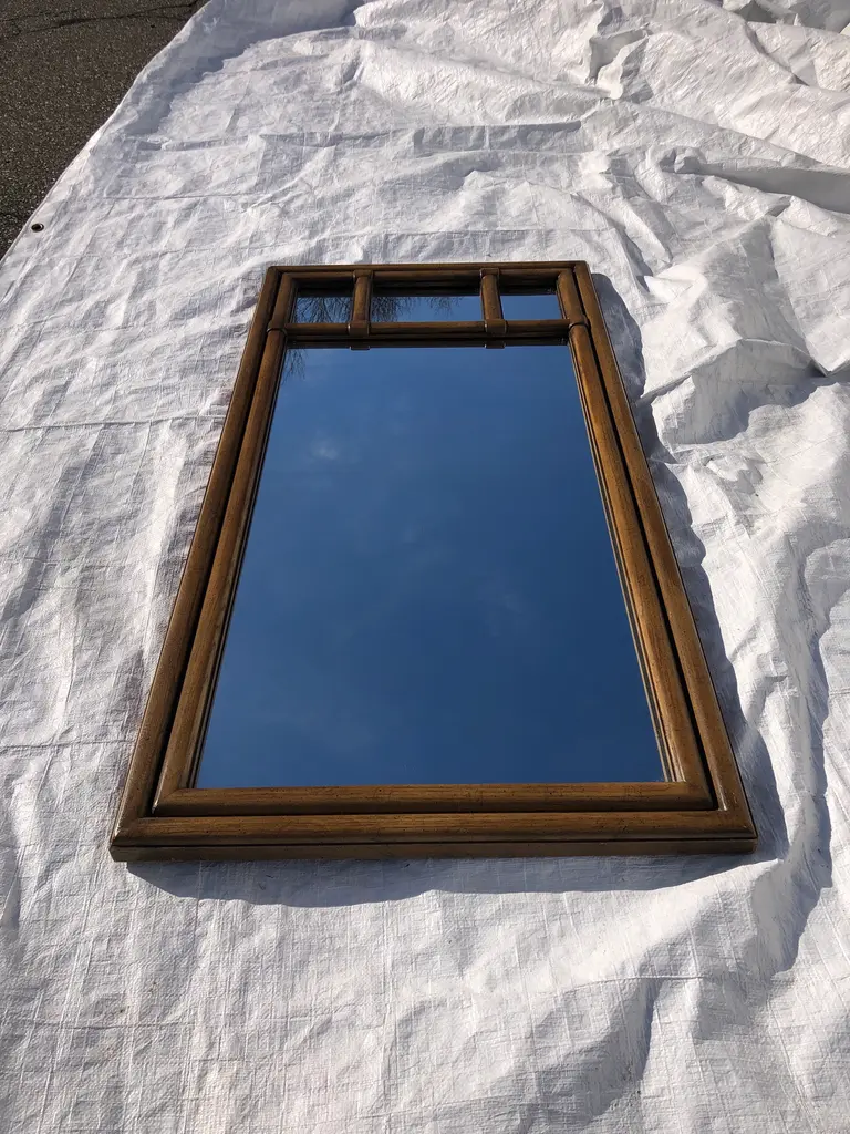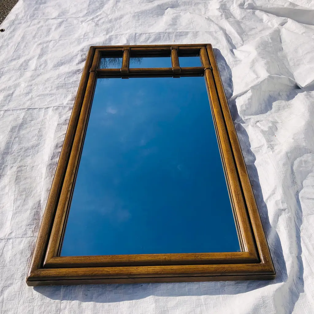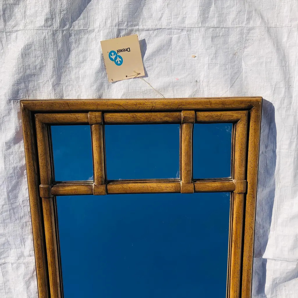 70's Hollywood Recency style solid wood wall mirror 44"H X 22" W X 1.5"D , Makers mark reads " DREXEL Heritage " In excellent condition.