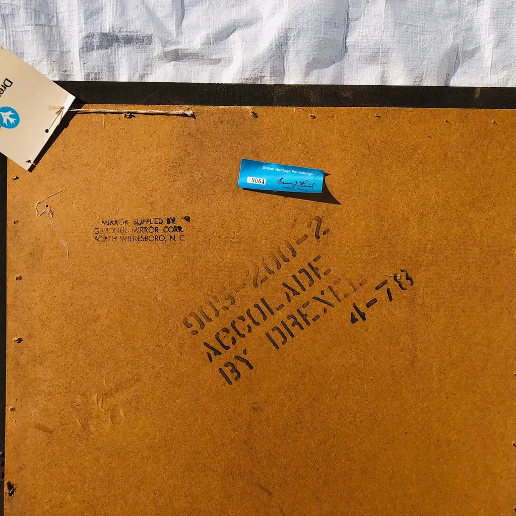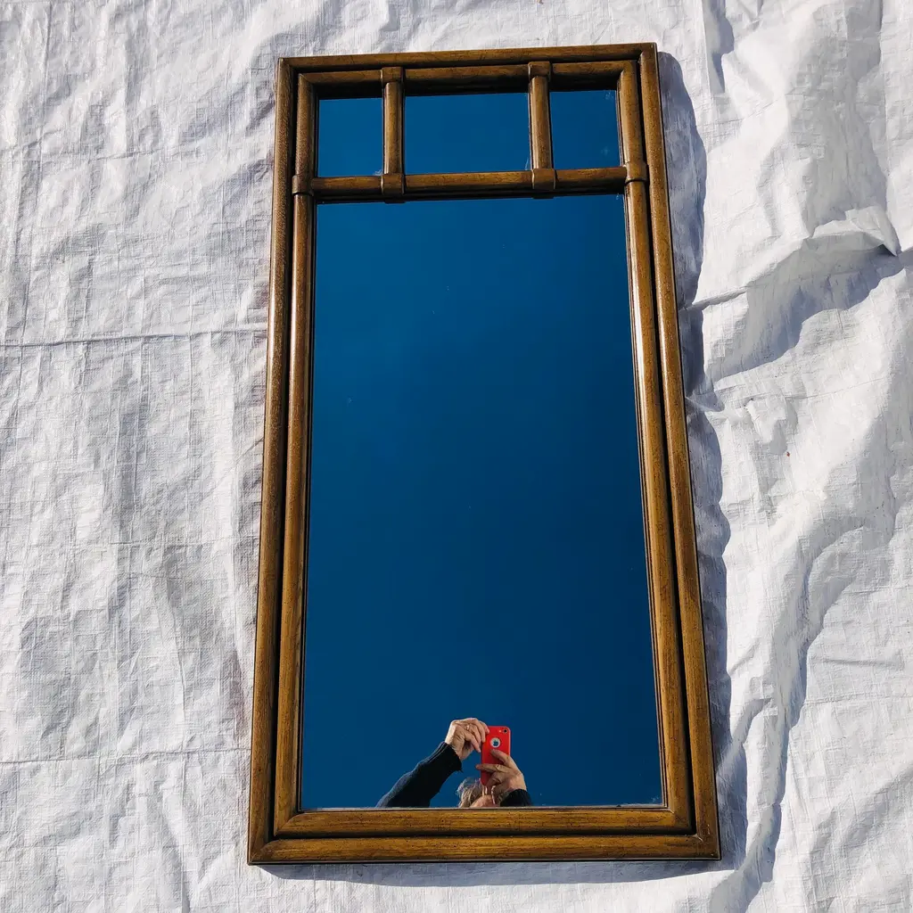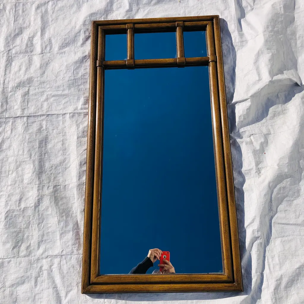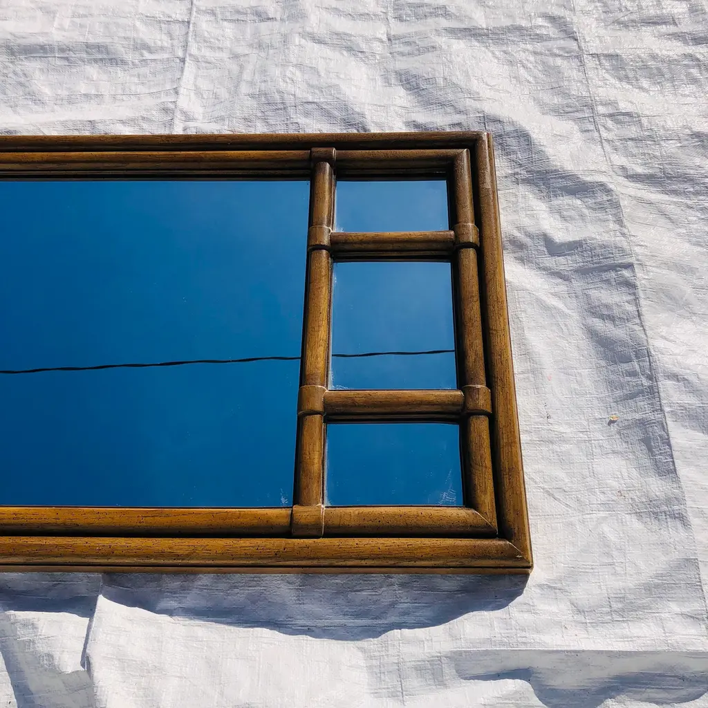 70's Hollywood Recency style solid wood wall mirror 44"H X 22" W X 1.5"D , Makers mark reads " DREXEL Heritage " In excellent condition.