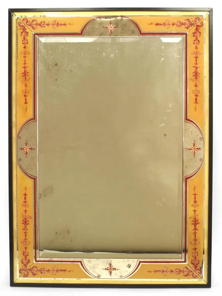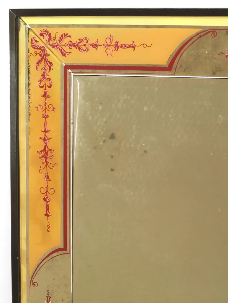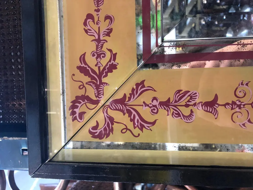 2 Italian Mid-Century rectangular wall mirrors framed with a beige and purple decorated v©glomisv© floral and scroll design border in a black metal frame. (PRICED EACH).
