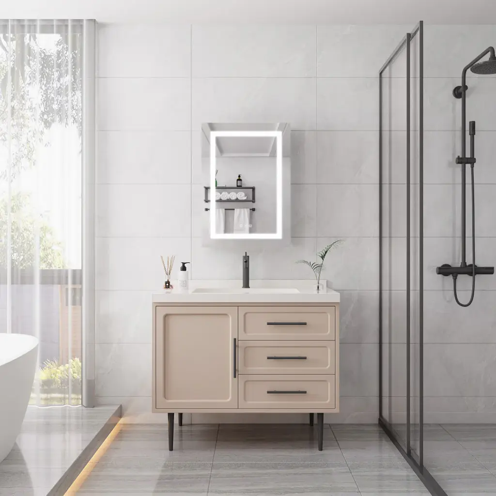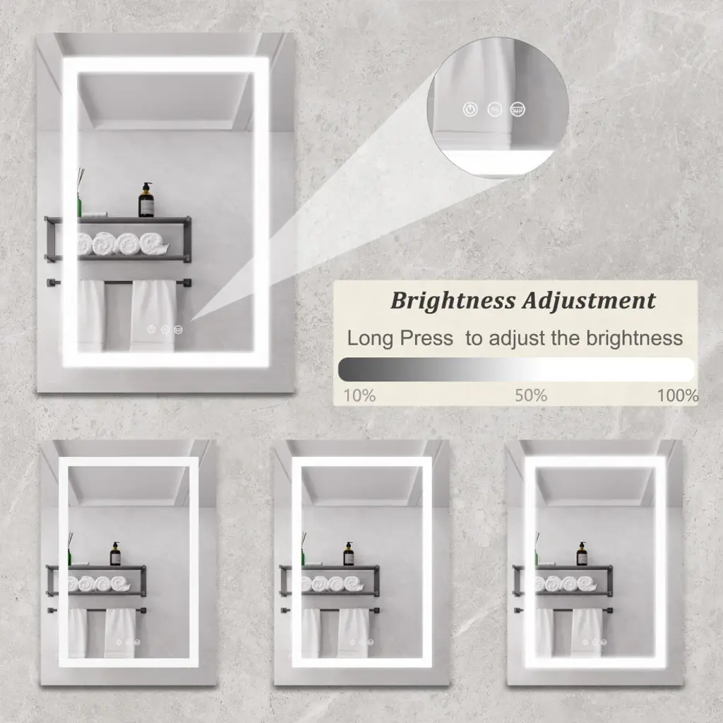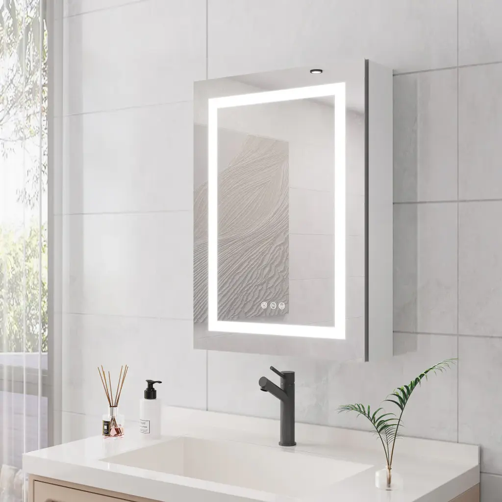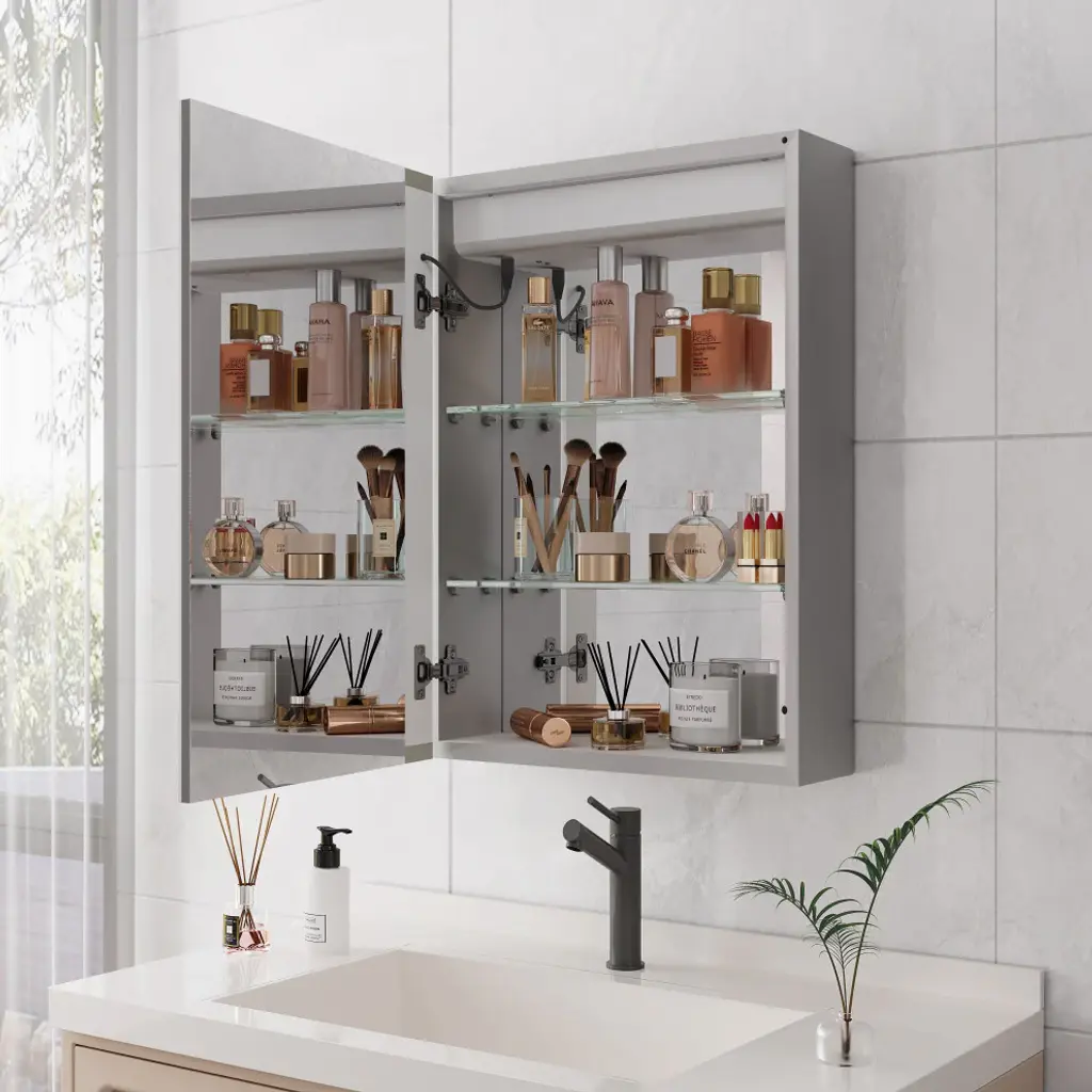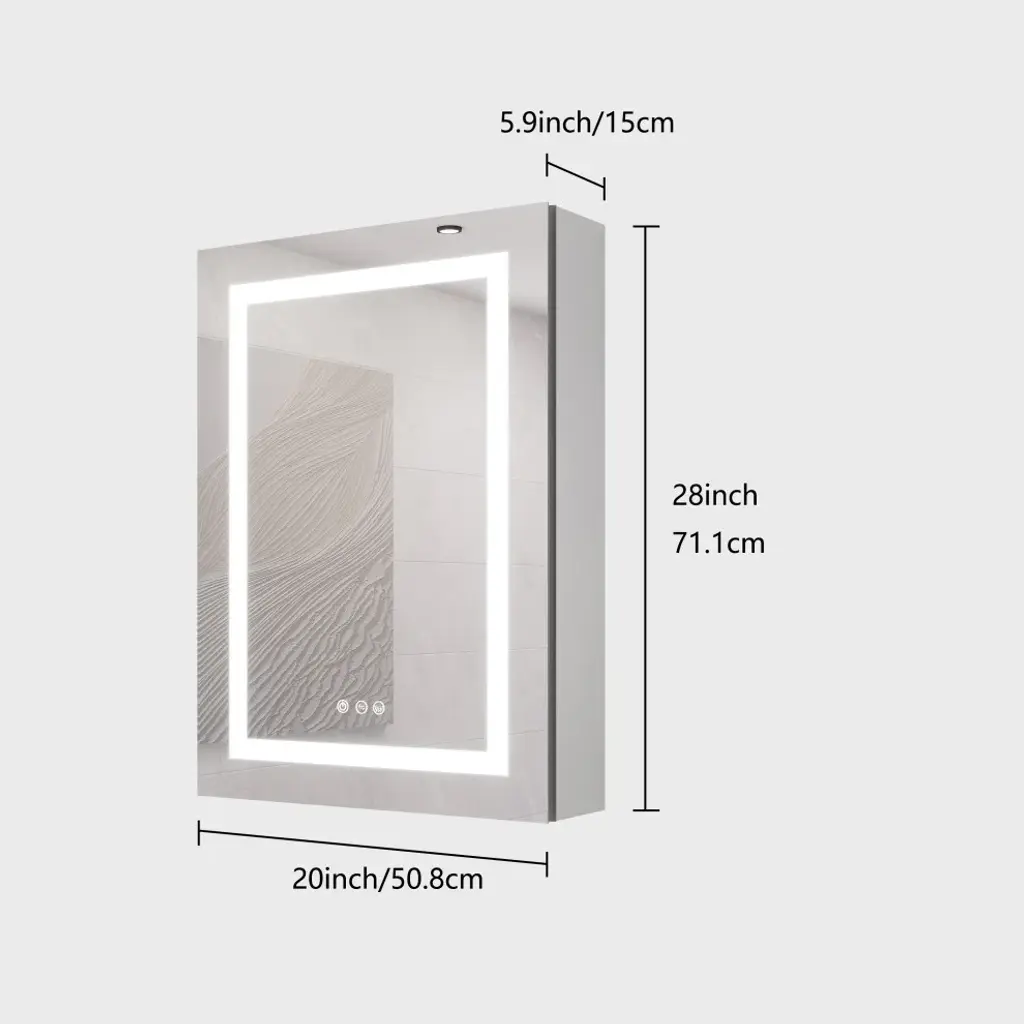 This surface mount medicine cabinet provides essential storage without sacrificing square footage. Perfect for the bathroom that"™s a bit short on space. Perfect for bathrooms that are a bit small. You can install it over the sink, next to the bathtub, or anywhere else. The mirror frame is made from aluminum alloy material, which is corrosion-resistant. You don''t have to worry about the stability of the structure. There are three touch switches for this cabinet, which control the main light, the anti-fog function respectively, the brightness adjustment, and the color temperature adjustment of the lighting. The independent control function allows users to know how to use it easily. An even mix of classic and contemporary elements, this clean-lined medicine cabinet lets you tuck away items in style.1. Single door double-sided mirror door (left open), with one circle of mirror door regularly sanded; 2.The mirror frame is made from aluminum alloy material, which is corrosion-resistant. You don''t have to worry about the stability of the structure.3.It is equipped with a three button Touch switch to control the main light and anti-fog film and adjust the light+color temperature, 3-color temperature, dimmable led with a long press to adjust the brightness. A lighted medicine cabinet can adjust the brightness from dark to bright according to your preference.4.This medicine cabinet with reasonable shelves to fully maximize storage space and let your bathroom and other scenarios be organized and clean.5.A bathroom medicine cabinet with a mirror provides uniform and optimal bright lighting, which can eliminate harsh shadows and hot spots when you are shaving, brushing your teeth, or putting on makeup.6.An even mix of classic and contemporary elements, this clean-lined medicine cabinet lets you tuck away items in style.7.The hinge is designed to slowly open and close, providing safety and care for you.