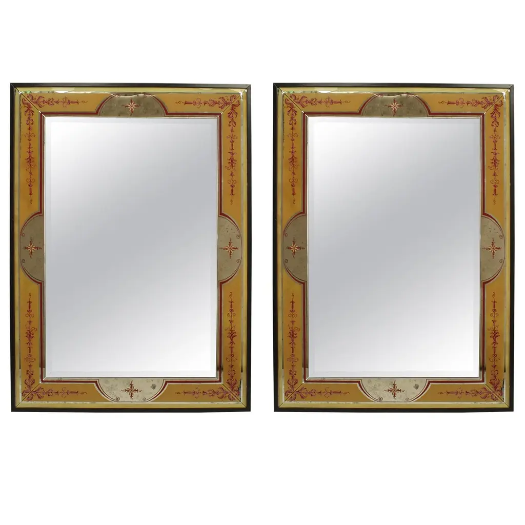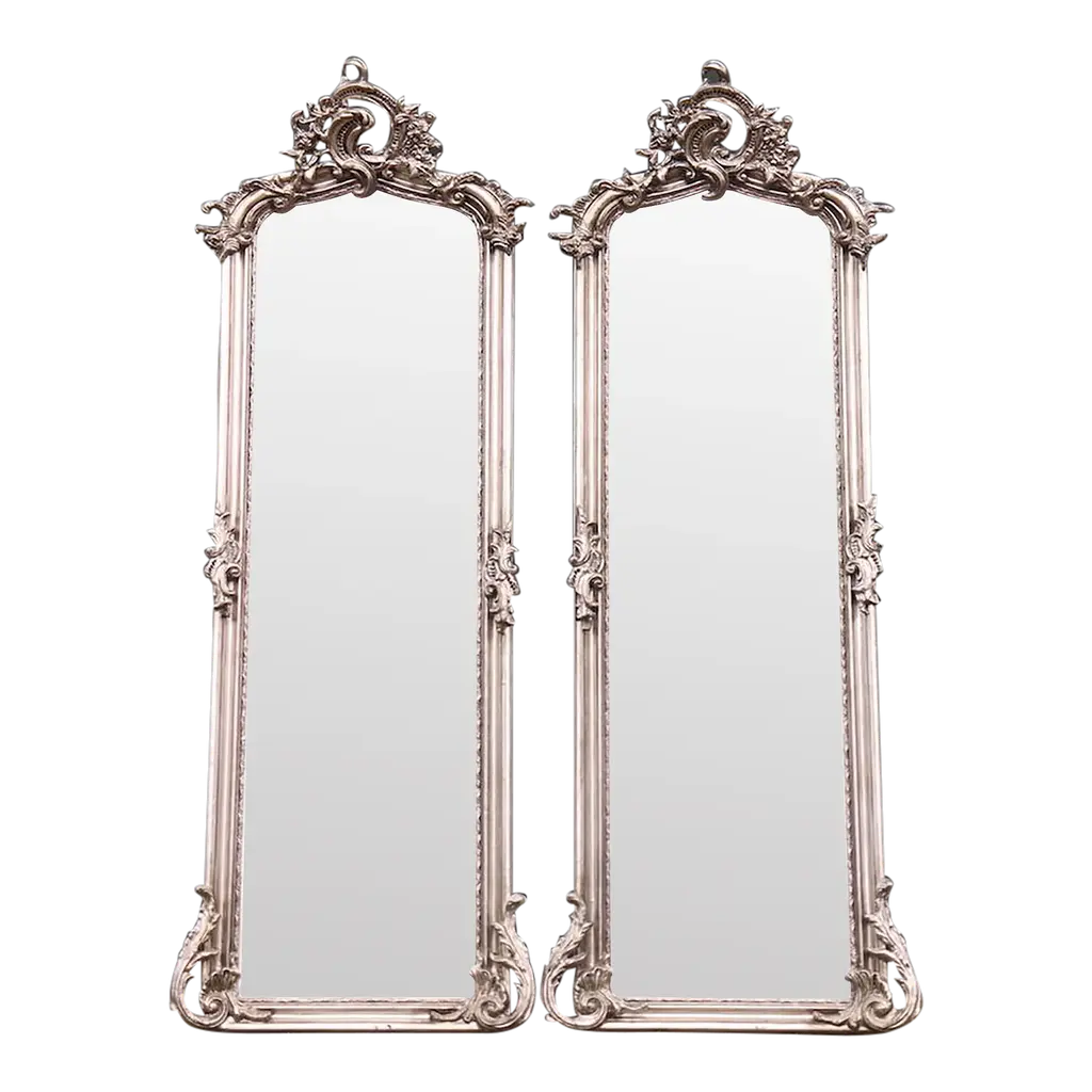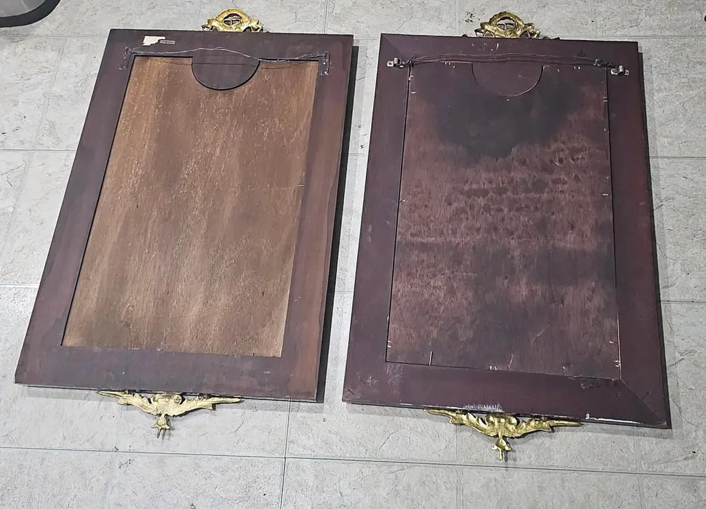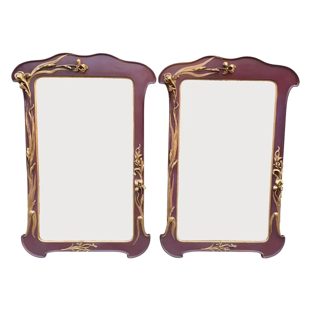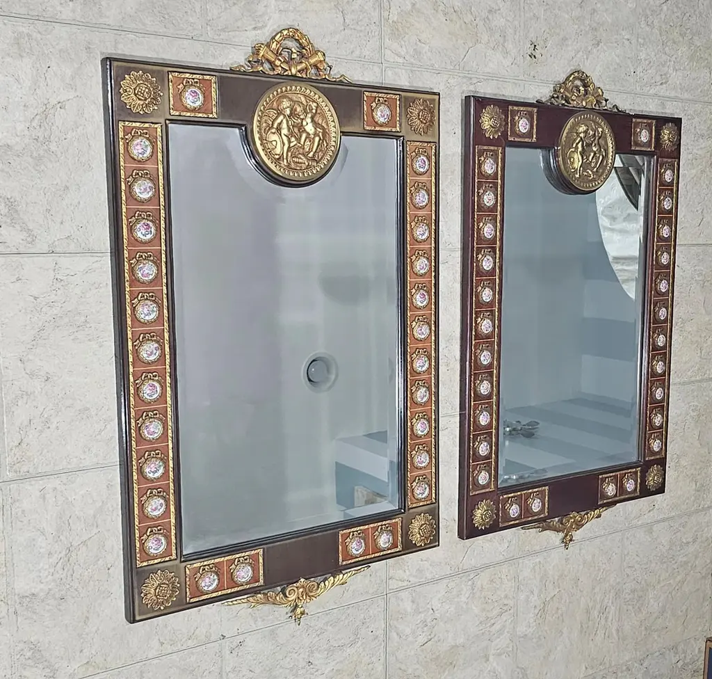 An exceptional pair of Late 20th Century Mariner Louis XV Style Mahogany and Walnut Marquetry, Ormolu and Porcelain Inset Mirrors. Just gorgeous and discontinued. Measure 20.5" I. Width, 38" in height and 1.25" in depth.