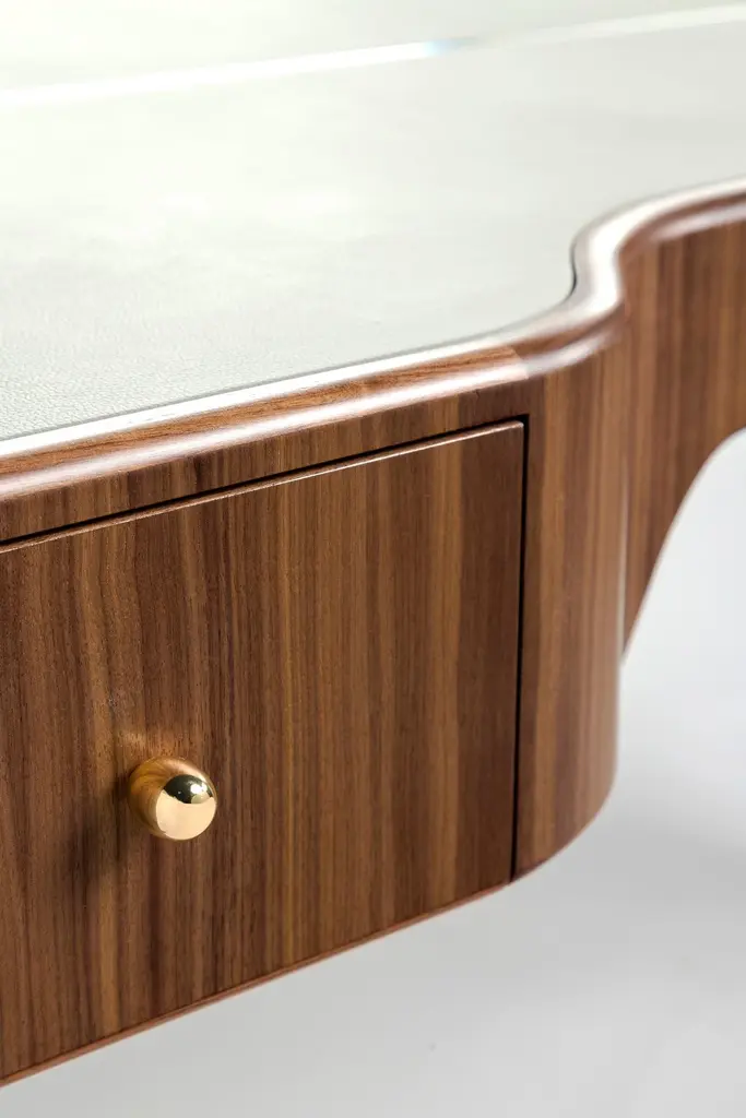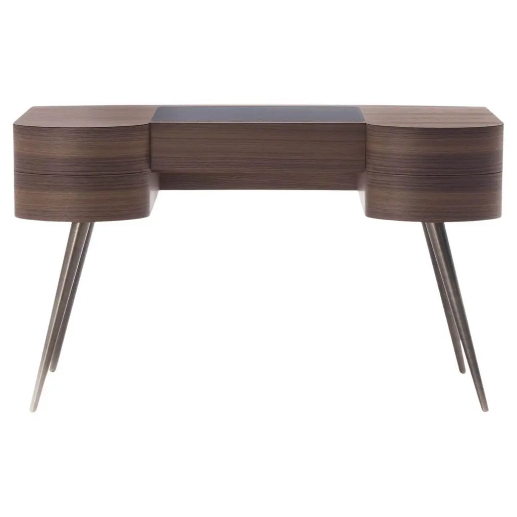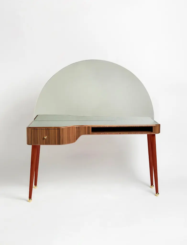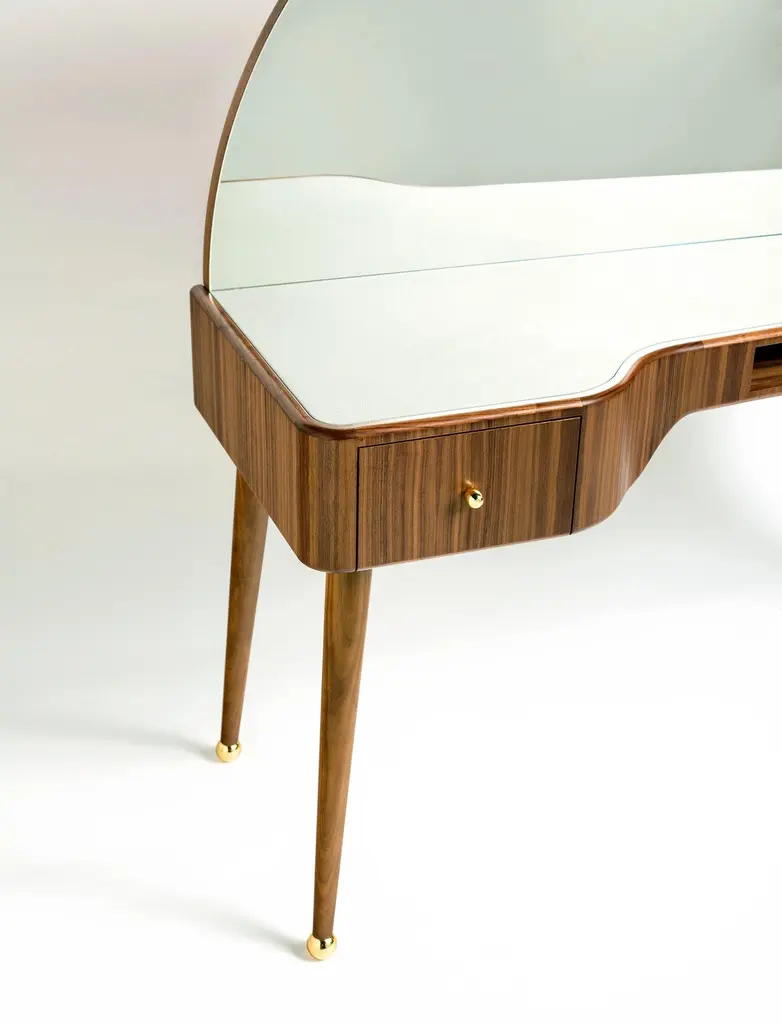 "La Nouvelle Vanité" is a make up desk made of American walnut veneer with an arc shaped mirror behind, designed by Merve Kahraman design studio.This work/makeup desk has a drawer on the left hand side and a niche on the right side to store your belongings. Top surface leather and brass accents are customizable.