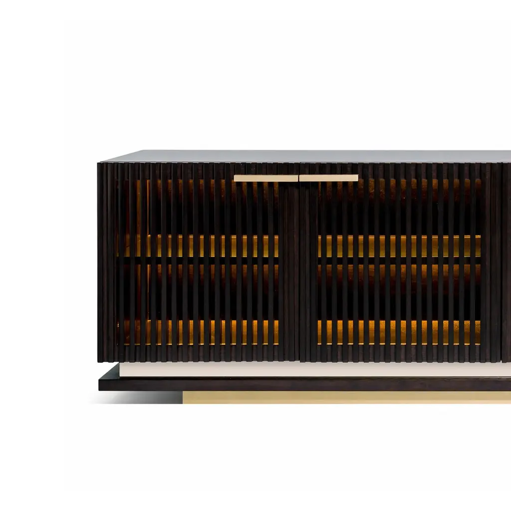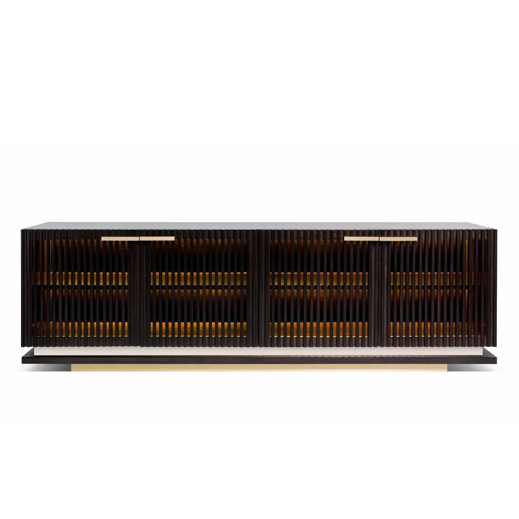Flare TV Unit, in Darkened Walnut and Bronze Mirror, Handcrafted by DuisttFlare tv unit is here to cut the clutter and get things organized with style and elegance. this luxury furniture design combines high-end materials in wood and metal. capable of changing the entire room, suitable for quality living rooms it will enhance the decor of your house.Shown in Darkened walnut, bronze mirror and brass/bronze details. LED'S included on the inside.Custom sizes and materials available upon request, production lead time 8 to 10 weeks. Designed and manufactured by Duistt in Portugal - Europe. Duistt arose in 2014 from the will and desire to produce high-end furniture pieces with special attention to quality and timeless design. Blending ancient knowledge and techniques with contemporary aesthetics, Duistt’ design approach elevates the user experience, guaranteeing them delightful pieces crafted with art that are absolutely unique and can last generations.