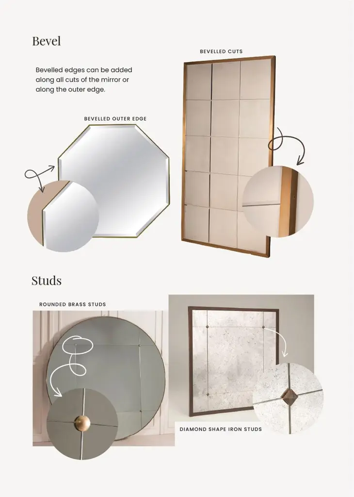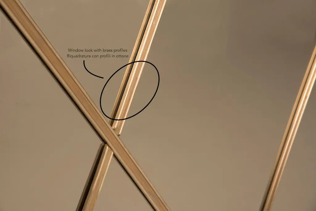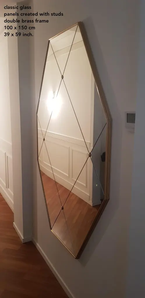 Pescetta presents its new collection of contemporary customizable brass frame mirrors. With frame made of brass and multi panels window look, these mirrors replicate the idea of early 20th century Art Deco style. They suit both modern spaces which need a touch of elegance, both very classical rooms which needs a wall decoration. Each mirror is a unique handmade piece, characterized by Italian quality and taste. Lead time 20 working days.Price refers to a mirror with following characteristics:FRAME: Brass, Aged effect, Double profile SHAPE: Octagonal MIRROR: distressed - black and white ACCESSORIES: Brass Bars to create the window lookSIZE: 100 x 150 cm / 39 x 59". Customizable. Other size, shape, finishings available.Design your mirror! Many details are customizable:Customize the FRAME- Define shape and size- Choose shiny or vintage brass- Select simple or double profile framePersonalize the MIRROR- Divide the mirror into panels, to have a window look with studs or brass profiles- Choose the kind of mirror: Classic, beveled, smoked, bronze or aged effect.- Add accessories such as lights, hangers or studs.