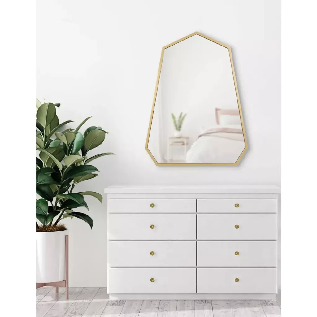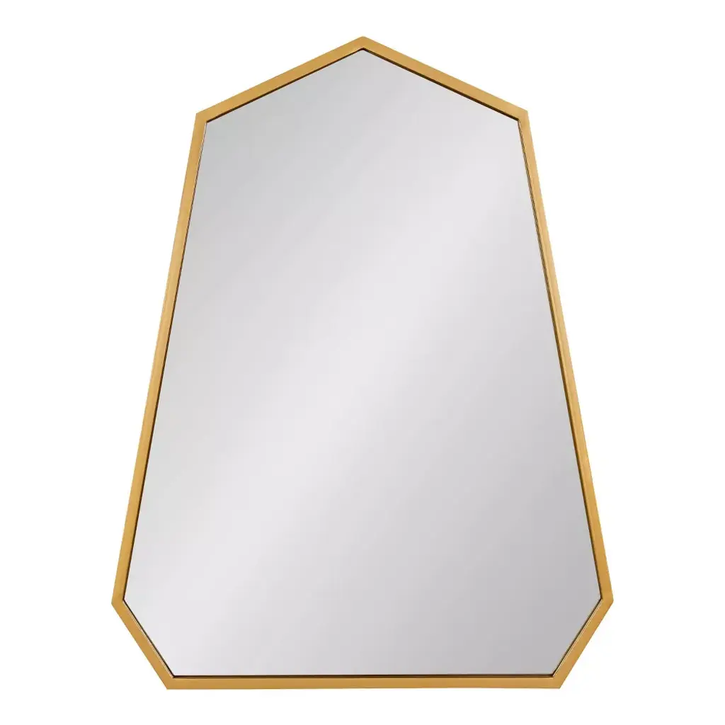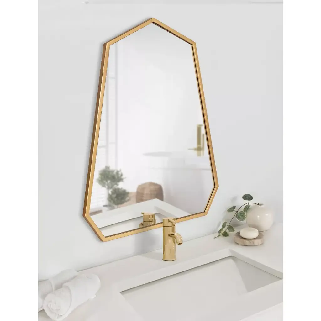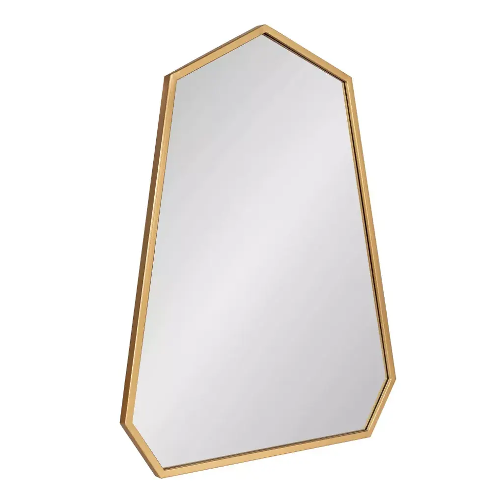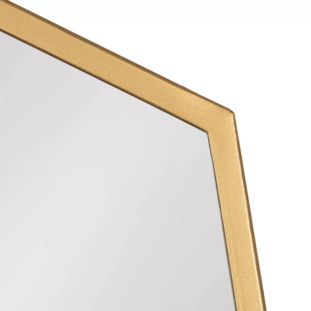 Craft a rich boho decor theme with this beautiful irregular wall mirror throughout your home. The Hammell mirror brings an eccentric yet sophisticated decor element to any wall of your home. Inspired by modern geometric forms, the Hammell has a unique heptagon shape with a diamond-inspired look. Along the sharp lines of the frame, you'll find a brilliant painted gold finish that is capable of blending into various spaces throughout your home. The overall dimensions of the Hammell mirror are 23 inches wide by 1 inch deep by 29.75 tall, making it an ideal decorative focal point to capture the attention and fascination of all of your guests. Adding a mirror with a large, reflective surface area like the Hammell increases the brightness of your space and makes it feel more open and dimensional. Hang this charming accent piece above your mantle, entryway console table, bedroom dresser, or over your vanity as a bathroom mirror. Hang this mirror in a matter of minutes with the metal sawtooth hangers attached to the MDF back.