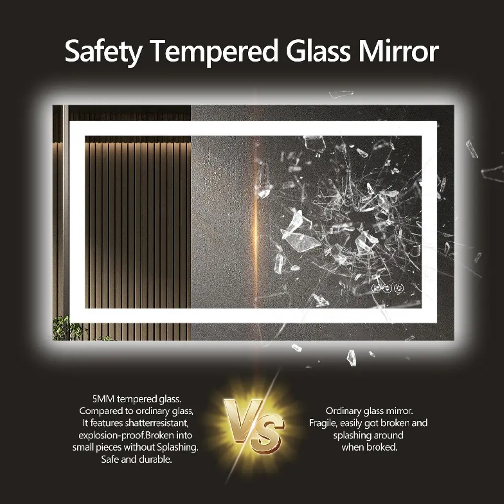 [Dimmable]: Long-press the power button to adjust brightness from 10% to 100%. Short-press the color temperature button to select 3000K warm white, 4500K neutral white, or 6000K daylight.[Unique Design]: Integrated mirror power switch and anti-fog button. The built-in anti-fog function eliminates the need for constant de-misting sprays. Anti-fog mode automatically shuts off after 1 hour for energy efficiency and safety.[Wall Switch Compatibility]: The wall switch can directly control the light and anti-fog functions. When power is restored via the wall switch after shutdown, the mirror resumes its last-used settings.[Safe & Durable]: UL-certified components with protective casing. LED lifespan: 50,000+ hours (45+ years at 3 hours daily use). Copper-free silver mirror with far lower corrosion rates than standard mirrors. Features 5mm tempered glass for shatterproof, explosion-resistant, and long-lasting safety.[Easy Installation & Packaging]: Improved packaging minimizes transport damage. Passed rigorous tests including drop, impact, high-voltage, and insulation tests. Includes mounting screws for effortless installation.