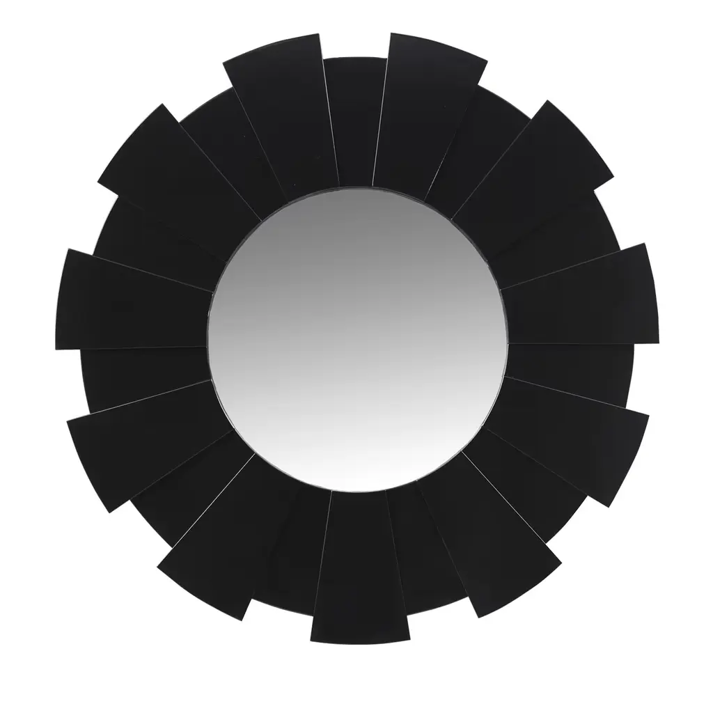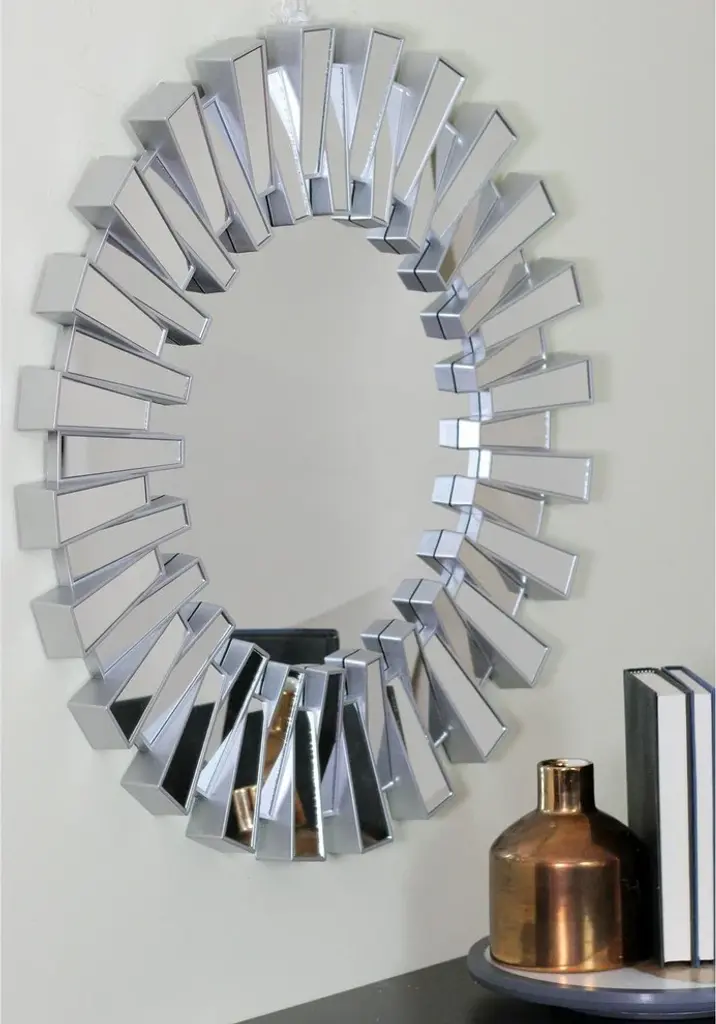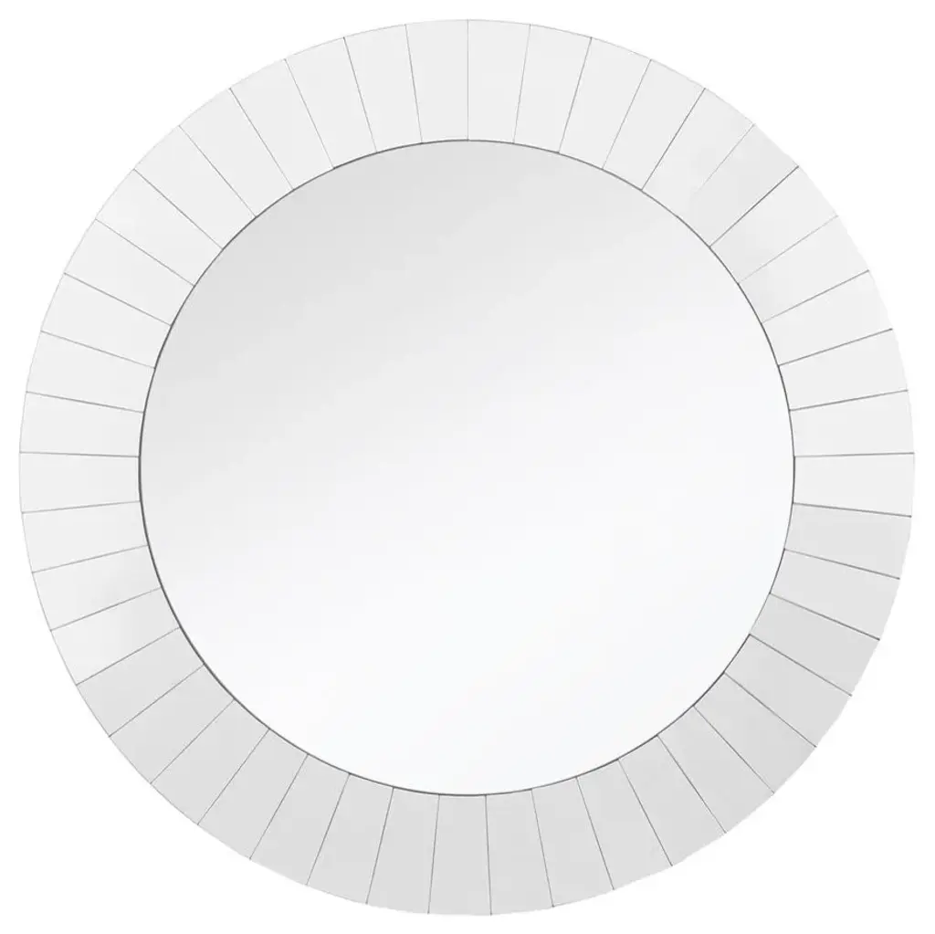 This beautifully crafted mirror will add a touch of modern regal elegance to any room in your home Features a round silver frame with mini mirrored columns inspired by a sparkling sunburst Includes hanging hardware Overall Dimensions: 25.5"H x 25.5"W x 1.5"D Center Mirror Dimensions: 14" diameter Material(s): glass/plastic