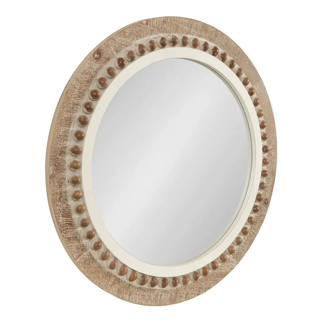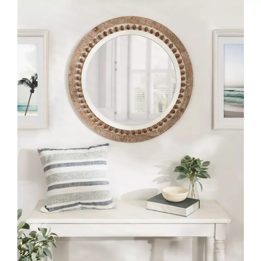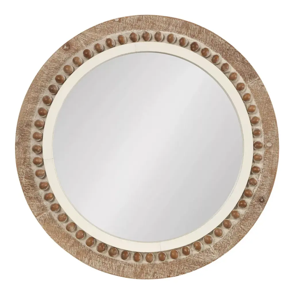 Farmhouse style is timeless for a reason. It's not only because of its vintage charm but also the coziness that natural wood and elegant detailing impart on your home. This is what sets the Maddigan wall mirror apart: it features a hand-distressed and whitewashed rustic brown finish, creating that look of vintage charm. This storied finish coats a robust solid wood construction, capable of becoming a household decor staple for decades to come. The Maddigan features a 28-inch diameter that emanates a commanding presence throughout your space, establishing it as a unifying focal point for your rustic decor scheme. The large surface area of the Maddigan also makes it fantastic for adding vibrancy to your living room mantle, above your entryway console, or above your dresser as bedroom decor. Are you in the middle of renovating your master bath or powder room? The Maddigan makes an excellent bathroom mirror over your vintage-inspired vanity! Regardless of where you hang this bold, big mirror, it hangs in a matter of minutes with convenient D-ring hangers attached to the back of the frame.