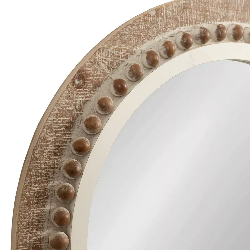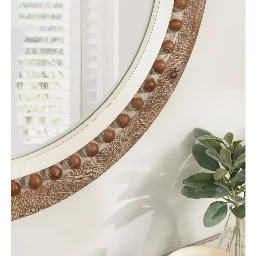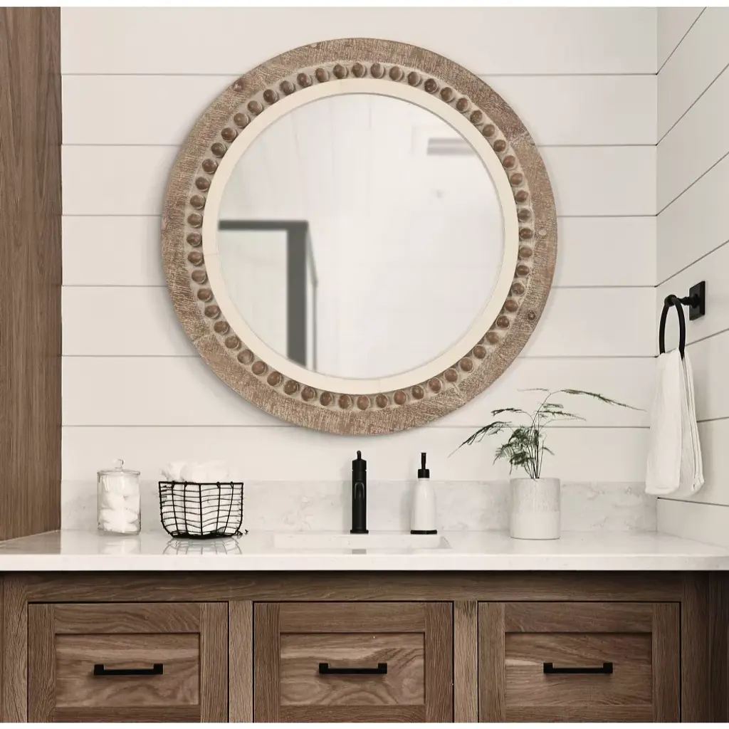 Farmhouse style is timeless for a reason. It's not only because of its vintage charm but also the coziness that natural wood and elegant detailing impart on your home. This is what sets the Maddigan wall mirror apart: it features a hand-distressed and whitewashed rustic brown finish, creating that look of vintage charm. This storied finish coats a robust solid wood construction, capable of becoming a household decor staple for decades to come. The Maddigan features a 28-inch diameter that emanates a commanding presence throughout your space, establishing it as a unifying focal point for your rustic decor scheme. The large surface area of the Maddigan also makes it fantastic for adding vibrancy to your living room mantle, above your entryway console, or above your dresser as bedroom decor. Are you in the middle of renovating your master bath or powder room? The Maddigan makes an excellent bathroom mirror over your vintage-inspired vanity! Regardless of where you hang this bold, big mirror, it hangs in a matter of minutes with convenient D-ring hangers attached to the back of the frame.