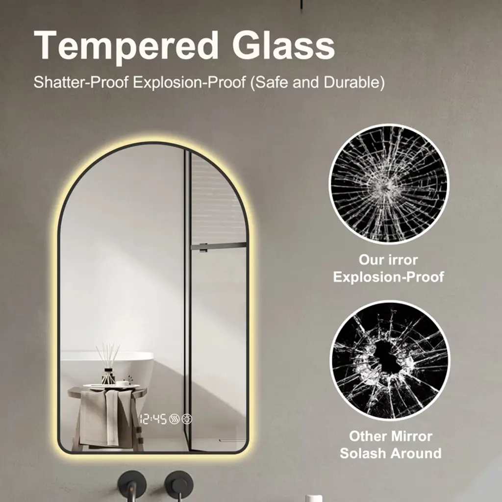 "LED bathroom mirror with time and temperatureThe 12 hour precise clock allows for easy and quick time setting with just a gentle touch, making it easy to keep track of the time and plan your schedule at any time.Anti-blast film on the backExplosion-proof glass brings you a sense of security, even if the cracked glass will not splash.Three-colour changing lightYou can press the button to change the color temperatures: Warm(3000K), natural (4000K) and white(6000K). You can also dim the brightness to your comfortable level. All these will be easily controlled by the touch button.Defogging functionThe one-touch defogging function ensures that the mirrors don't fog up and stay clear.No rust, no deformation, corrosion-resistantModern high-tech electroplating process£¬with good gloss and greater corrosion resistance."