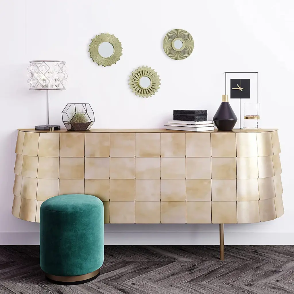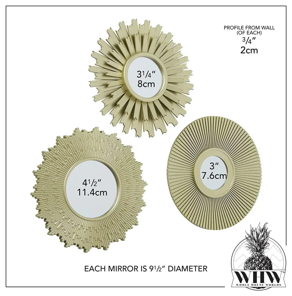 Radiate nothing but good taste with this set of 3 burst mirrors. Graduated in size, use each round to bring interest to empty wall space. Surrounded by a complex layered frames that are made to look like layered golden gilt. Arrange vertically, horizontally or freestyle this versatile trio creatively to express personal style. Enliven a wall with reflective accents and make a house feel like home.