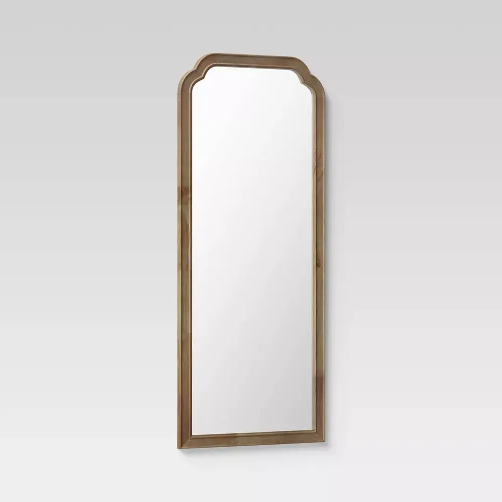 Complete your farmhouse-styled decor with an accessory that's both functional and chic with the Oversize Leaner French Country Wood Mirror from Threshold™. Featuring a leaner style with a decorative wooden frame in a natural finish, along with full-length reflective glass that lets you check your appearance from top to bottom, this decorative mirror brings function and style to your indoor space. The solid wooden frame provides sturdy support to the mirror inside, and the decorative curved accents on top add a touch of shabby-chic style. Great to keep in the entryway, hallway or bedroom, this oversized wooden mirror makes a fabulous and functional piece in your home.