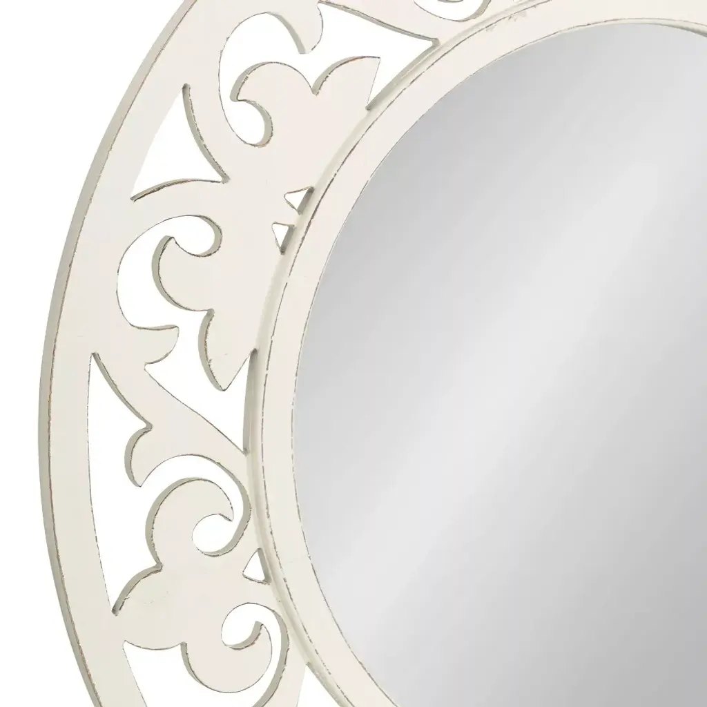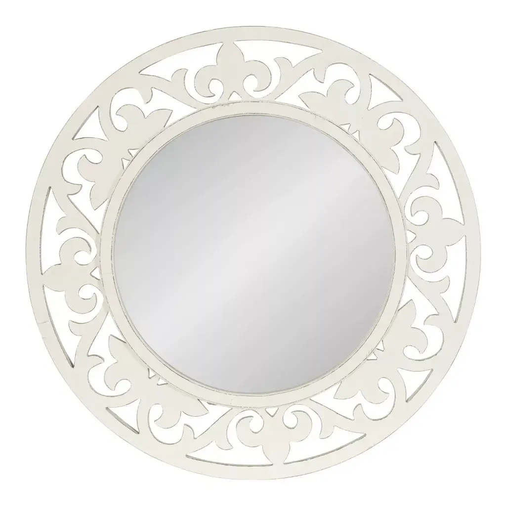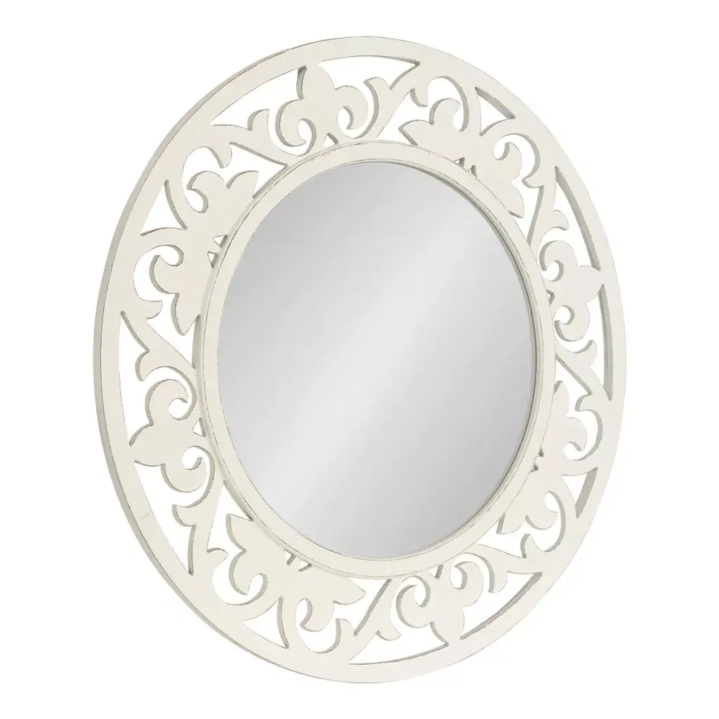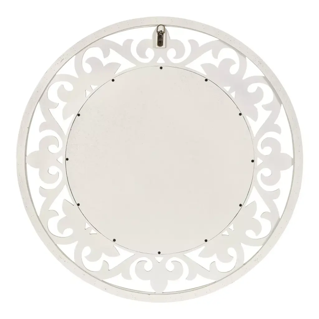 The Shovali is a decadent piece of wall decor with the rustic charm you crave. Embrace the highly-detailed elegance of a round frame carved with an ornate curvature to capture the imagination. The white finish enhances its vintage, shabby-chic aesthetic, breathing life into your modern farmhouse decor. The mirror has an overall diameter of 31.5 inches to draw the eye and improve your space with a dynamic focal point. Adding a mirror to your home expands your smaller spaces, opening the room up by reflecting light throughout the area. The Shovali mirror looks stunning on a fireplace mantle, above your entryway console, or in the bedroom over your dresser. Its round shape and 19.5-inch glass surface make it an excellent bathroom vanity mirror. Hang your new farmhouse decor easily, thanks to the metal D-ring hanger attached to the back.