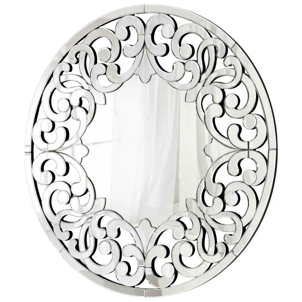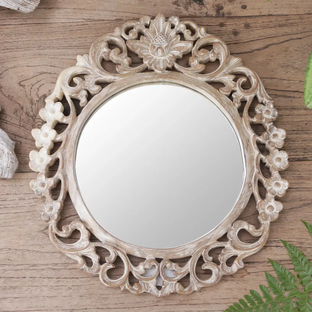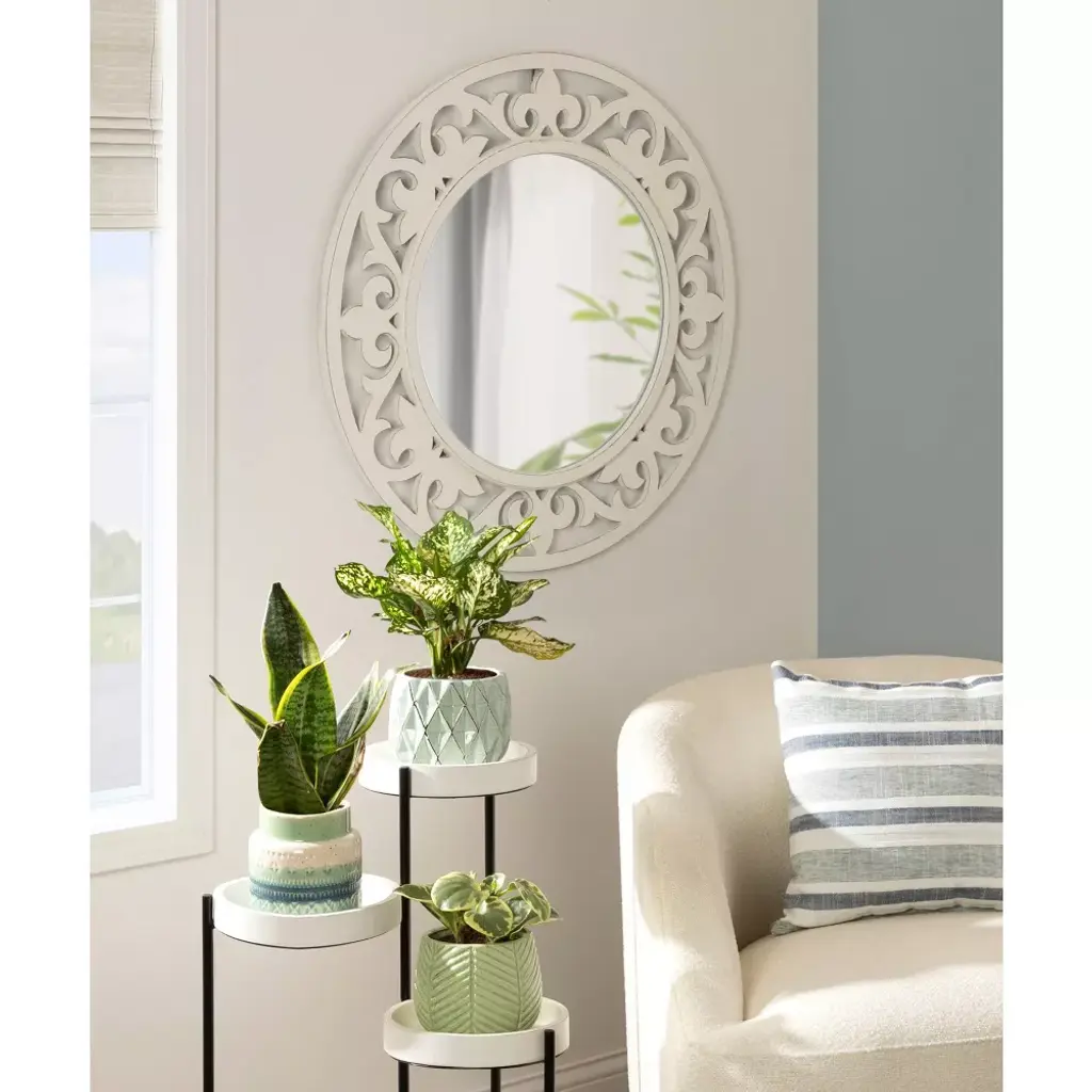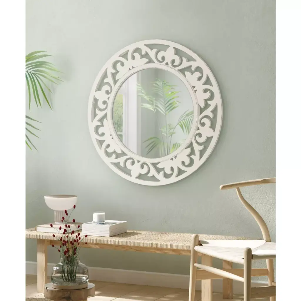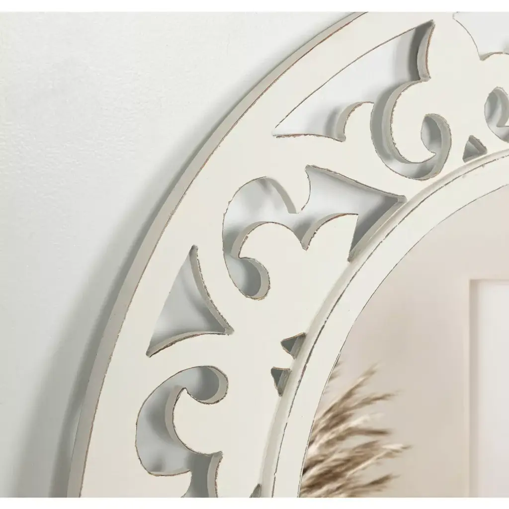 The Shovali is a decadent piece of wall decor with the rustic charm you crave. Embrace the highly-detailed elegance of a round frame carved with an ornate curvature to capture the imagination. The white finish enhances its vintage, shabby-chic aesthetic, breathing life into your modern farmhouse decor. The mirror has an overall diameter of 31.5 inches to draw the eye and improve your space with a dynamic focal point. Adding a mirror to your home expands your smaller spaces, opening the room up by reflecting light throughout the area. The Shovali mirror looks stunning on a fireplace mantle, above your entryway console, or in the bedroom over your dresser. Its round shape and 19.5-inch glass surface make it an excellent bathroom vanity mirror. Hang your new farmhouse decor easily, thanks to the metal D-ring hanger attached to the back.