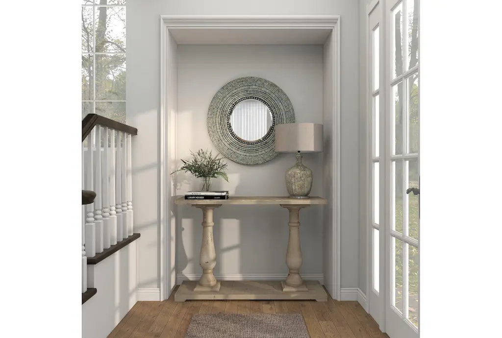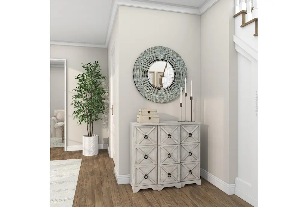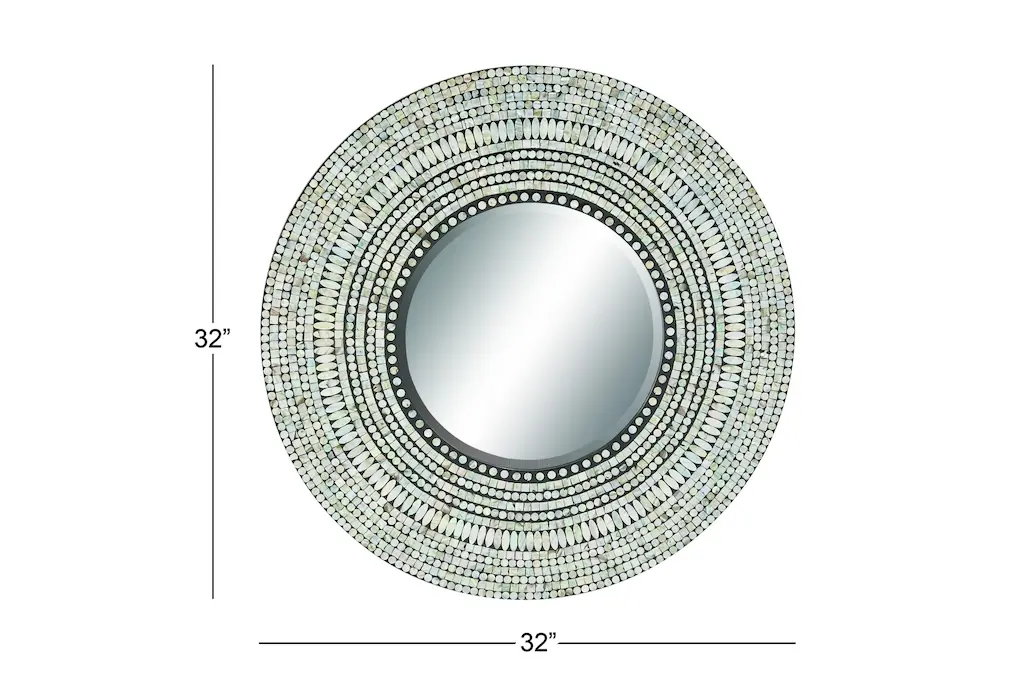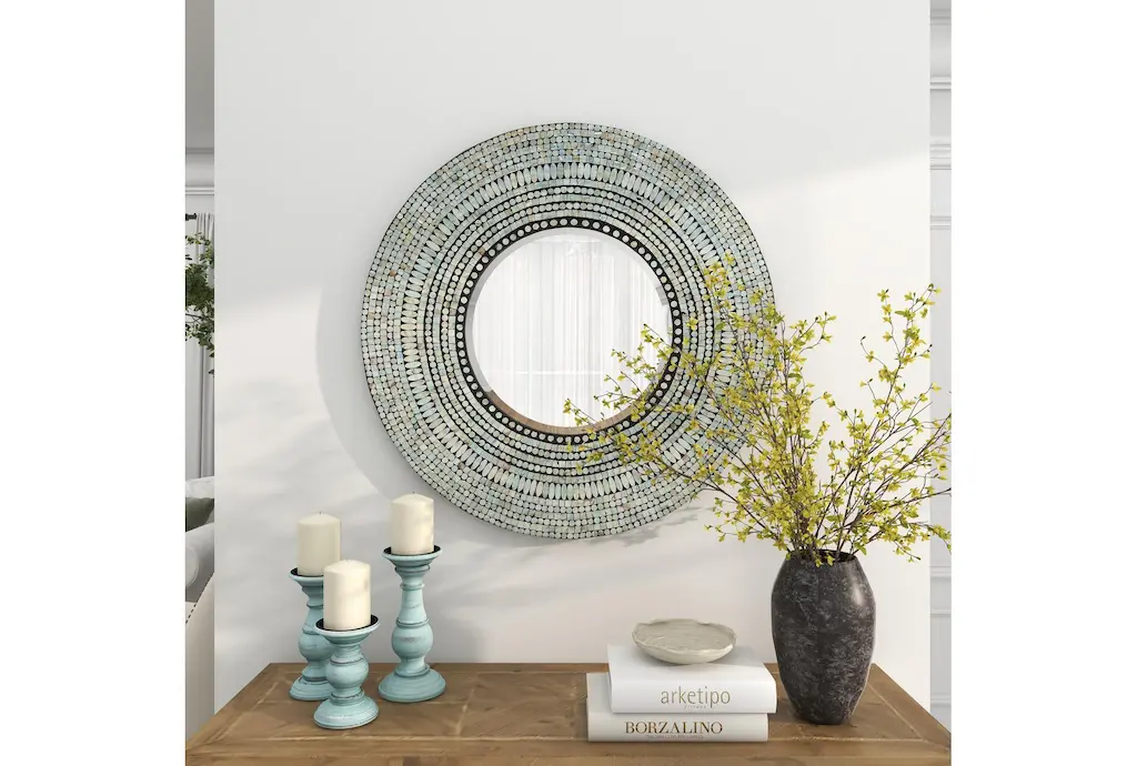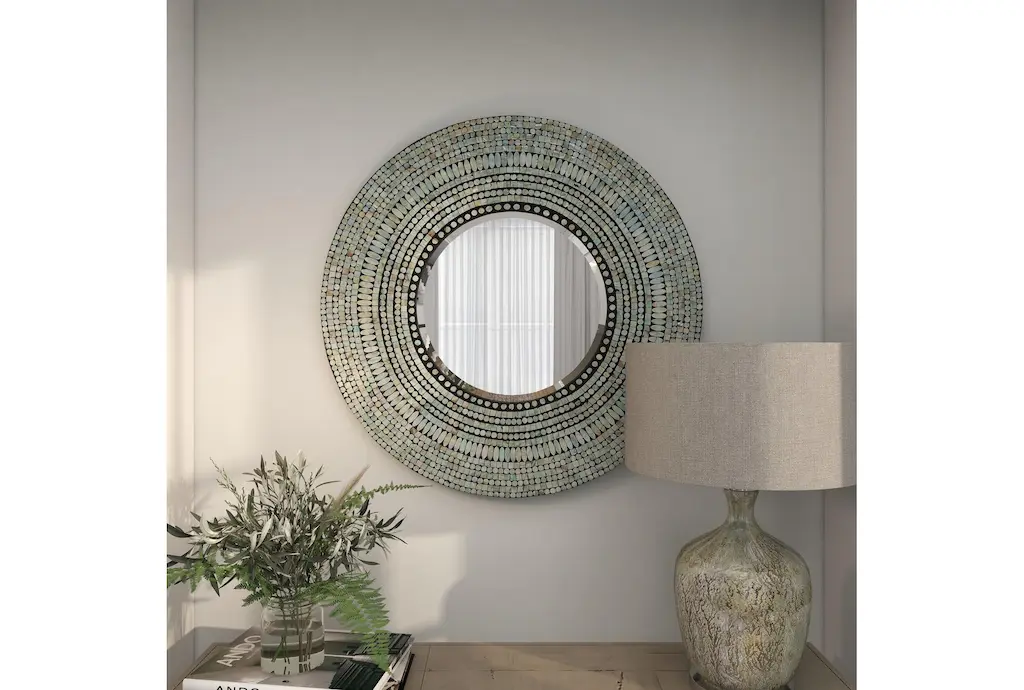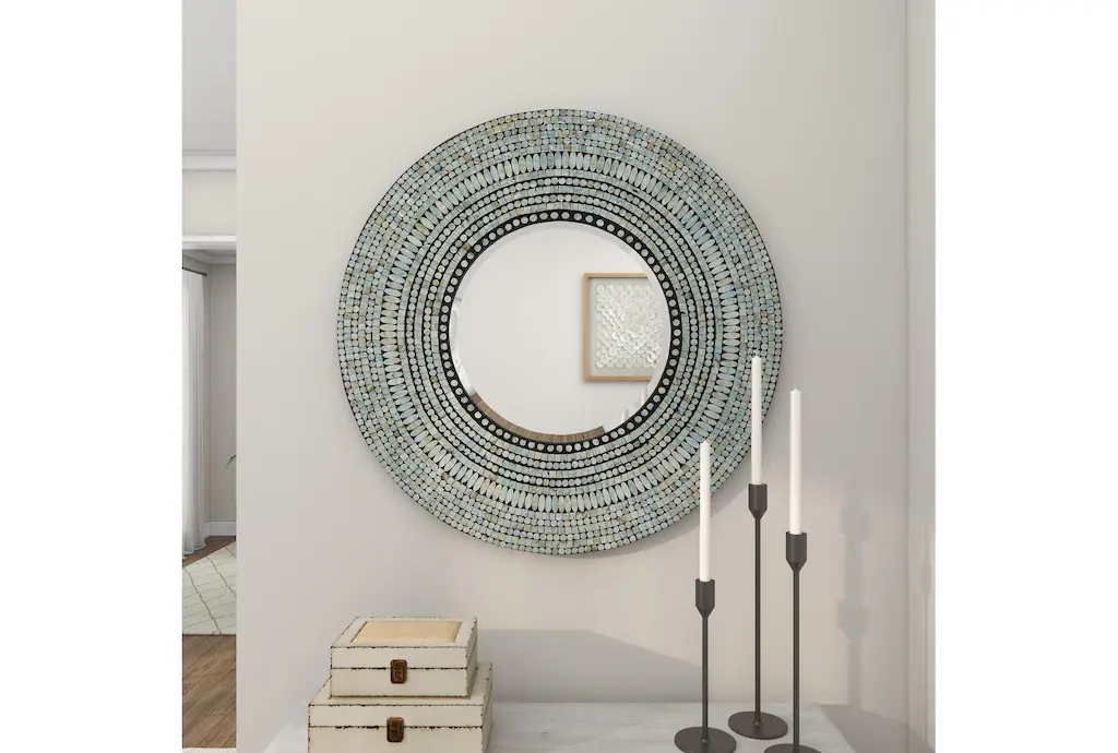 Add flair to your lobby, living room, or bedroom with this multicolor round wall mirror that reflects your style and helps bounce light around your space. This item ships in 1 carton. Due to the handmade nature of this item, no two will be alike, there will be slight differences in shape, size, and color. Can be hung vertically using the D-rings on the back; nails and screws not included. Suitable for indoor use only. This item ships fully assembled in one piece. Made in Vietnam. This is a single multi colored entryway mirror. Coastal style.