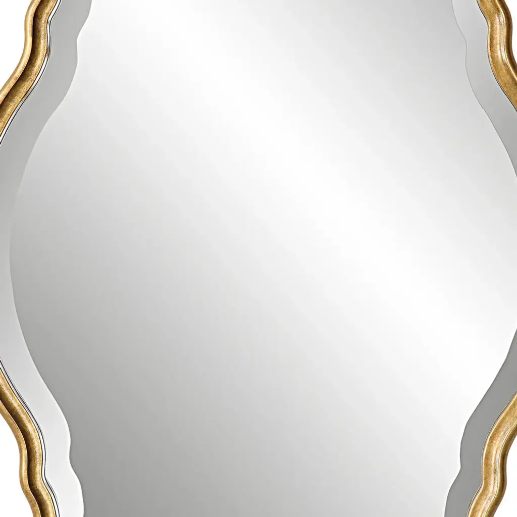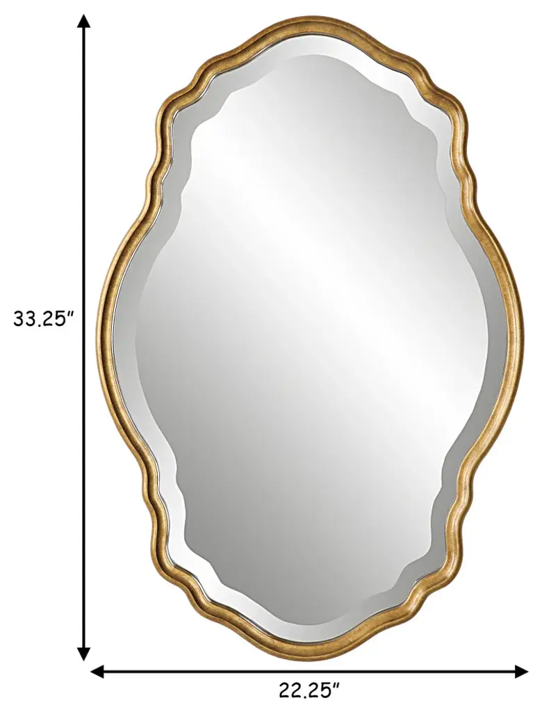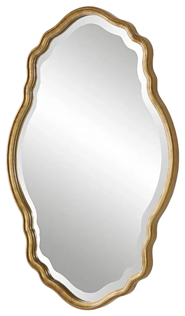 33 Inch Wood Wall Mirror, Elongated Quatrefoil, GoldExemplify classic style with this wall mirror that brings a charming personality and elegant class to your home with graceful curves that add beauty to this expertly designed mirror. It has an elongated quatrefoil frame in a rich gold finish with amber glaze and has a gorgeous 1.25 inch bevel. It can be hung either vertically or horizontally with easy to install mounting hardware on the back.