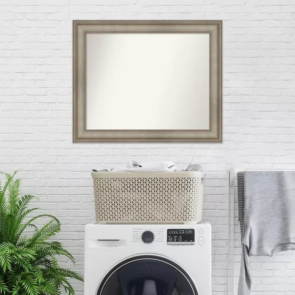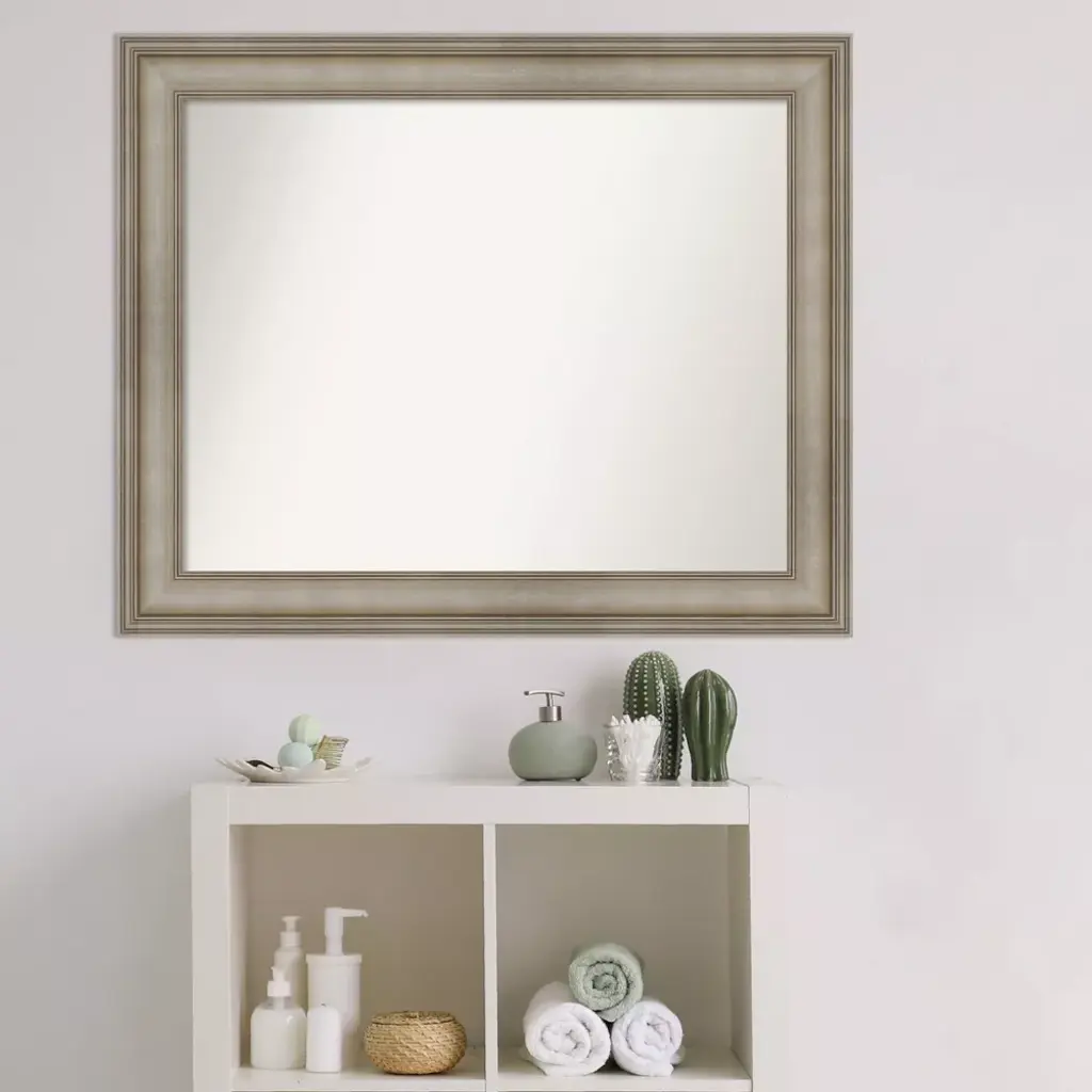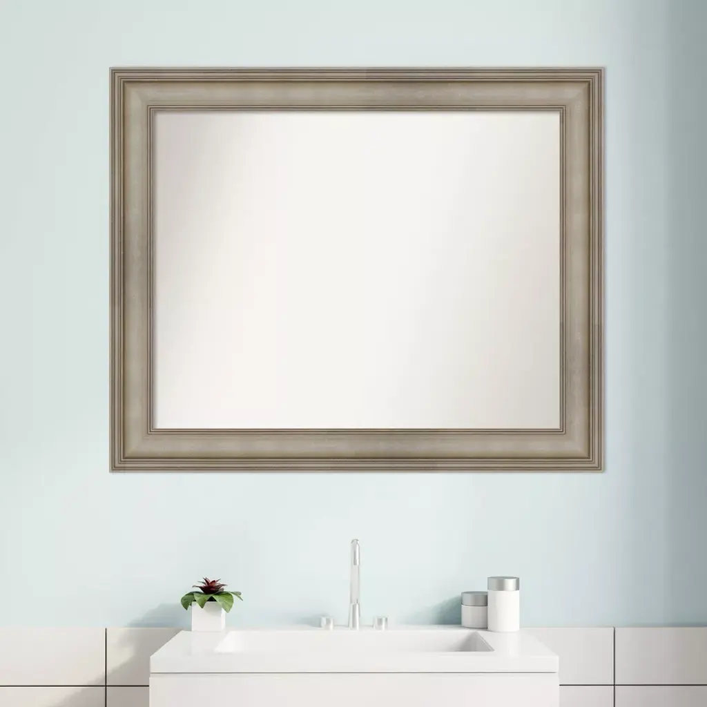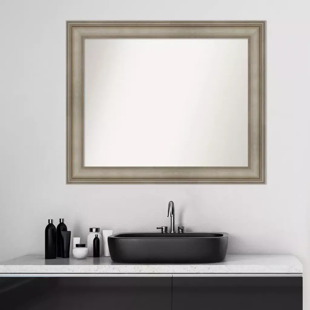 Give your bathroom the finishing touch with this 100% real wood Non-Beveled Wall Mirror framed with the Mezzanine Antique Silver Narrow frame. Individually made using traditional custom framing techniques, it has the quality you would expect from your local frame shop. It holds its value with premium finishing that can be appreciated up close. Because of our attention to detail and focus on artistry, architects, interior designers, and homeowners alike choose this mirror to create beautiful living spaces.