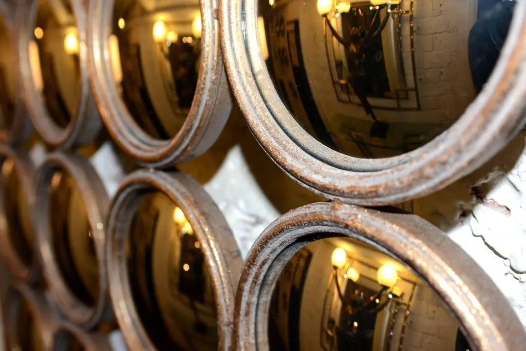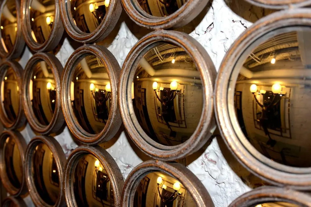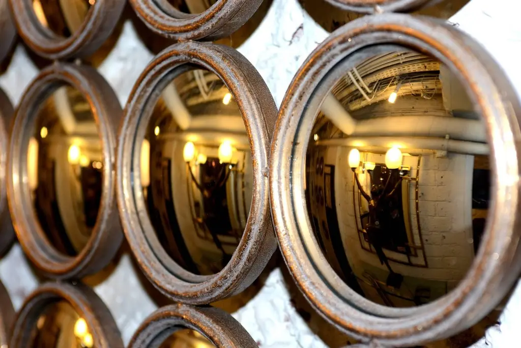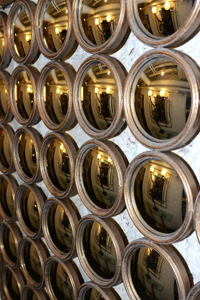 Square Mirror with 36 Faceted Round Convexglass mirrors. Metal gold finish structure.