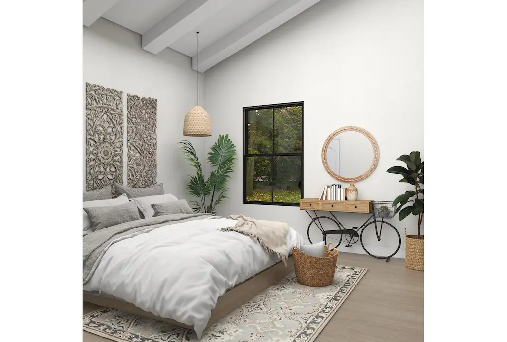 Apart from decorating your home, the purpose of this wall mirror is to bounce back outdoor light to a small room to make it look bigger. Pair this decorative wall mirror with house plants or other wall decor accent pieces to blend everything together perfectly. Decorate this bohemian wall mirror in dark spaces in your home to bring in some light and pair it with soft colored upholstered seating. This item ships in 1 carton. Can be hung vertically using the D-rings on the back; nails and screws not included. Suitable for indoor use only. This item ships fully assembled in one piece. This is a single light brown colored entryway mirror. Bohemian style.