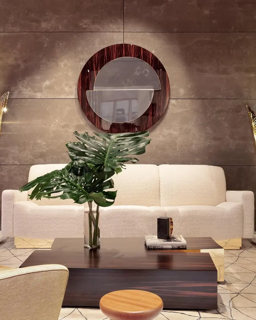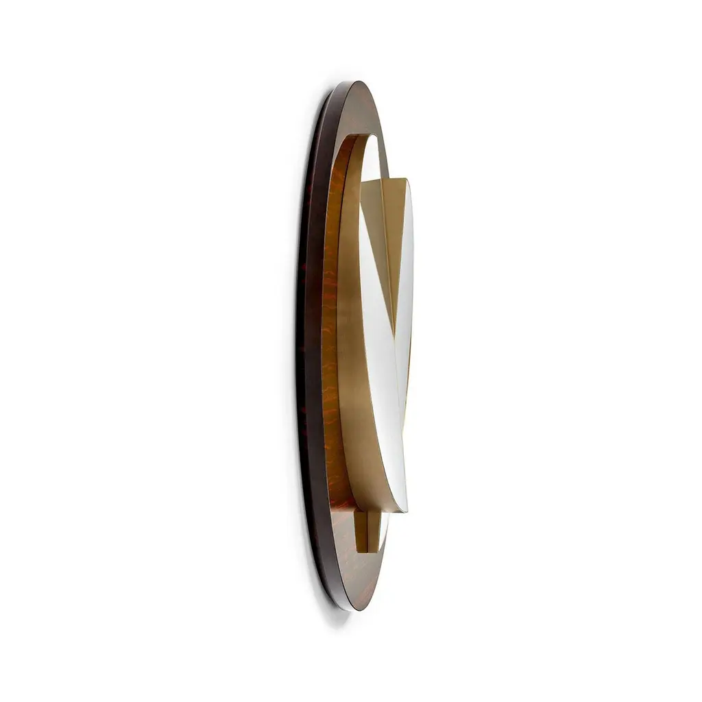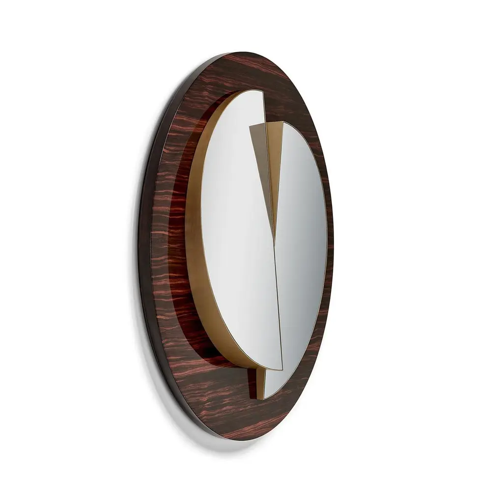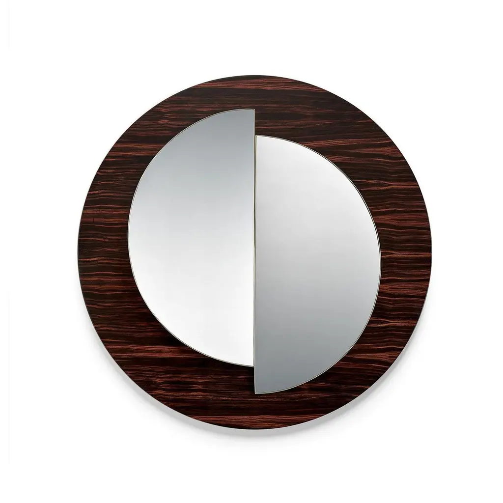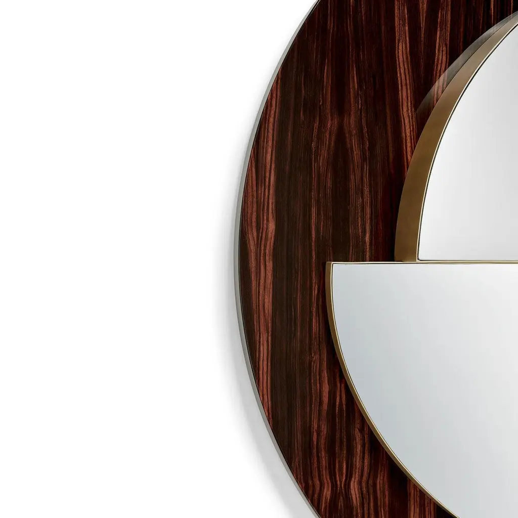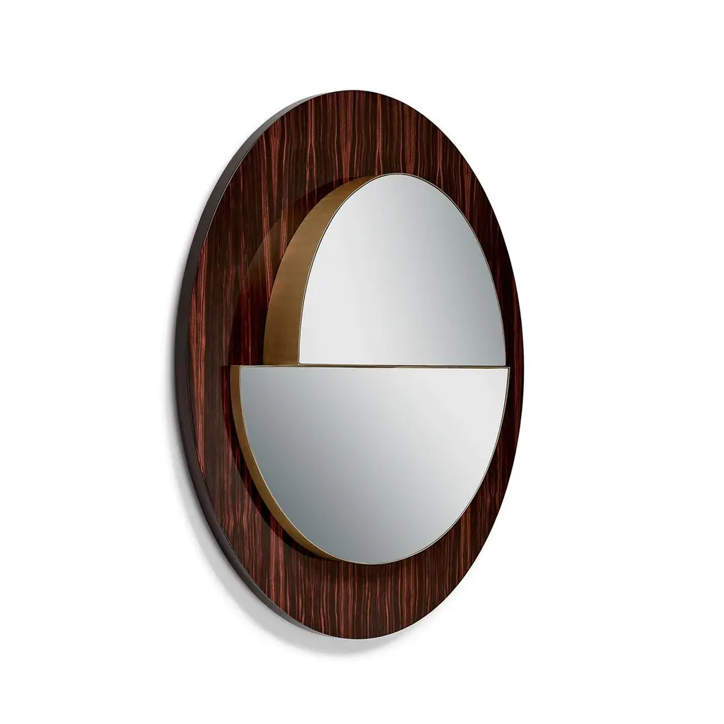 The divided mirrors provide two different reflections, in two different perspectives, as that of night and day, dark and light, the sky and the land.Frame: Bird Eye, Artic Bird Eye, American Walnut, Ebony or Olive Ash wood veneer with matt or gloss finishing; or lacquered in all RAL colors with matt or gloss finishing. Metal details: Brass, Nickel or Copper in polished, brushed or antique finishing.Mirror: Clear, Bronze or Smokey finishing.This mirror is offered in 2 additional sizes: Medium: Ø: 120 cm 47.2"D: 15 cm 5.9Large: Ø: 140 cm 55.1"D: 16 cm 6.3 "Size can be customized to fit your space perfectly.We do our best to expedite production and to ship and deliver product within the listed lead time, however current lead times might be longer due to global shipping backlog and delays. These delays are out of our control and cannot be a reason to cancel an order.