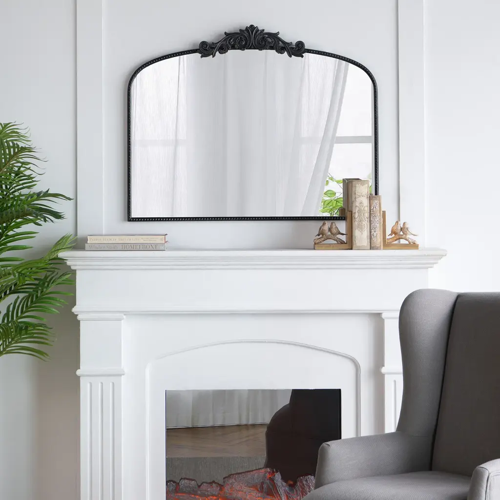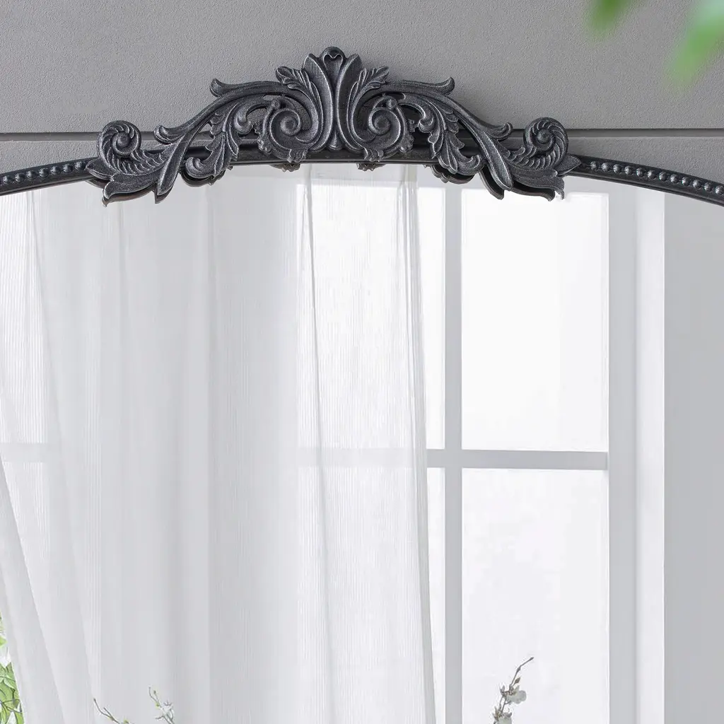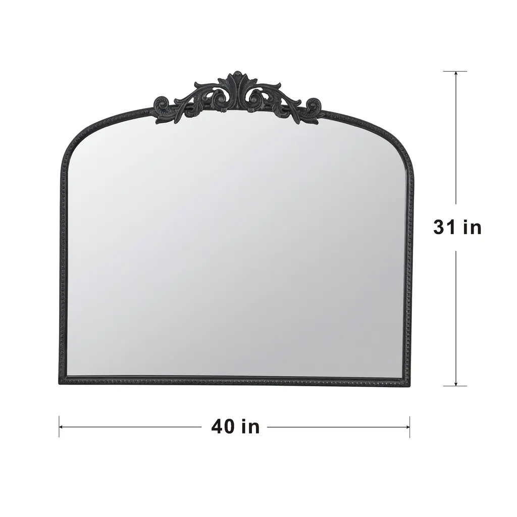 Transform your space with this classic arch mirror, adorned with vintage-inspired details on top that evoke the charm of the baroque era while incorporating a modern twist. Its elegant design makes it an ideal choice for placement above an entryway console or over a fireplace mantel, effortlessly enhancing any room with a luxurious, high-end ambiance. The custom-inlaid glass is skillfully crafted and securely protected by a sturdy frame, ensuring both timeless beauty and lasting durability.