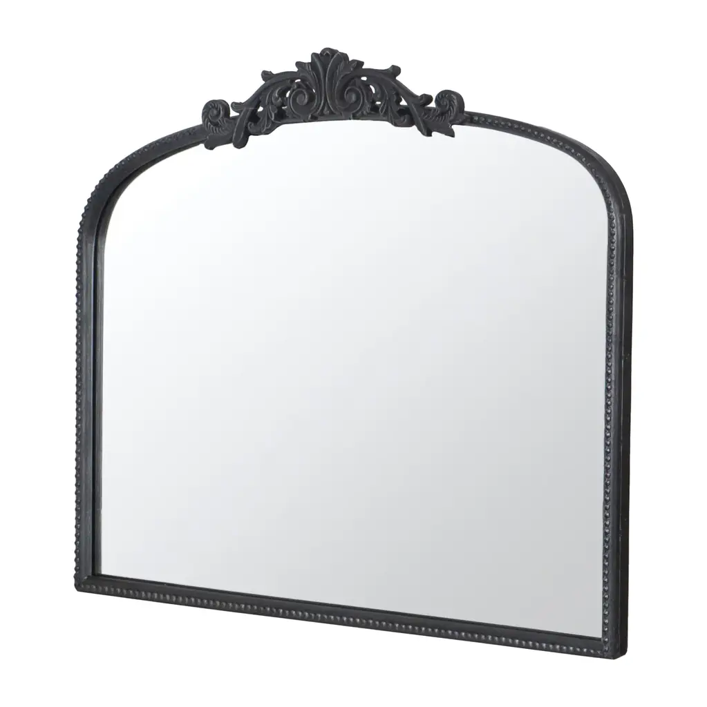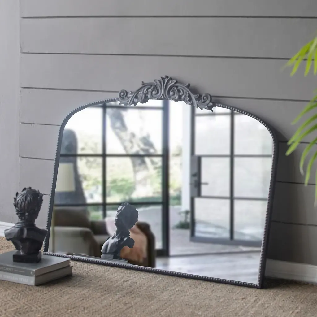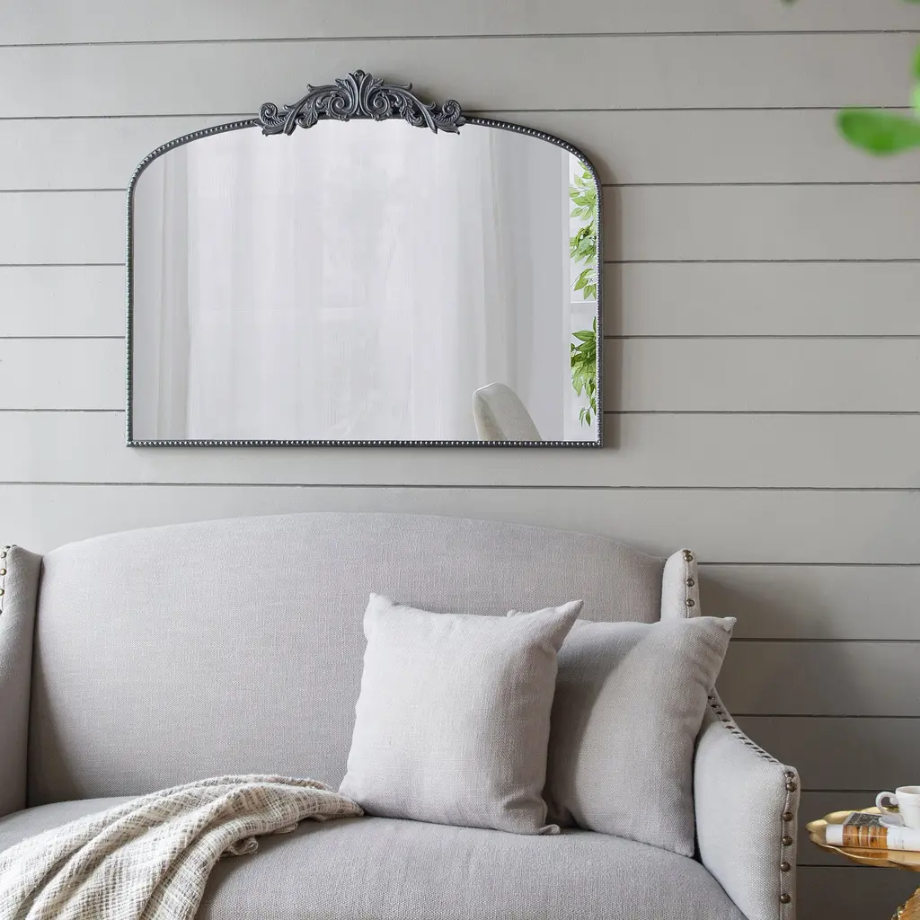 Transform your space with this classic arch mirror, adorned with vintage-inspired details on top that evoke the charm of the baroque era while incorporating a modern twist. Its elegant design makes it an ideal choice for placement above an entryway console or over a fireplace mantel, effortlessly enhancing any room with a luxurious, high-end ambiance. The custom-inlaid glass is skillfully crafted and securely protected by a sturdy frame, ensuring both timeless beauty and lasting durability.