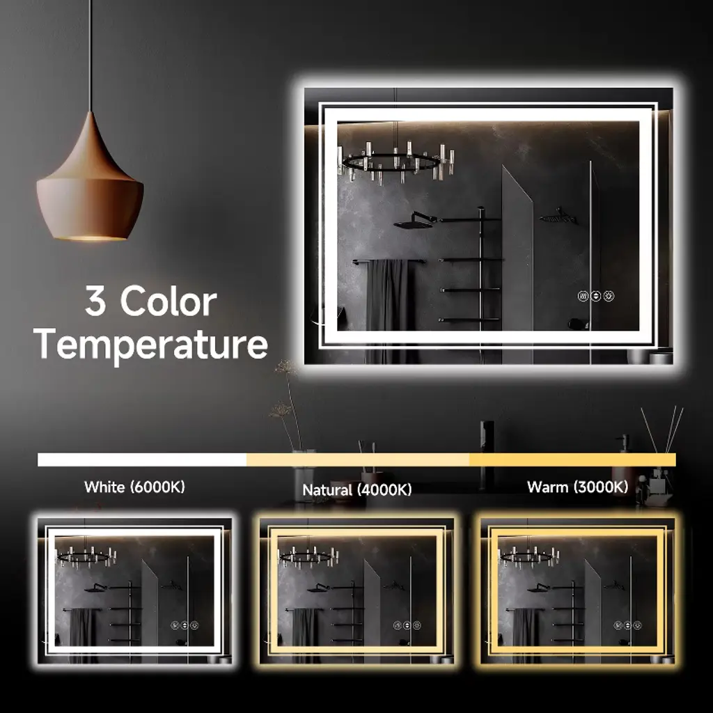 [Dimmable]: Long-press the power button to adjust brightness from 10% to 100%. Short-press the color temperature button to select 3000K warm white, 4500K neutral white, or 6000K daylight.[Unique Design]: Integrated mirror power switch and anti-fog button. The built-in anti-fog function eliminates the need for constant de-misting sprays. Anti-fog mode automatically shuts off after 1 hour for energy efficiency and safety.[Wall Switch Compatibility]: The wall switch can directly control the light and anti-fog functions. When power is restored via the wall switch after shutdown, the mirror resumes its last-used settings.[Safe & Durable]: UL-certified components with protective casing. LED lifespan: 50,000+ hours (45+ years at 3 hours daily use). Copper-free silver mirror with far lower corrosion rates than standard mirrors. Features 5mm tempered glass for shatterproof, explosion-resistant, and long-lasting safety.[Easy Installation & Packaging]: Improved packaging minimizes transport damage. Passed rigorous tests including drop, impact, high-voltage, and insulation tests. Includes mounting screws for effortless installation.