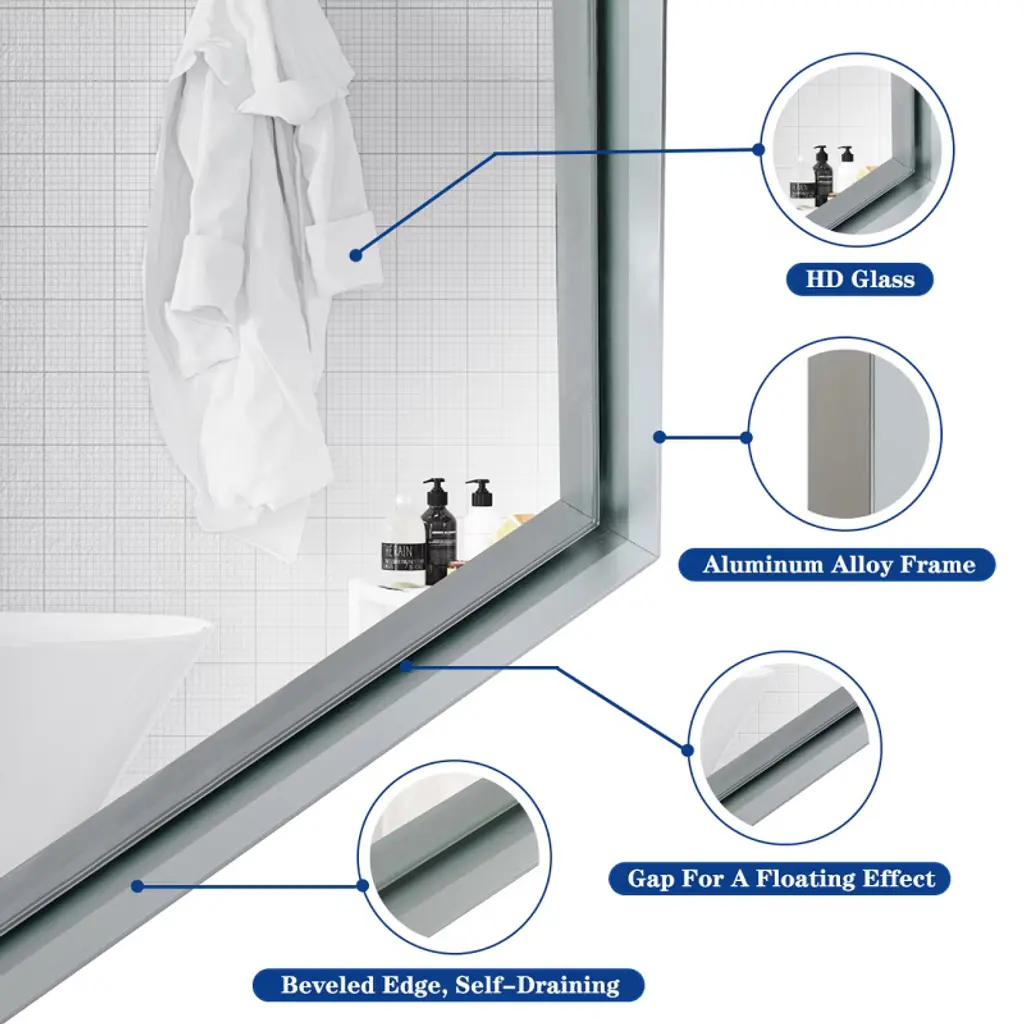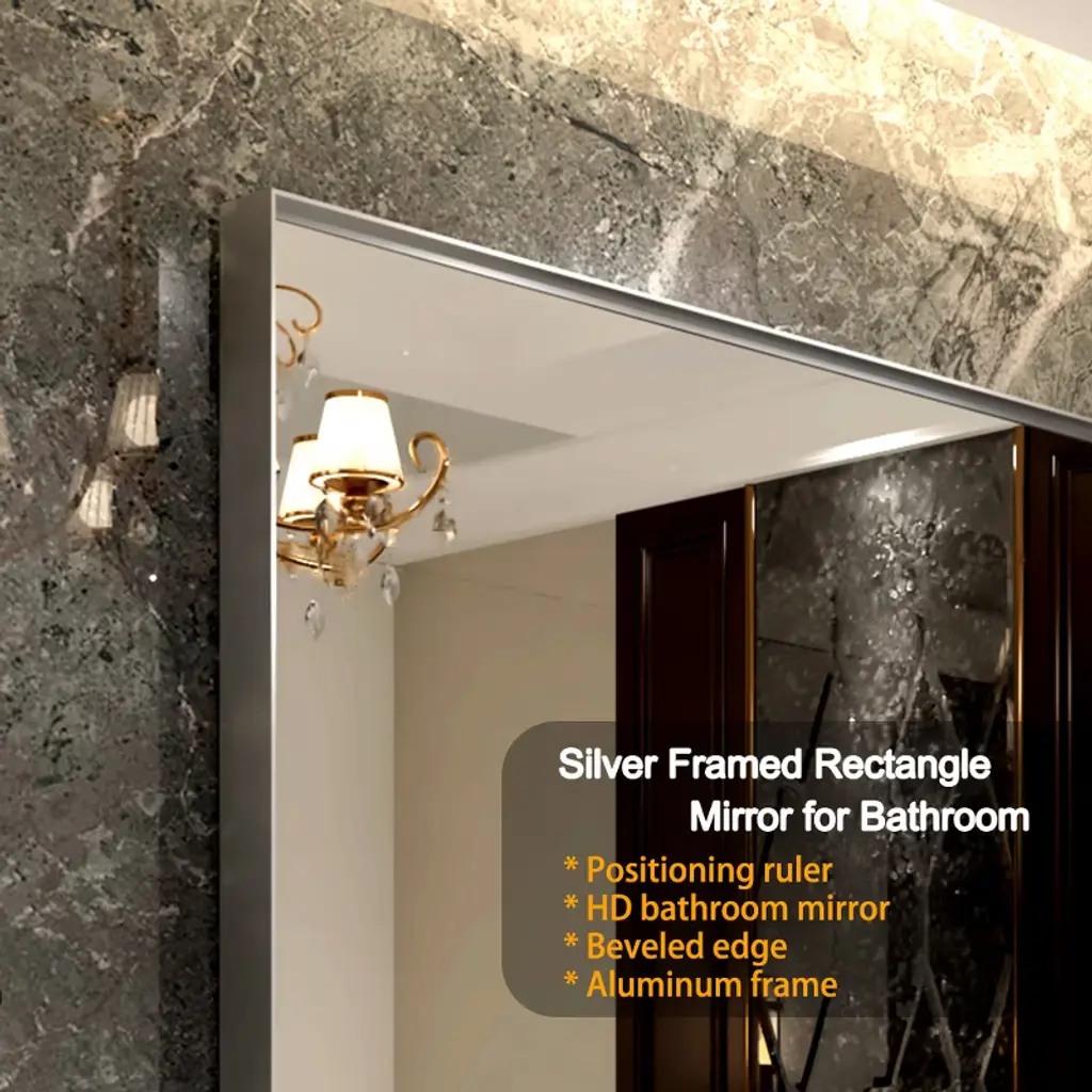 New design of beveled edge, more beautiful, automatic drainage, not hiding water stains. With a ruler, the mirror is easy to install. the stand is strong enough to support the weight of the mirror. bathroom mirrors can be hung vertically or horizontally. The bathroom vanity mirror uses a high-quality aluminum alloy frame, which is rust resistant and does not deform. Wall-mounted bathroom mirror adopts HD float glass design to ensure 1:1 reproduction of the real image, providing clear reflection without distortion.