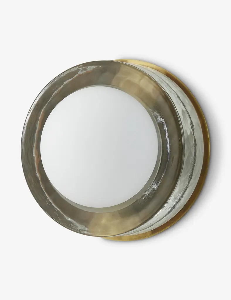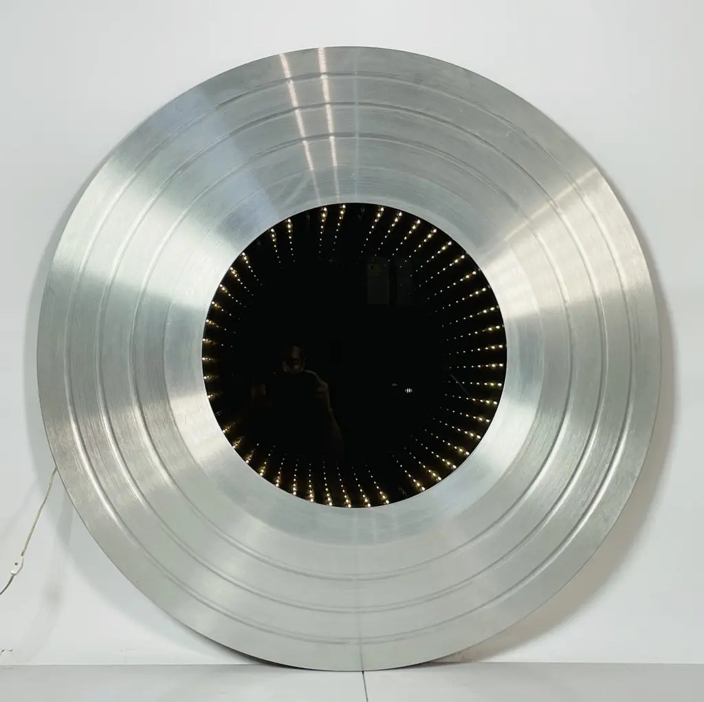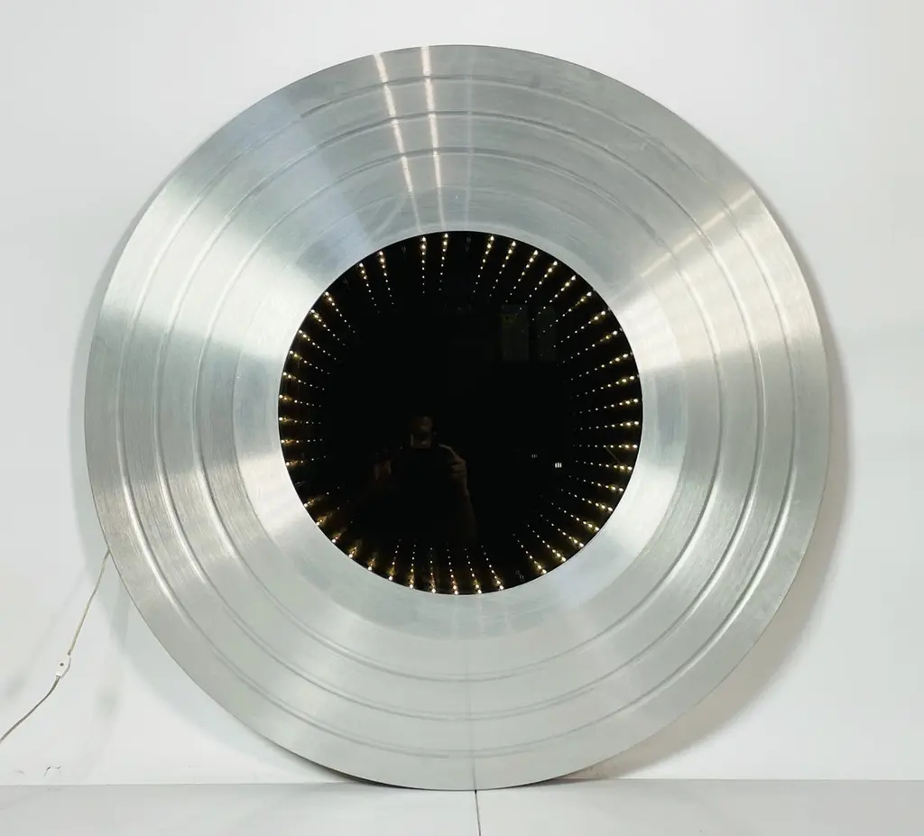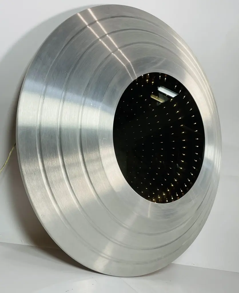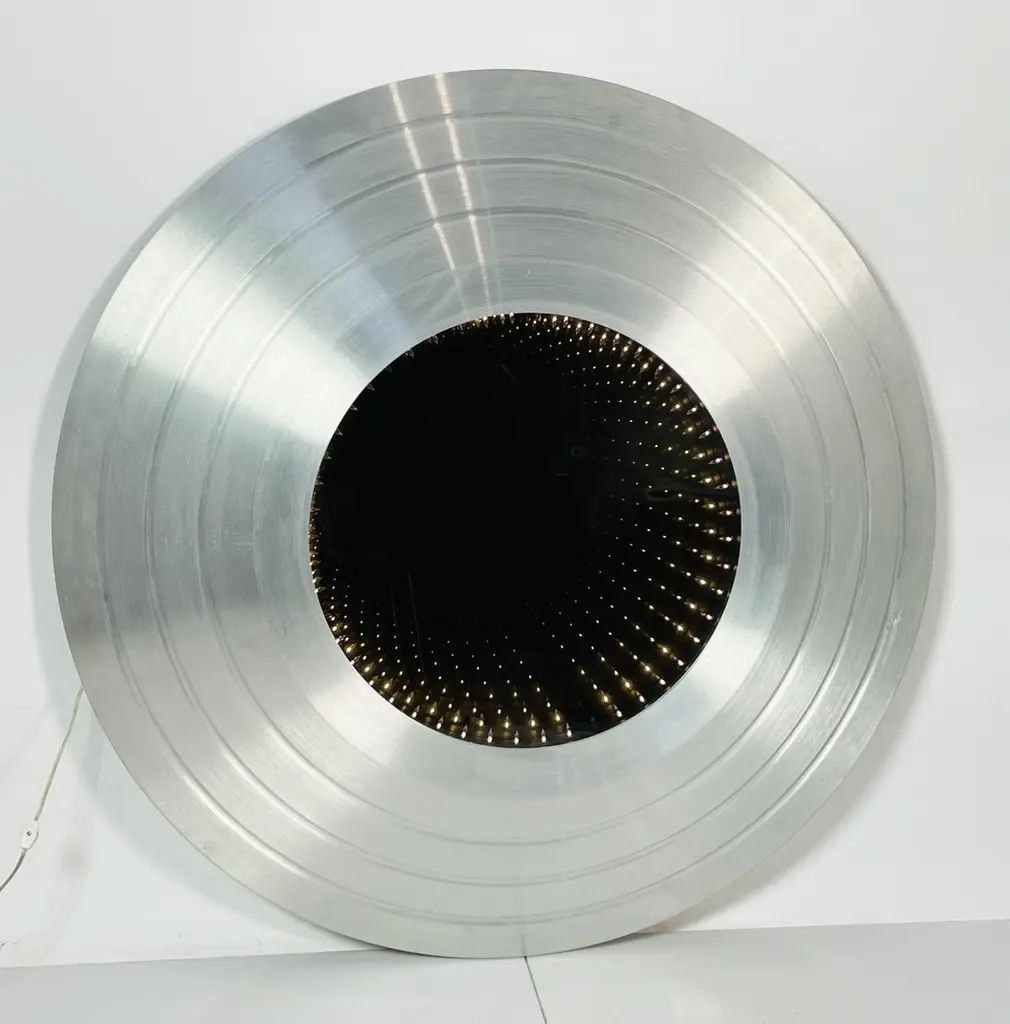 Vintage infinity mirror. The front glass is a two-way mirror behind which is a single ring of lights which itself is backed by an interior mirror. This creates the illusion of an infinite repetition of a tunnel of lights. The frame is aluminumMeasurements:45 inches in diameter x 7 inches deep/projection from wall.