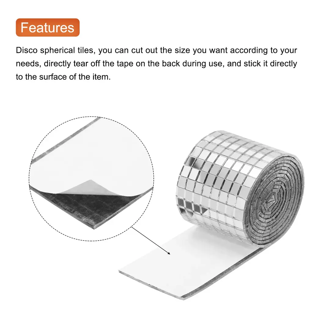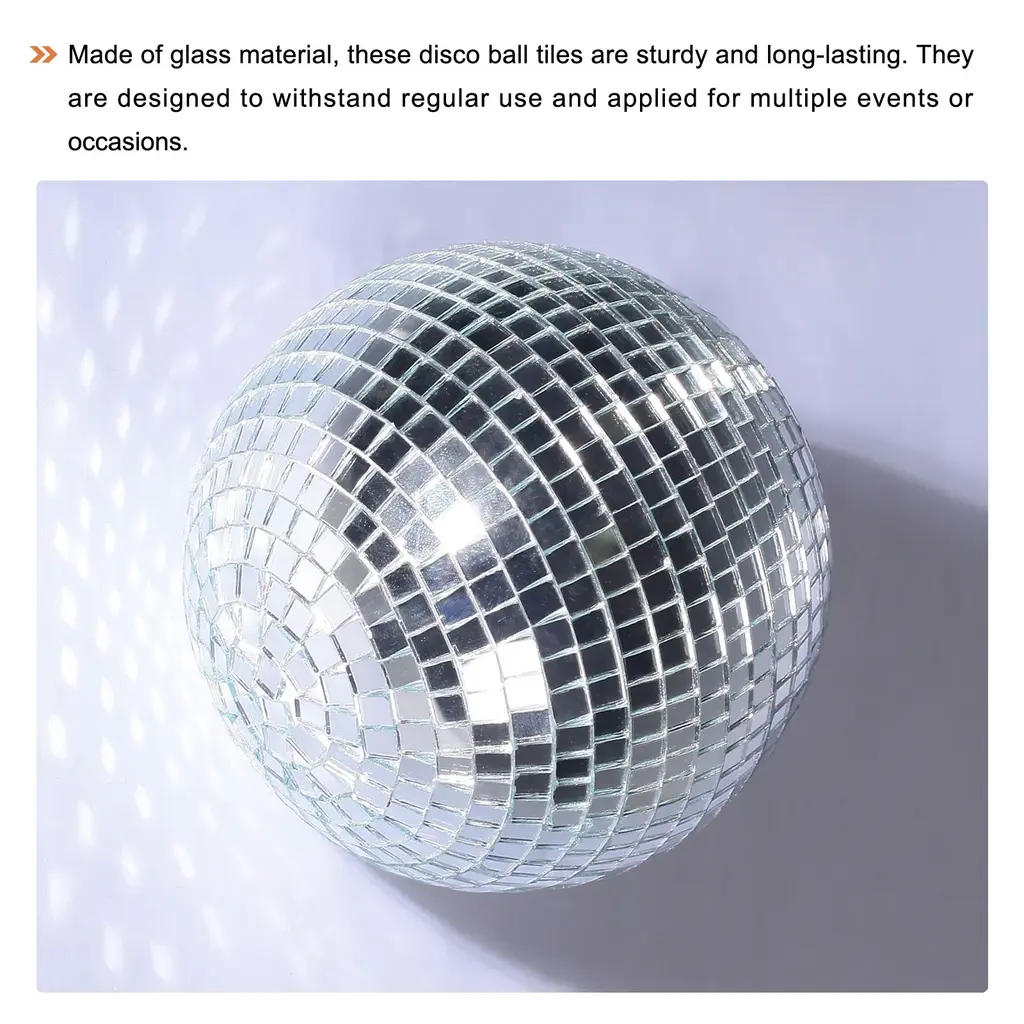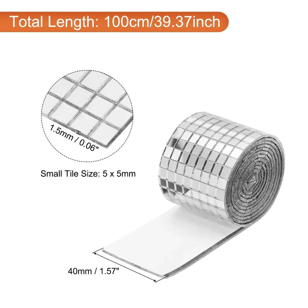 What is this?These mirror squares can be used in various applications, such as home decor, parties, weddings, clubs, 3D background walls, and stage performances.What will I get?Color: SilverMaterial: GlassSmall Tile Size: 5 x 5mm/0.2 x 0.2 inch (L*W)Total Size: 4 x 100cm/1.57 x 39.37 inch (L*W)Thickness: 1.5mm/0.06 inchIn the package of: 3 Set x Mosaic Mirror, 1600pcs small tile for 1 setAre there any advantages of the product?Made of glass material, these disco ball tiles are sturdy and long-lasting. They are designed to withstand regular use and applied for multiple events or occasions.The glass mirror surface of these tiles reflects light beautifully, creating enchanting patterns and reflection around the room.How to use it?1. Clean the surface where you want to place it and keep it dry;2. Peeling off the protective film from the self-adhesive side of each tile;3. Press each tile firmly onto the desired surface;4. Apply even pressure to ensure proper adhesion;5. Avoid touching or disturbing the mirror stickers during the time when waiting for adhesive.What should I notice?Consider grouting the gaps between tiles for a more finished and professional appearance.Please wear gloves during use to prevent cuts from edges.