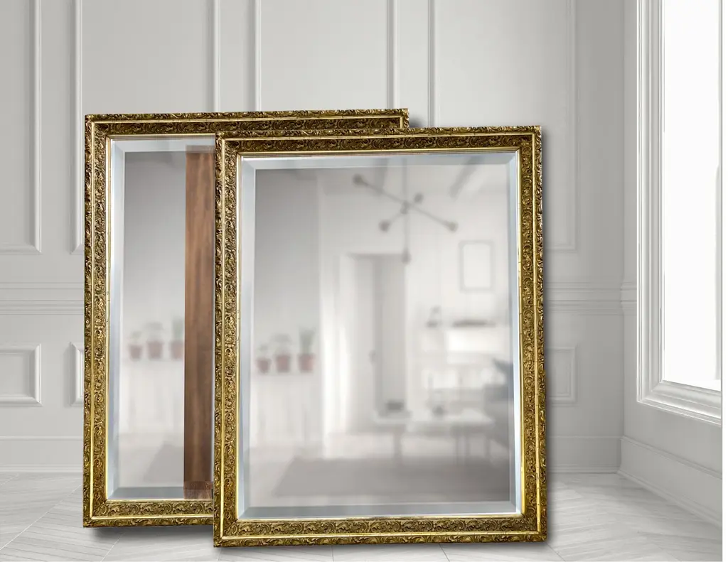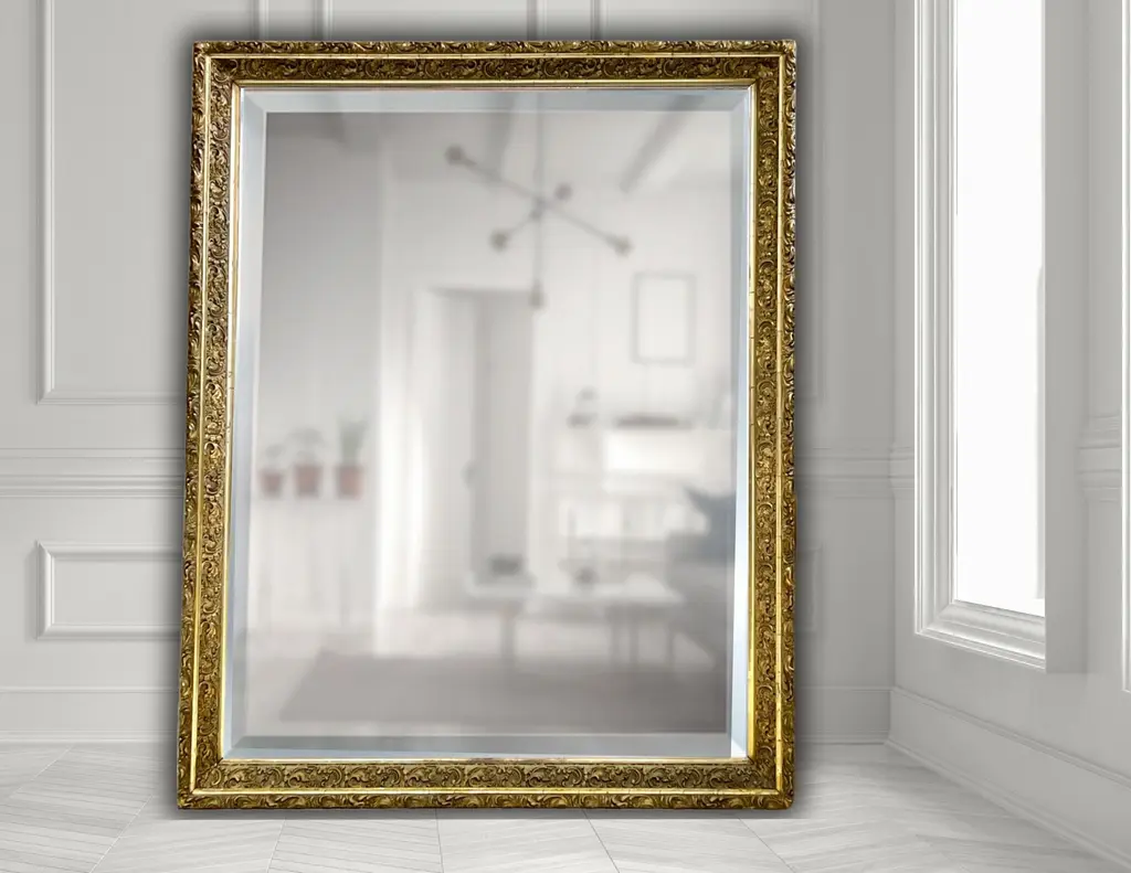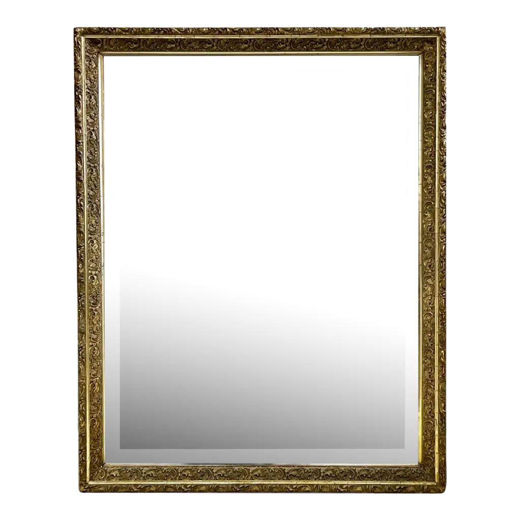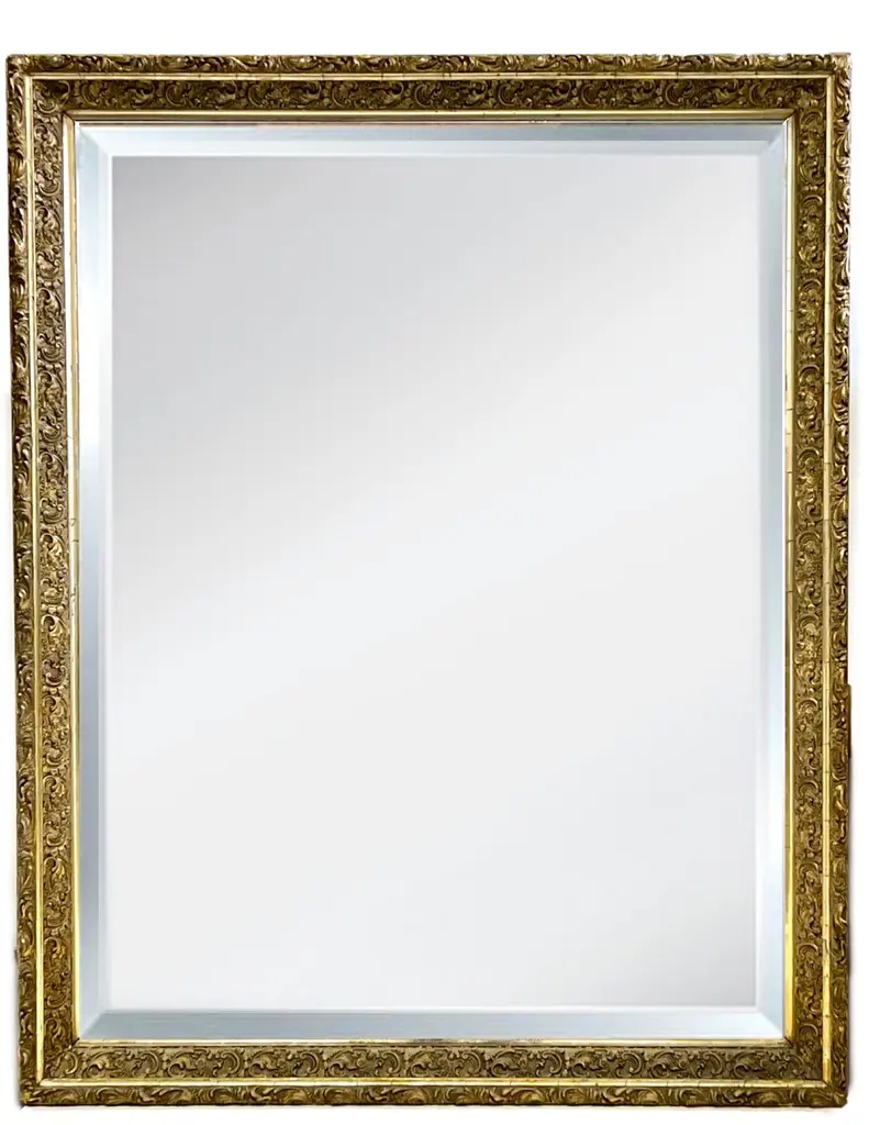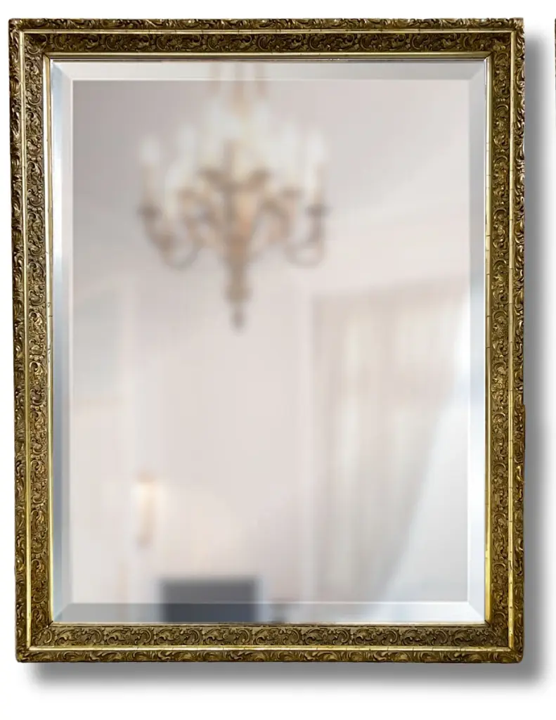 Very large, heavy antique French mirror with thick beveled edge. Please see all photos, as they depict the depth and grandeur of this beautiful antique. Because of the size, it is difficult to capture in a photograph. Originating from a large French country house in the south of France and has been lovingly cared for for over 100 years. Please note that this weighs approximately 50 lbs and measures 50.5"H x 40"W x 4.25" D. Currently 2 available if desired (price is for a single mirror).
