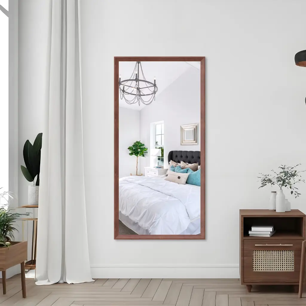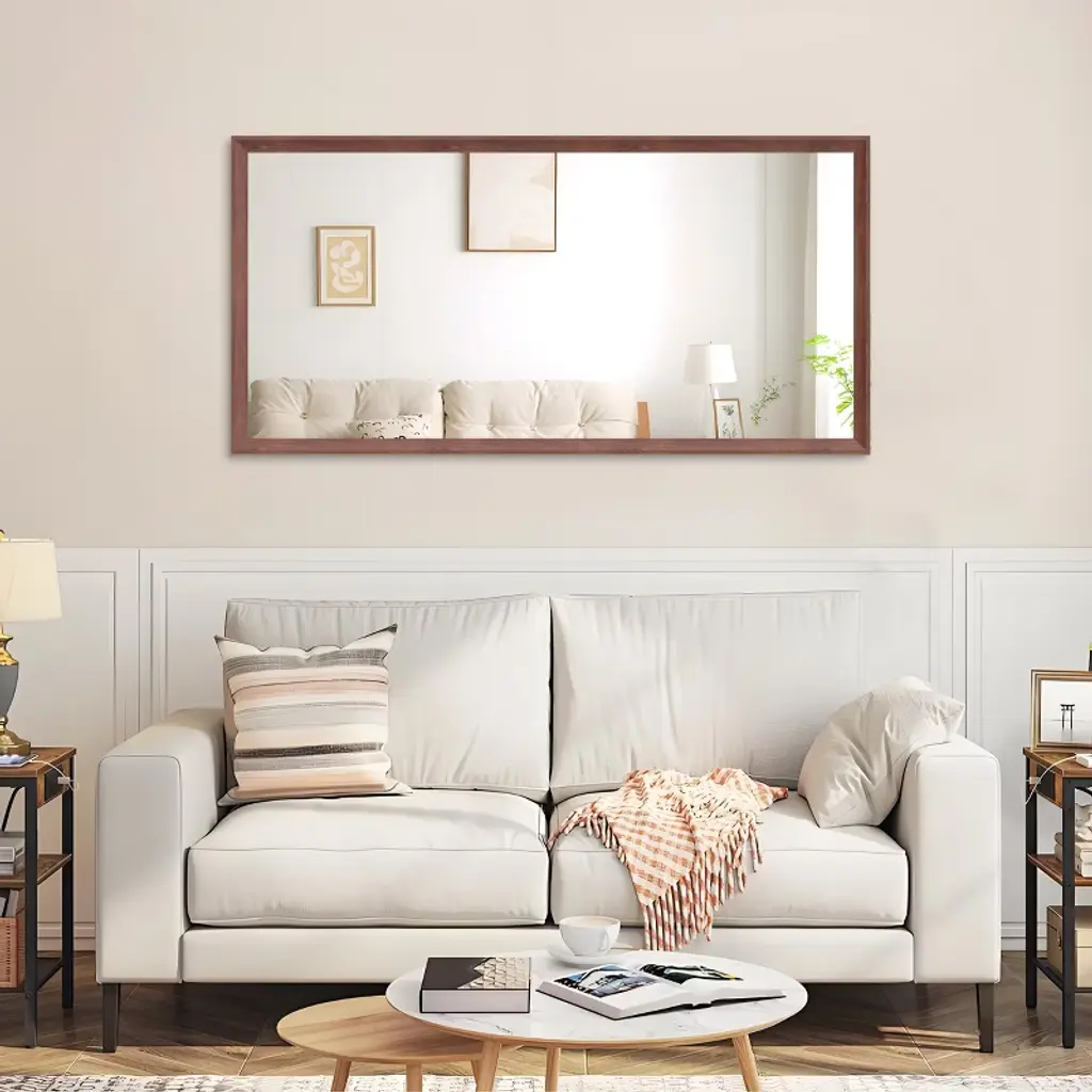 Tired of tiny mirrors? Go big! This massive rectangular mirror is your ticket to a brighter, more spacious-feeling home. Imagine seeing your full reflection clearly every morning ¨C no more hopping around! Crafted with strong, lightweight aluminum wrapped in a gorgeous walnut finish, it brings instant modern warmth to your walls. Safety's baked right in with durable tempered glass for peace of mind. Hanging it is a total breeze ¨C flip it tall or go wide, and you're set in minutes. While it's perfect as a stunning oversized bathroom mirror, its sleek style shines anywhere: light up your entryway, check your 'fit in the bedroom, add depth to the living room, or glam up your walk-in closet. Ditch the small stuff and upgrade your space with big reflection energy! ?