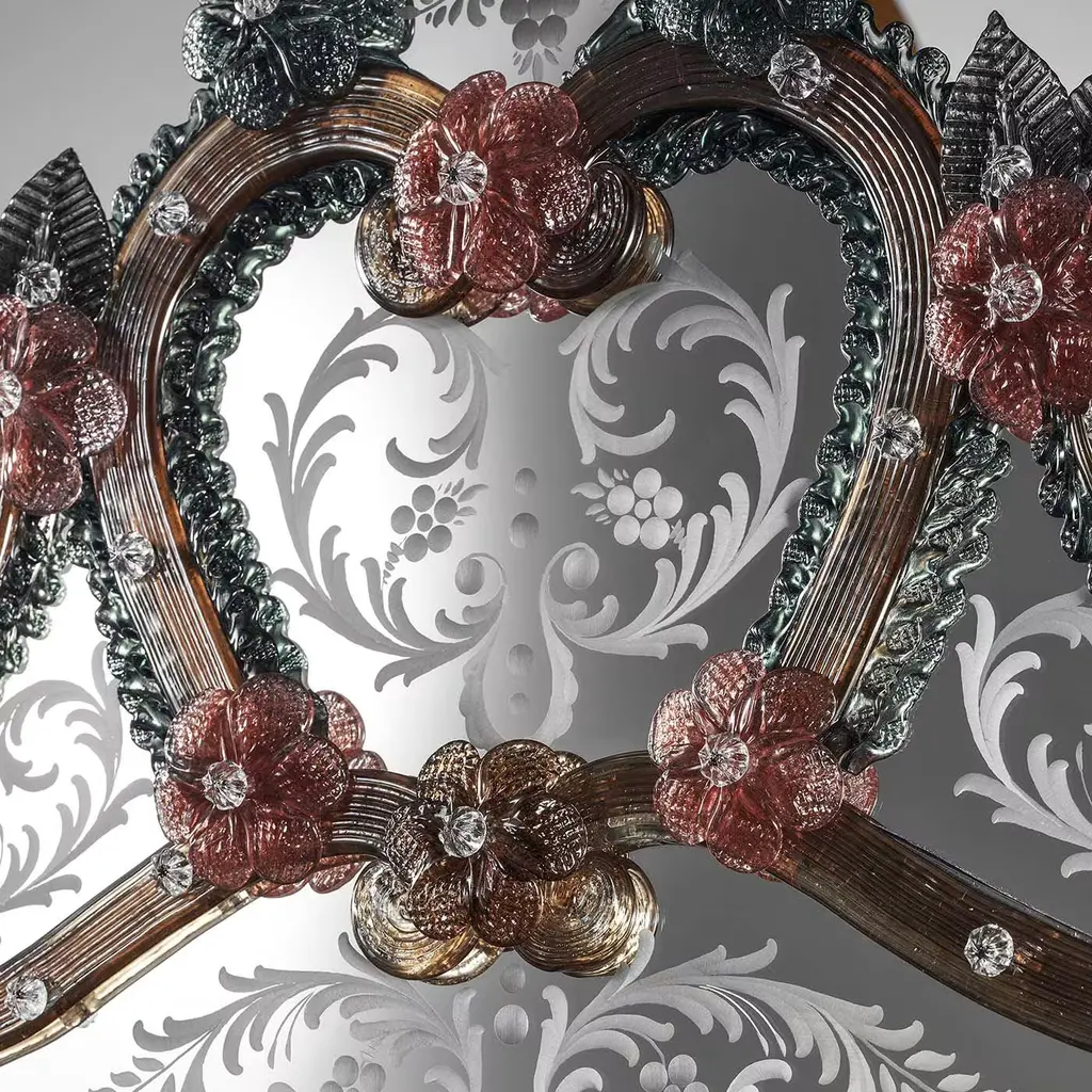 A superb celebration of the exquisite craftsmanship and tradition of mouth-blown Murano glass artifacts, this stunning mirror is a work of art that can be displayed above a mantelpiece, over a console or in a bedroom or powder room for a lavish and colorful effect. The small rectangular shape of the mirror is enclosed in an inner frame, adorned all around it with a complex series of sinuous elements etched with floral motifs. The elaborate decoration boasts green textured profiles and a series of green leaves and colorful flowers for a superb final effect.