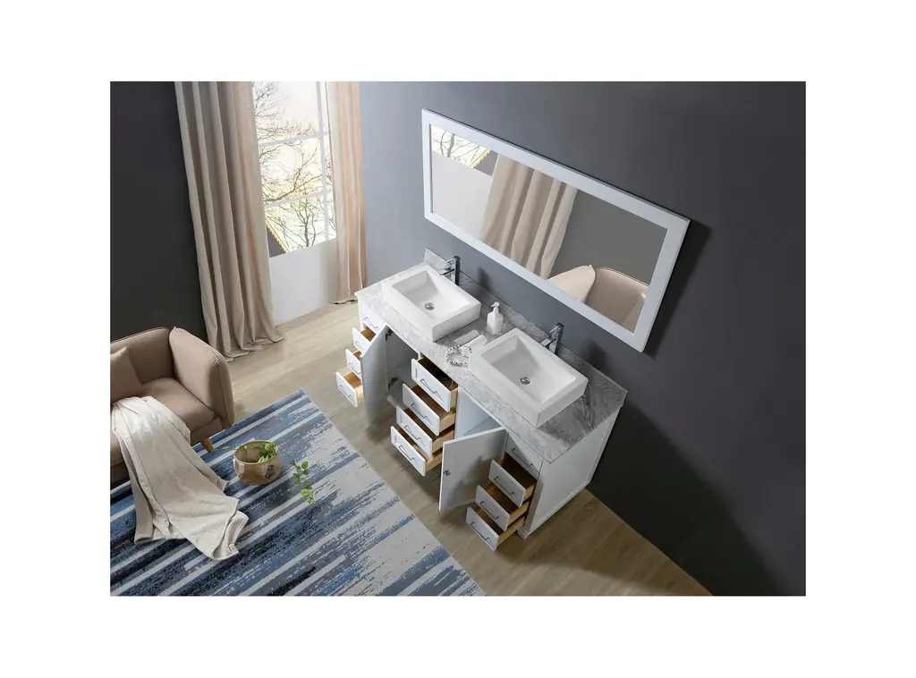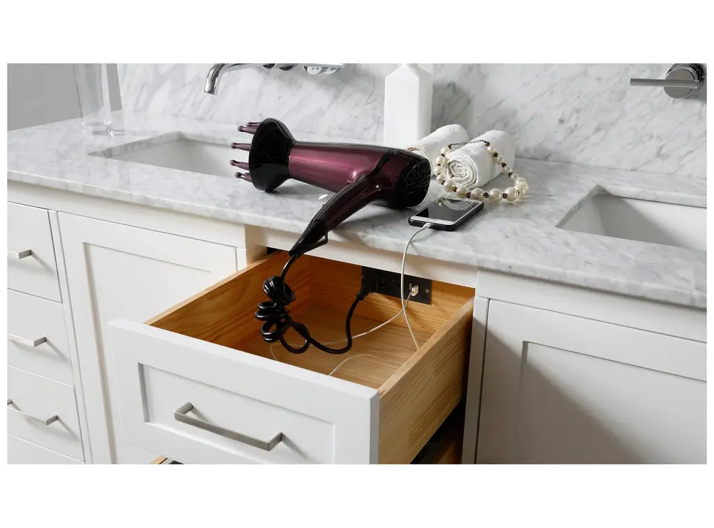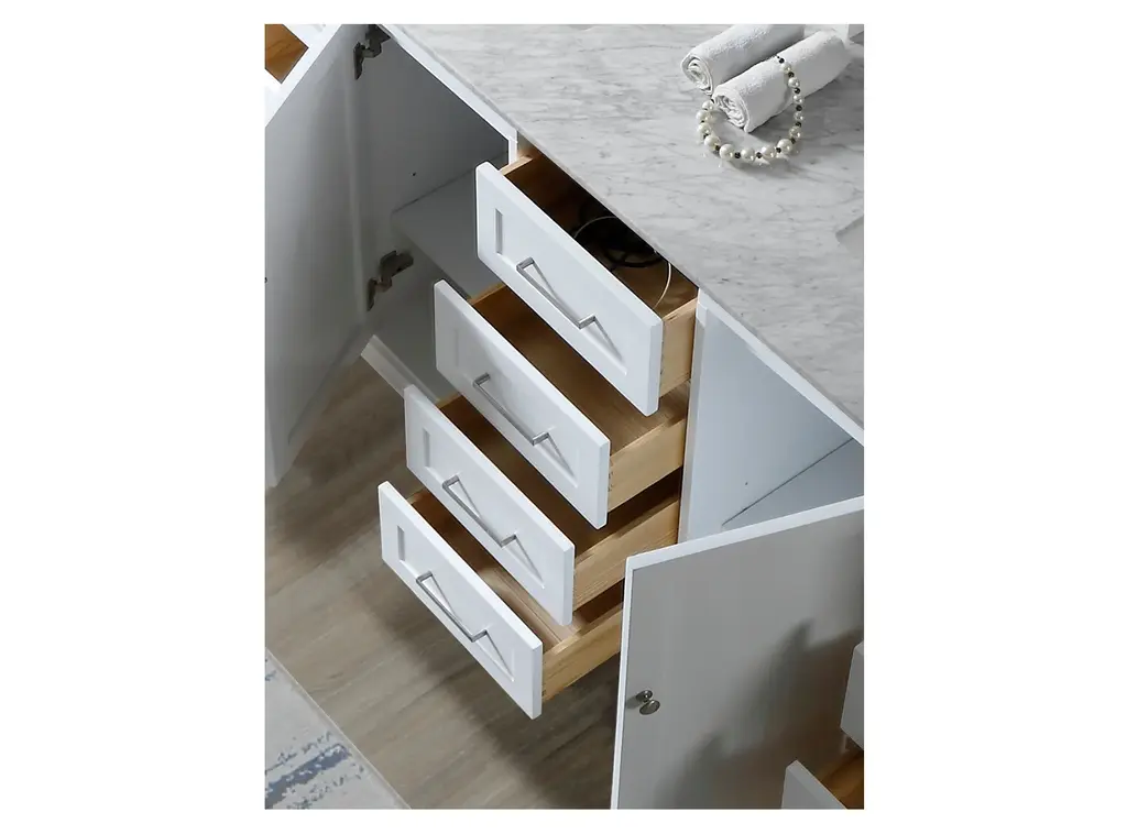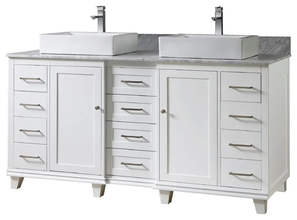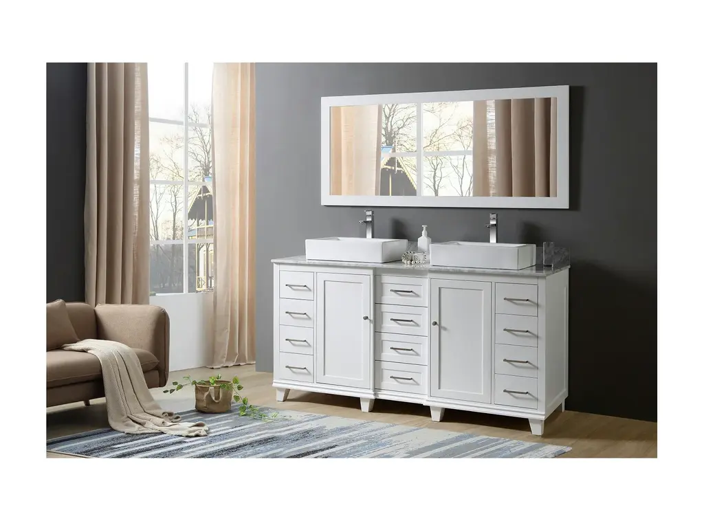 Our 72" Ultimate Classic double bathroom vanity sink and cabinet with prized Carrara white marble top is the most functional bath vanity in the market. Maximized drawer spaces completed with integrated power outlet for the hair dryer, iron, and phone charging capability. Uniquely positioned this line as the ultimate bath vanity cabinet in the market today.Finger joined panels; dove tailed joined solid wood drawer boxes on soft closing mechanismConcealed, tri-axial adjustable soft closing door hingesVanity in White; Top Is Carrara White MarbleHardware is in satin nickel finish2 Doors; 10 Drawers (1 with integrated power/USB outlet, NOT available for CA customers)Faucets, bottles and towels shown are not includedMatching back splash will be provided only as a free courtesy, we do not warrant the back splash for matching characters nor breakage or lossSet includes vanity cabinet, top, vessel sinks and 1 matching large mirrorHand crafted furniture; handmade characters existFor rough in, 34 3/4"" drain to drainEach customer can purchase up to 2 sets at 1 timeEco-conscience vendor; we plant a tree for every vanity sold to Earth Day Network Canopy Project to offset the wood used for making your furnitureTop pre-sealed against water but needs to be sealed again for regular use during installationCabinet treated for humidity resistance; but not designed to be in the same room with steam shower