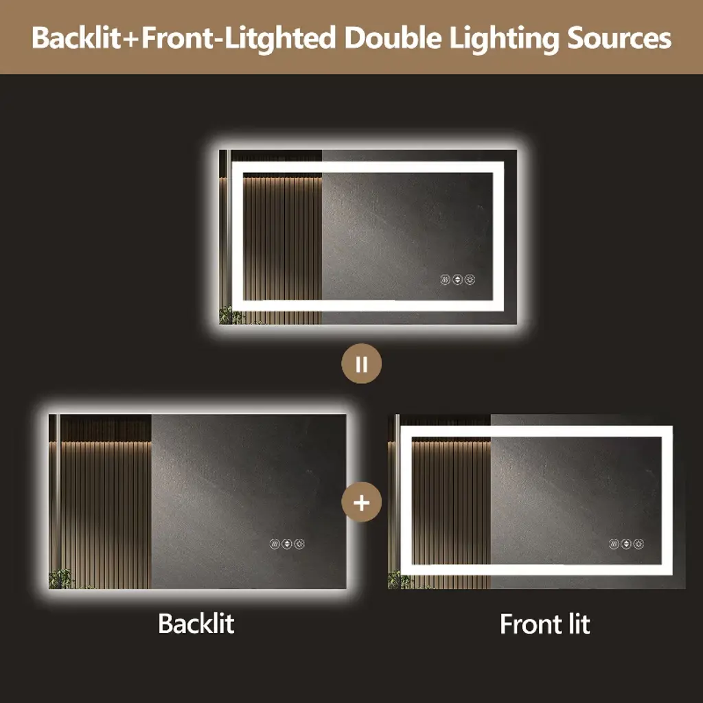[Dimmable]: Long-press the power button to adjust brightness from 10% to 100%. Short-press the color temperature button to select 3000K warm white, 4500K neutral white, or 6000K daylight.[Unique Design]: Integrated mirror power switch and anti-fog button. The built-in anti-fog function eliminates the need for constant de-misting sprays. Anti-fog mode automatically shuts off after 1 hour for energy efficiency and safety.[Wall Switch Compatibility]: The wall switch can directly control the light and anti-fog functions. When power is restored via the wall switch after shutdown, the mirror resumes its last-used settings.[Safe & Durable]: UL-certified components with protective casing. LED lifespan: 50,000+ hours (45+ years at 3 hours daily use). Copper-free silver mirror with far lower corrosion rates than standard mirrors. Features 5mm tempered glass for shatterproof, explosion-resistant, and long-lasting safety.[Easy Installation & Packaging]: Improved packaging minimizes transport damage. Passed rigorous tests including drop, impact, high-voltage, and insulation tests. Includes mounting screws for effortless installation.