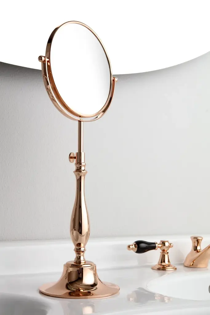 Double mirror (normal + magnifying) adjustable from 45 to 60 cm.Classic style tilting mirrors of various shapes (oval, square or folding). Large choice of metal finishing (chrome, nickel, copper, gold, bronze,…) matt or glossy. Small and large sizes with or without frame. Backlit led available.