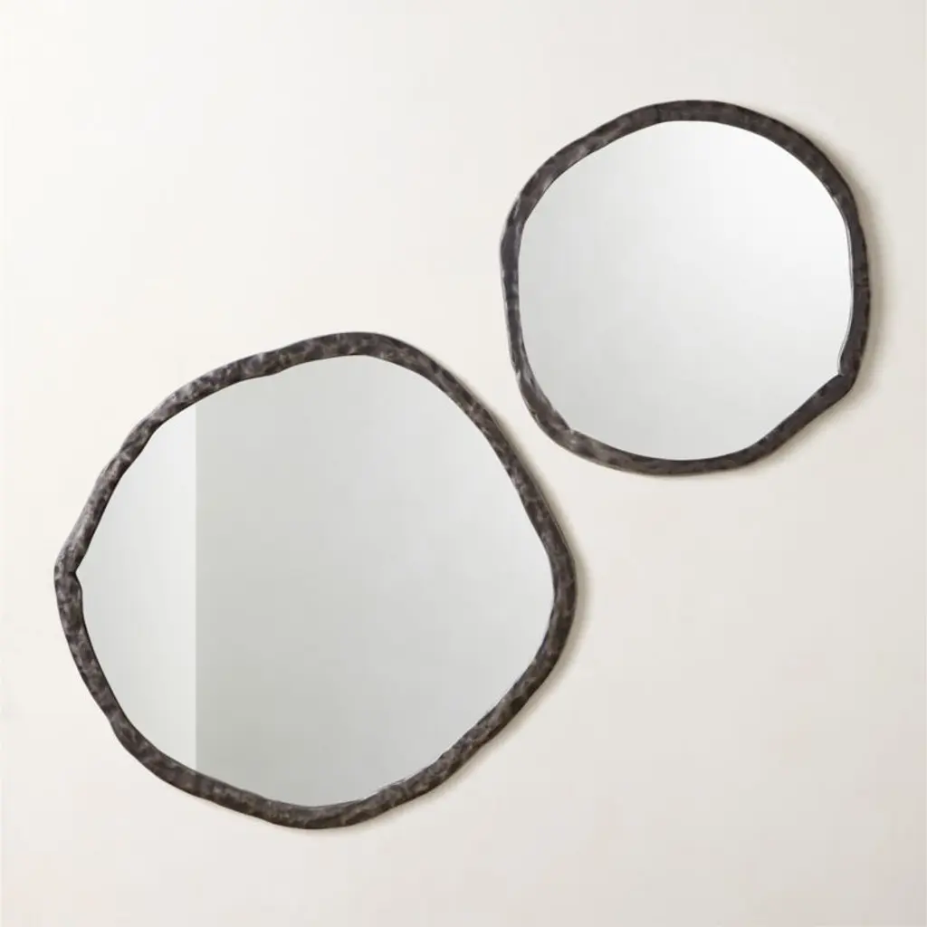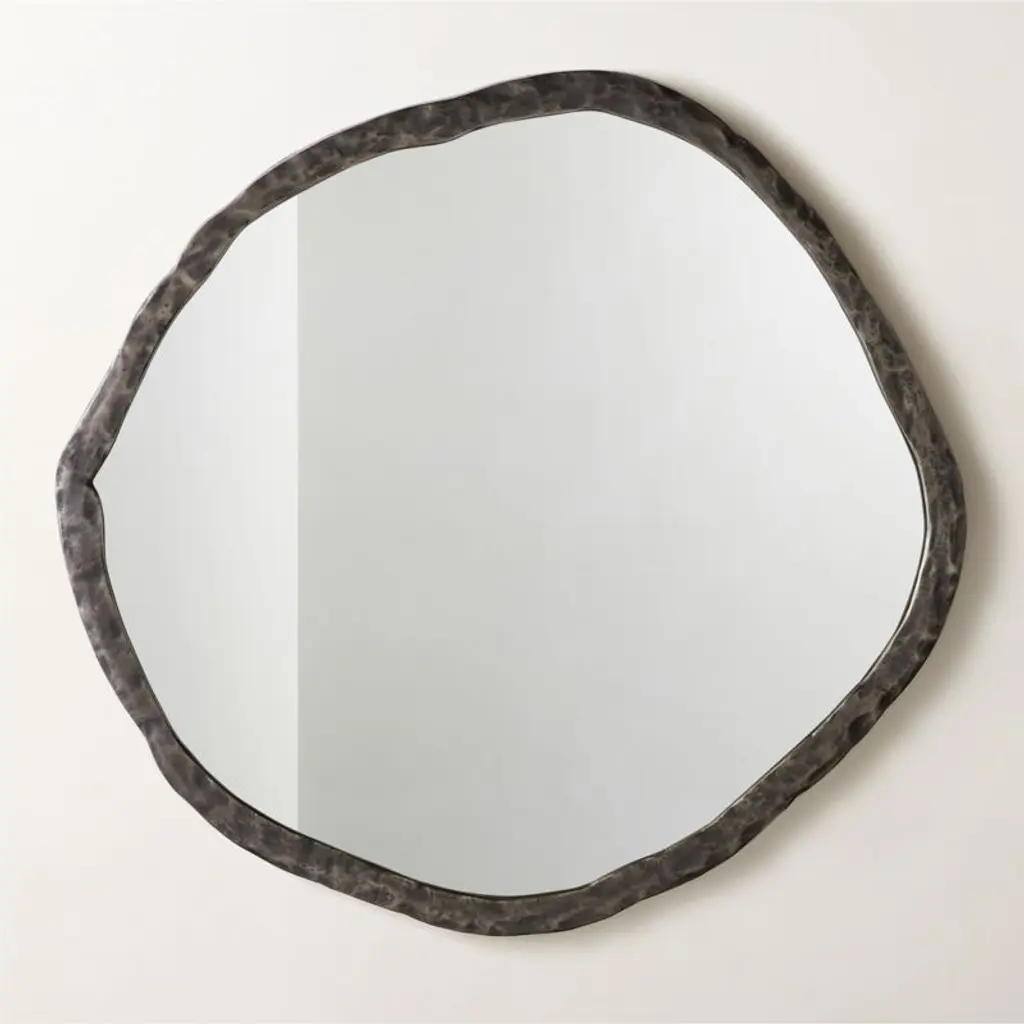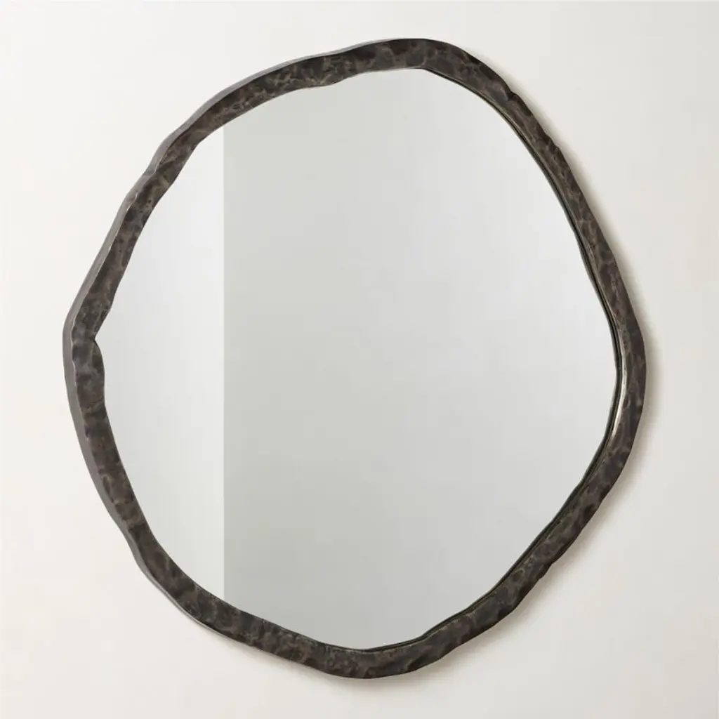 Handmade oversized mirror has a sculptural look with a distressed black finish that nods to vintage designs. The organic shape of the rough cast aluminum frame is an elegant way to add textural interest to the entryway or bedroom. CB2 exclusive.