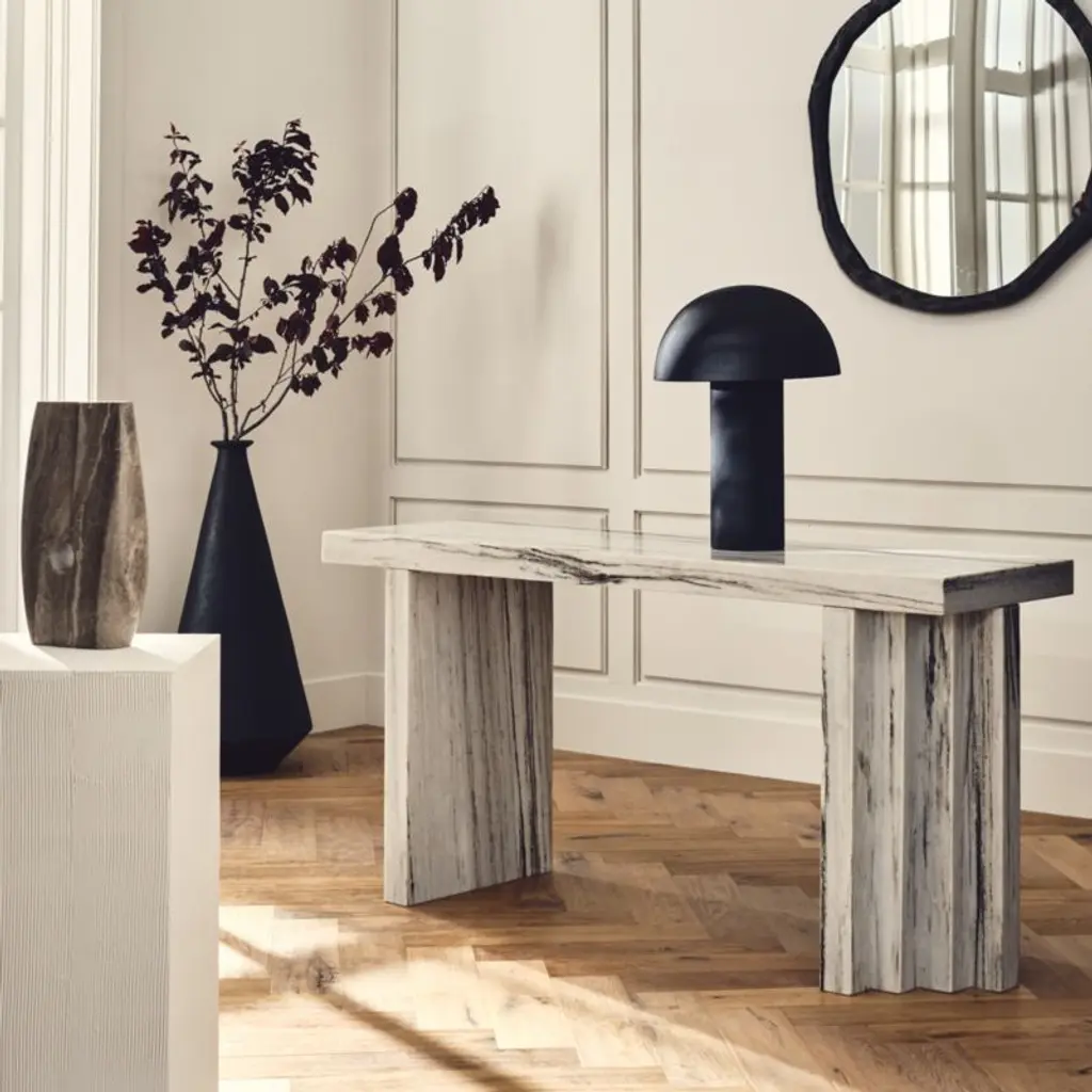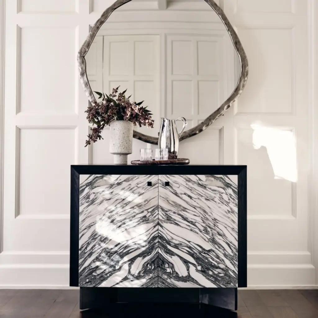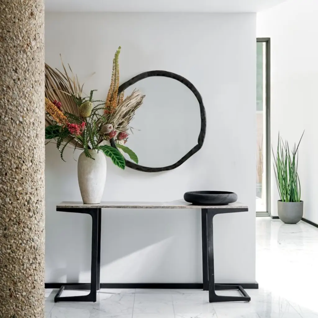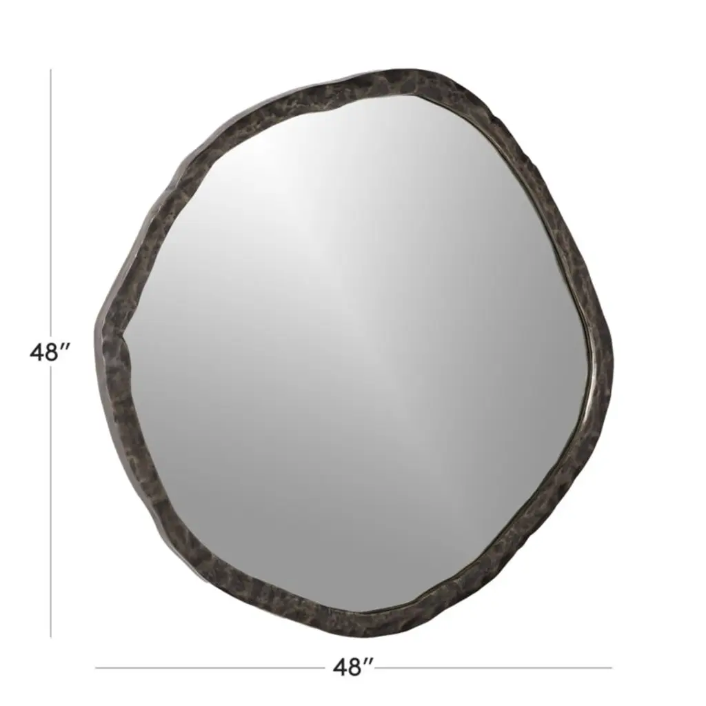 Handmade oversized mirror has a sculptural look with a distressed black finish that nods to vintage designs. The organic shape of the rough cast aluminum frame is an elegant way to add textural interest to the entryway or bedroom. CB2 exclusive.