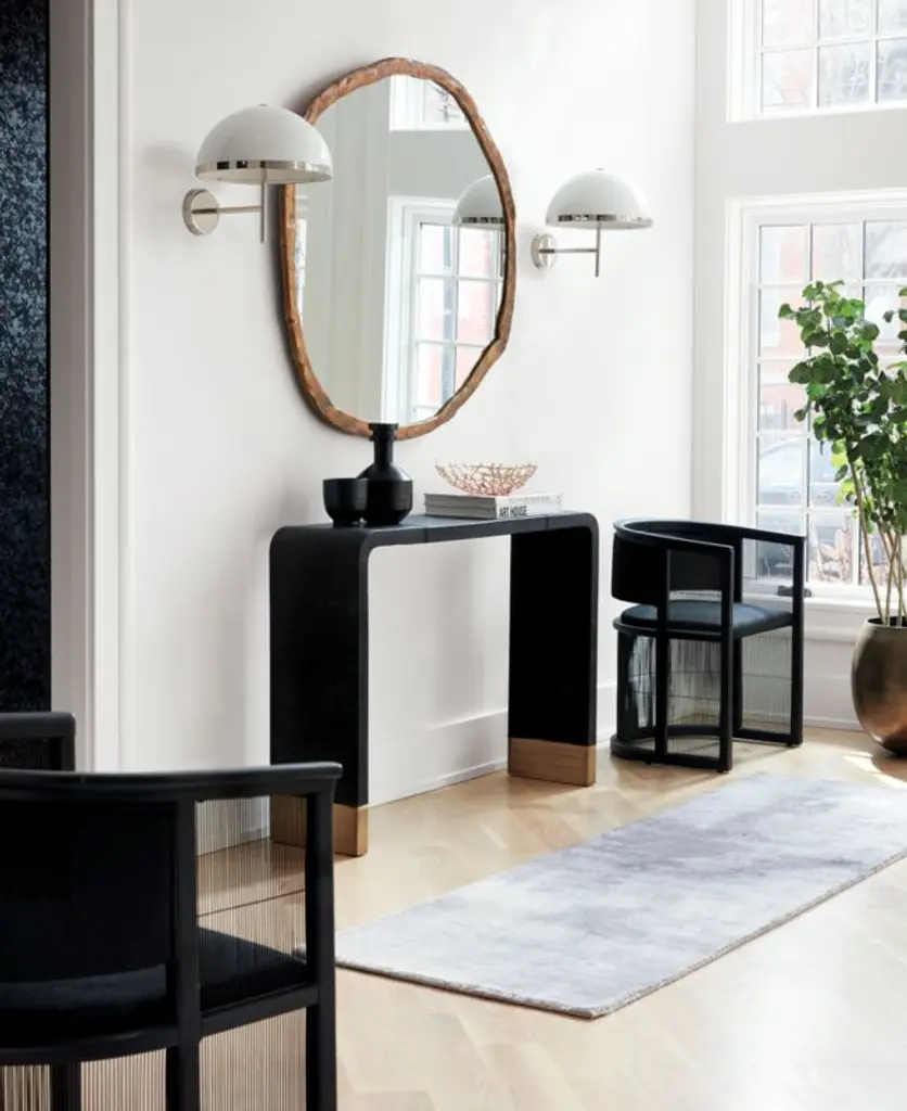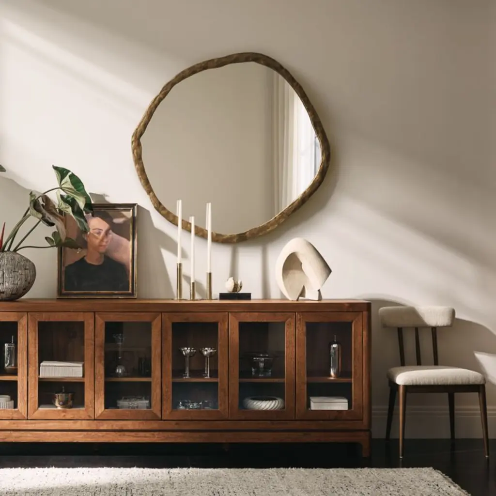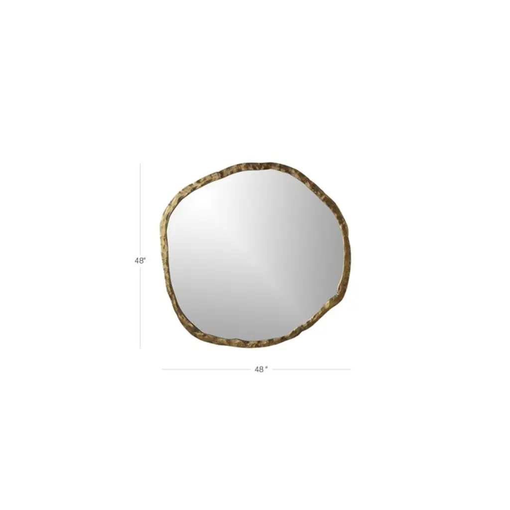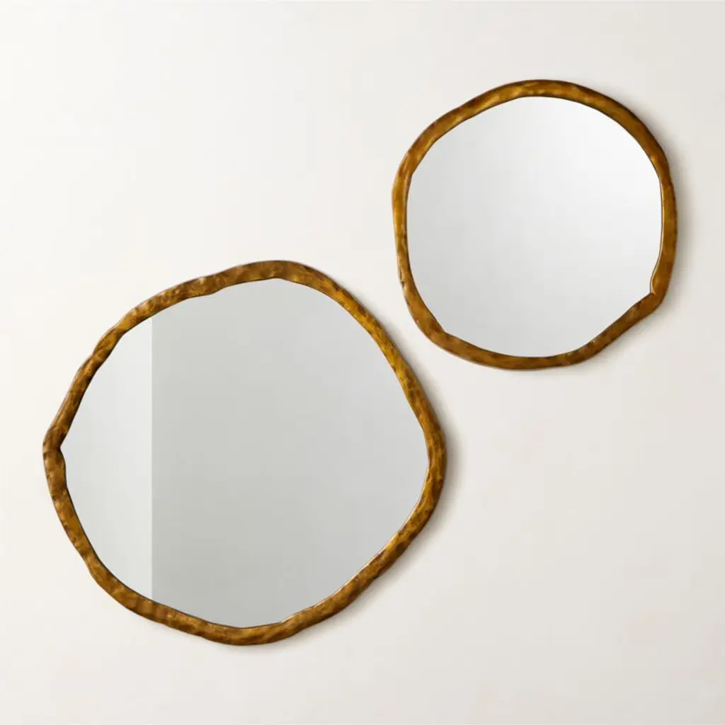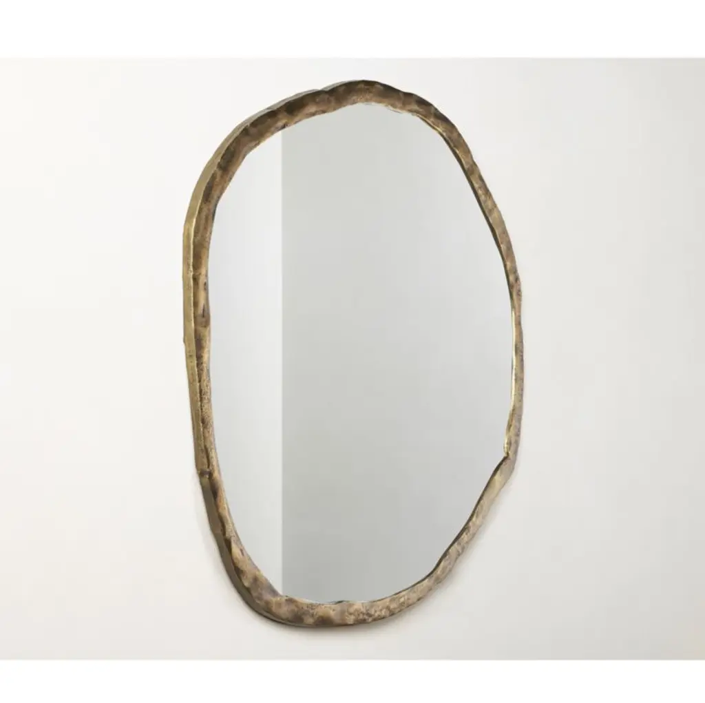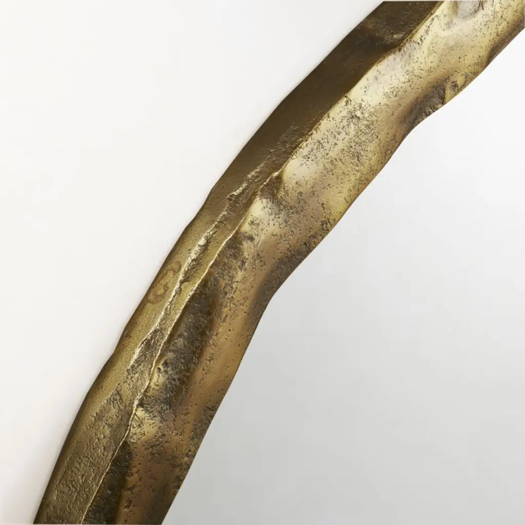 Handmade oversized mirror has a sculptural look with a brass finish that nods to vintage designs. The organic shape of the rough cast aluminum frame is an elegant way to add textural interest to the entryway or bedroom. CB2 exclusive.